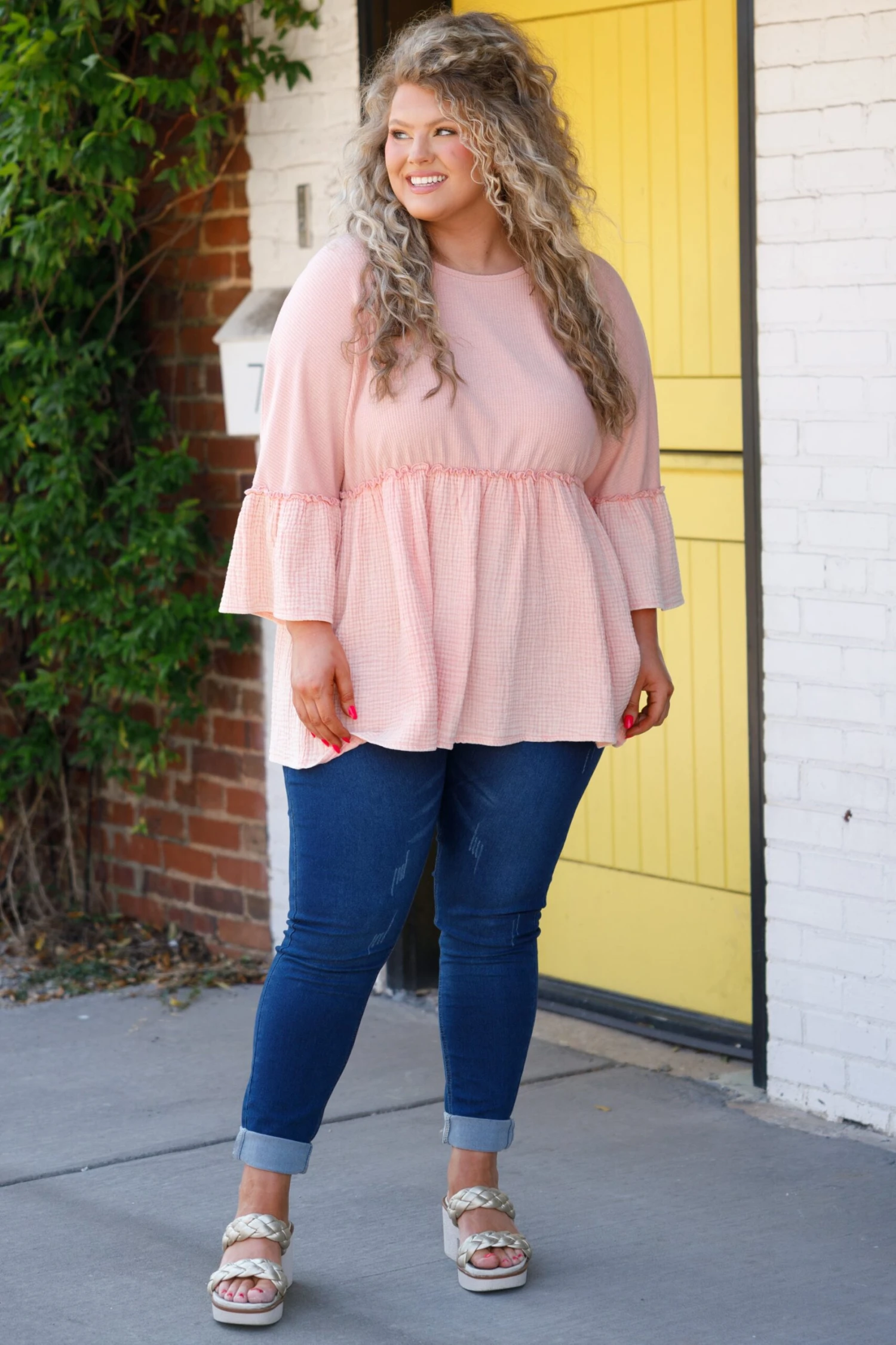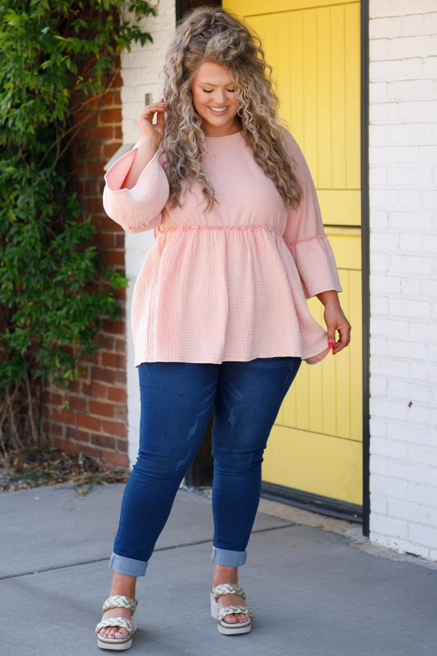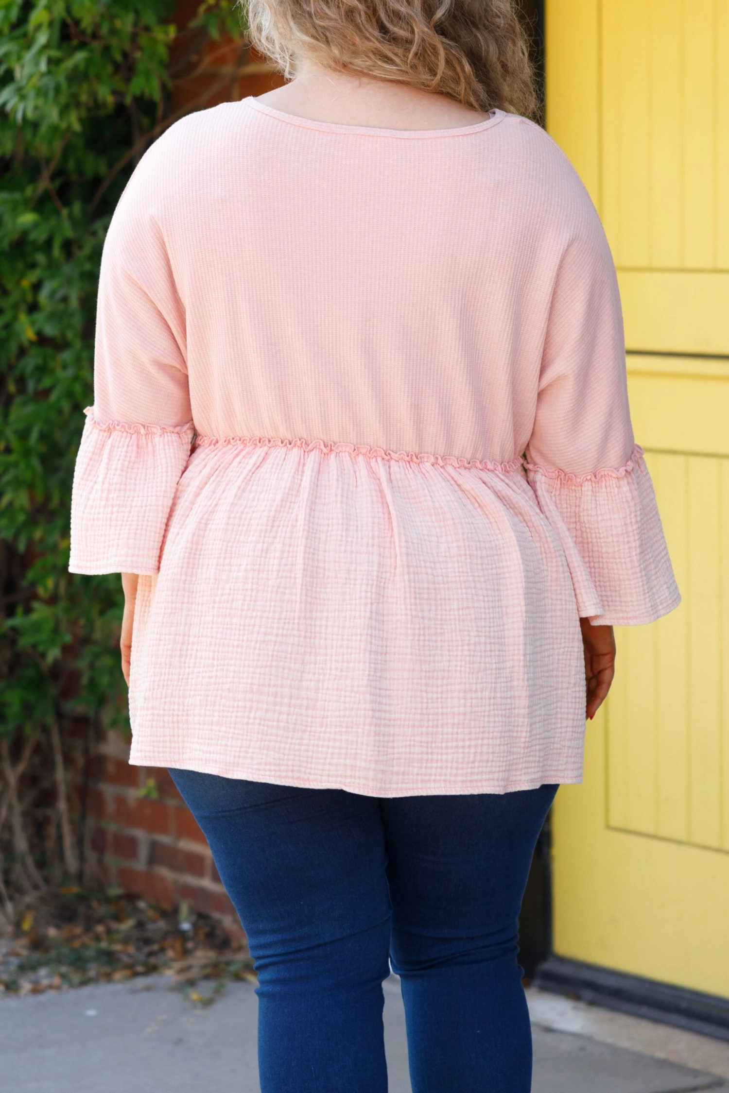 Look no farther than this FAB top to add a feminine touch to your wardrobe! The babydoll silhouette, textured fabric, and bell sleeve style combine to create a beautiful design in a charming apricot color! A timeless addition to any wardrobe!