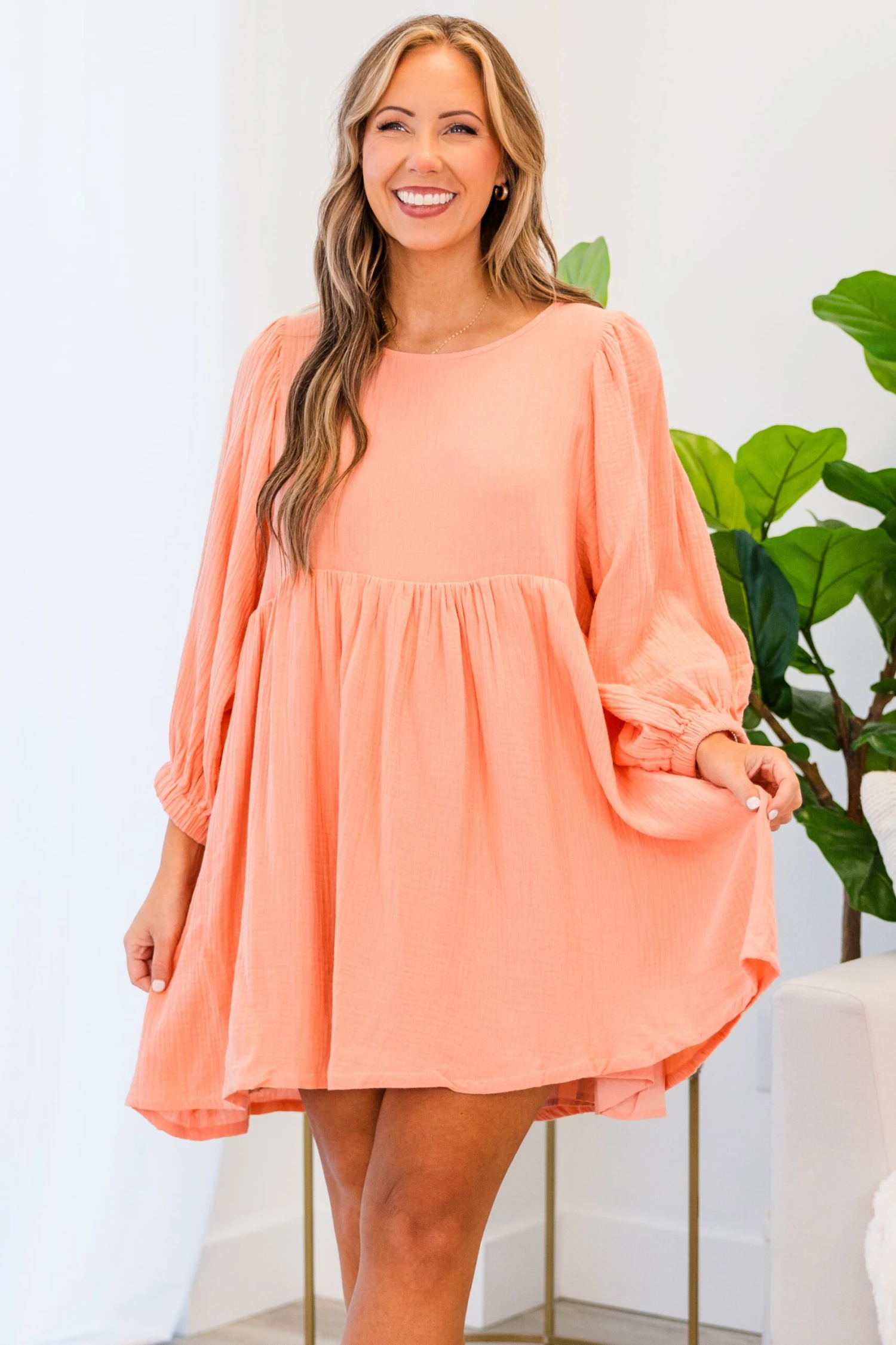 Experience ultimate comfort and style with our A Little Getaway Dress in coral! Made from soft gauze material and featuring elastic sleeves, our lined babydoll style dress is perfect for any occasion! Stay cool and chic in this must-have piece!
