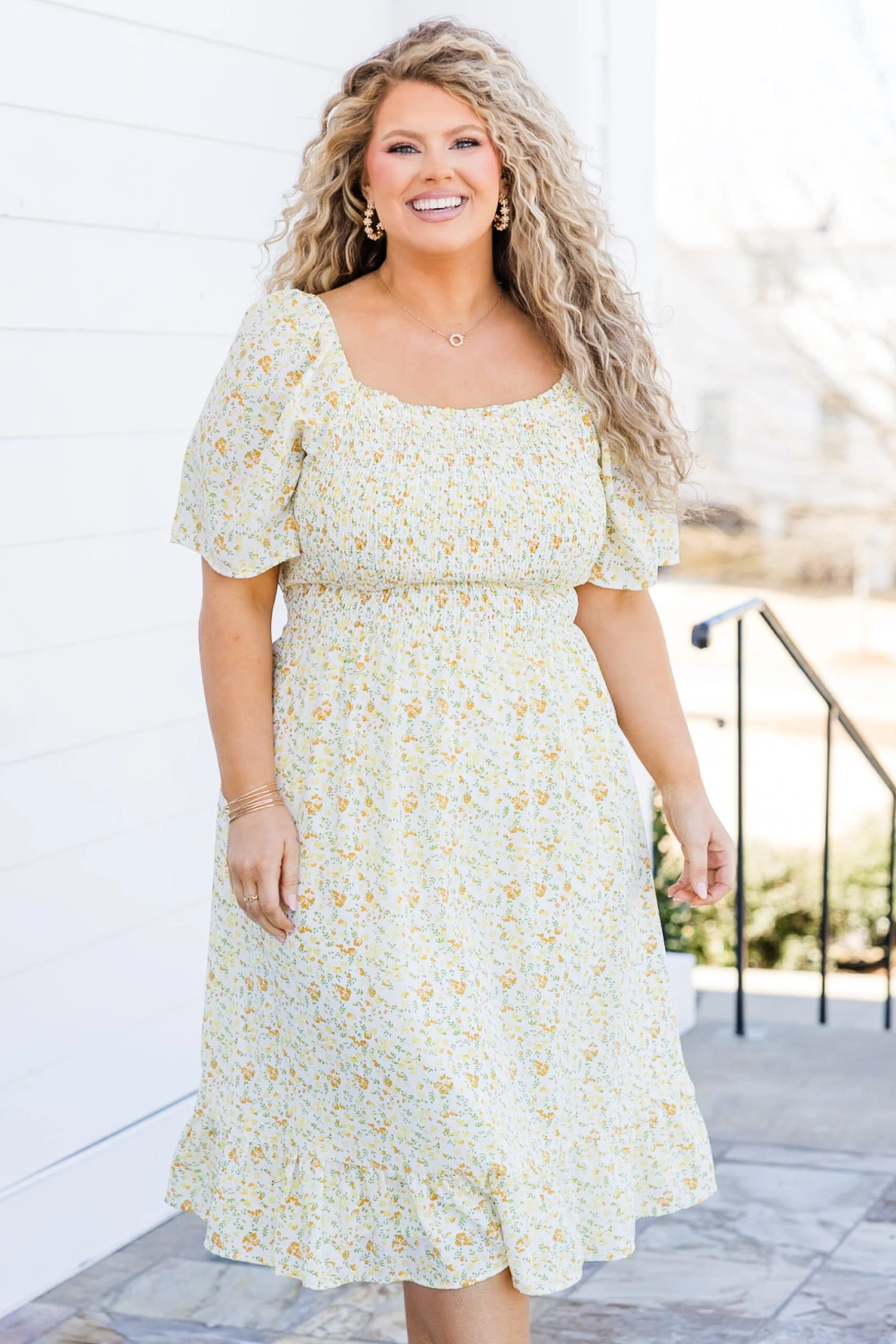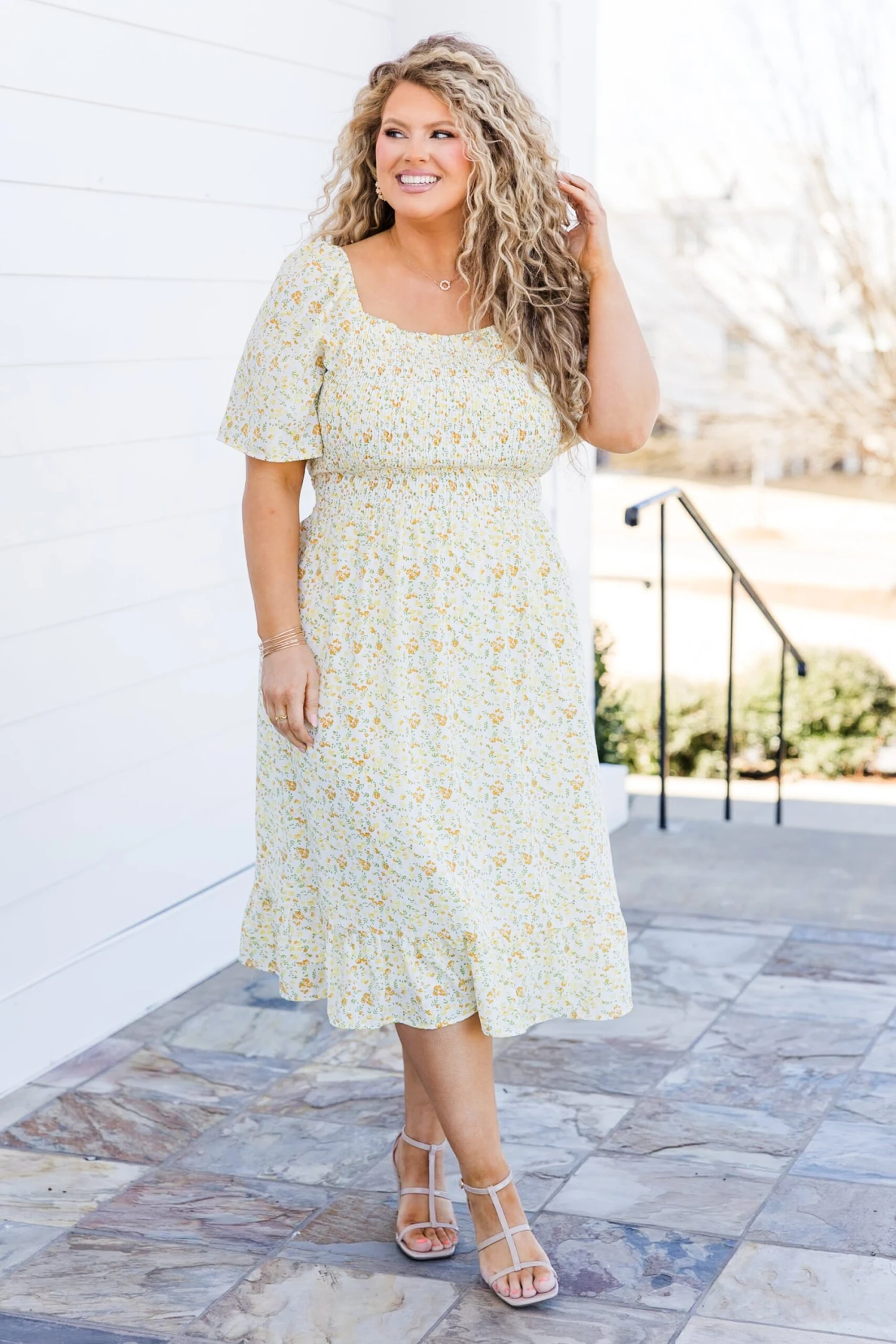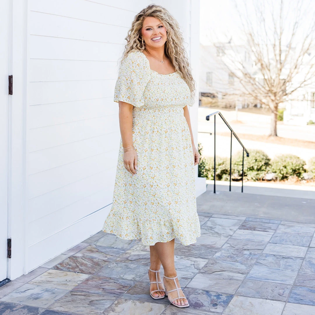 Spend some time in the sun wearing this beauty! This dress features a smocked bodice and waist tie for a flattering fit! The lovely yellow color and delicate floral pattern add a touch of flair to this perfect midi-length dress! Stay stylish and comfortable with this must-have addition to your wardrobe!