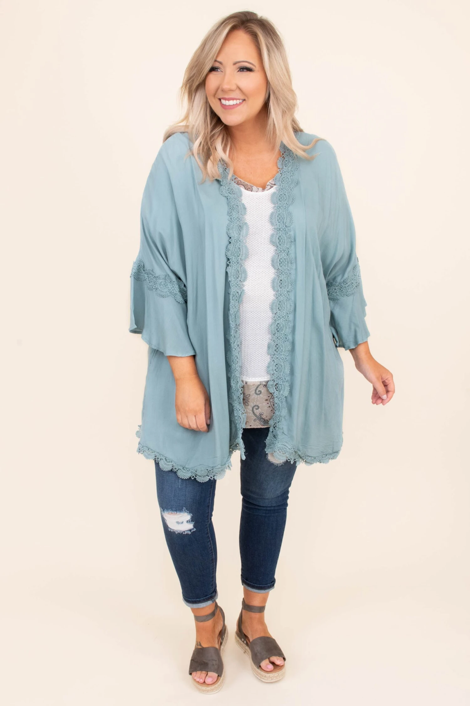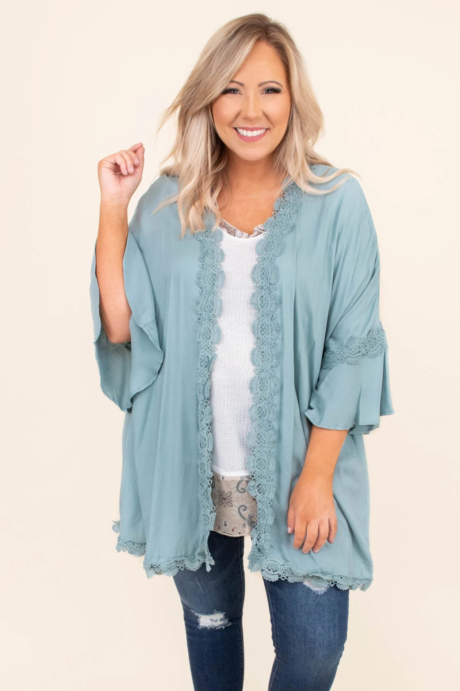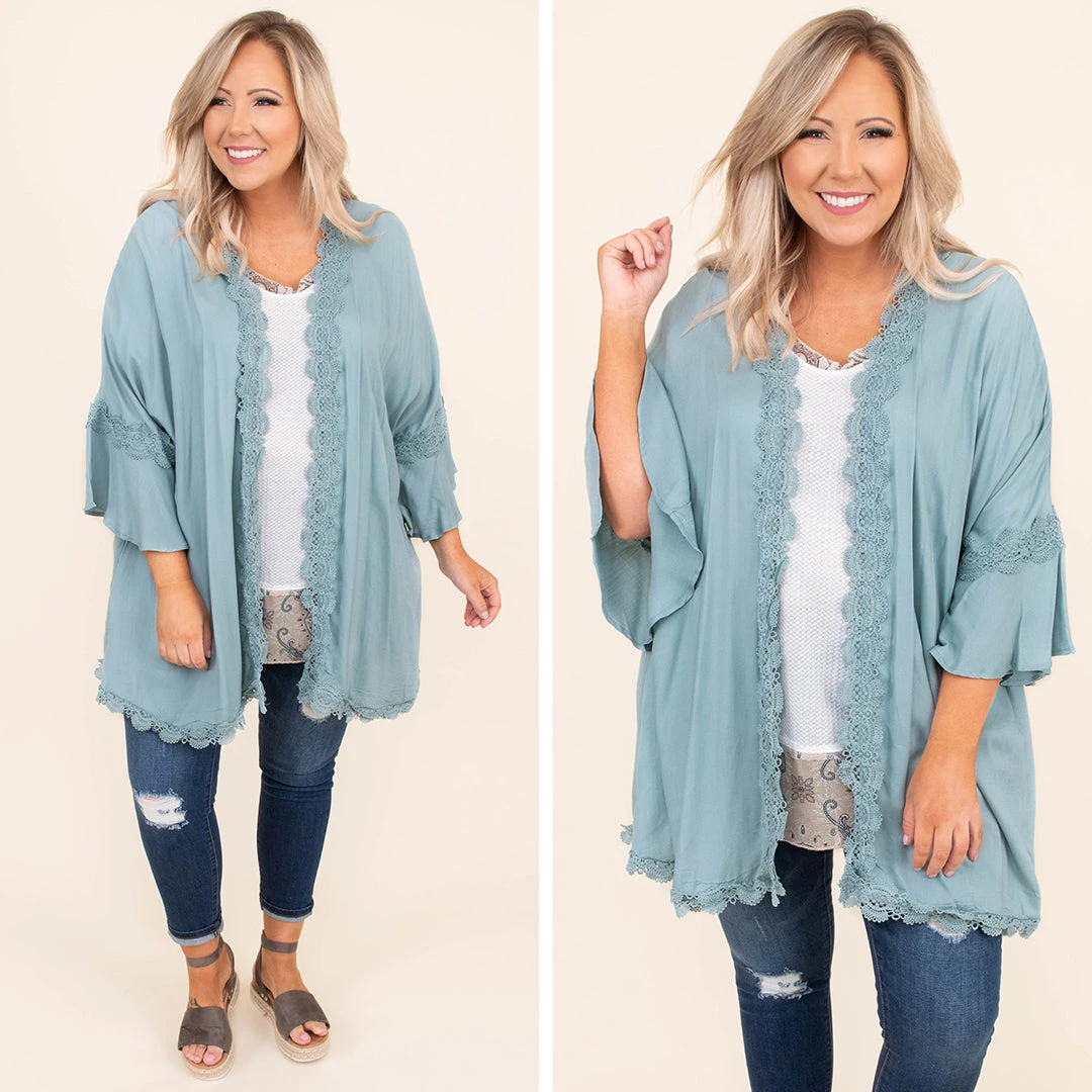 This kimono was made for a romantic evening! It has a solid color that’s perfect for the season! It’s comfortable for all day wear, has an oversized fit, and features the cutest lace trim! Style this kimono with a solid top and skinnies for an effortlessly chic look!Â