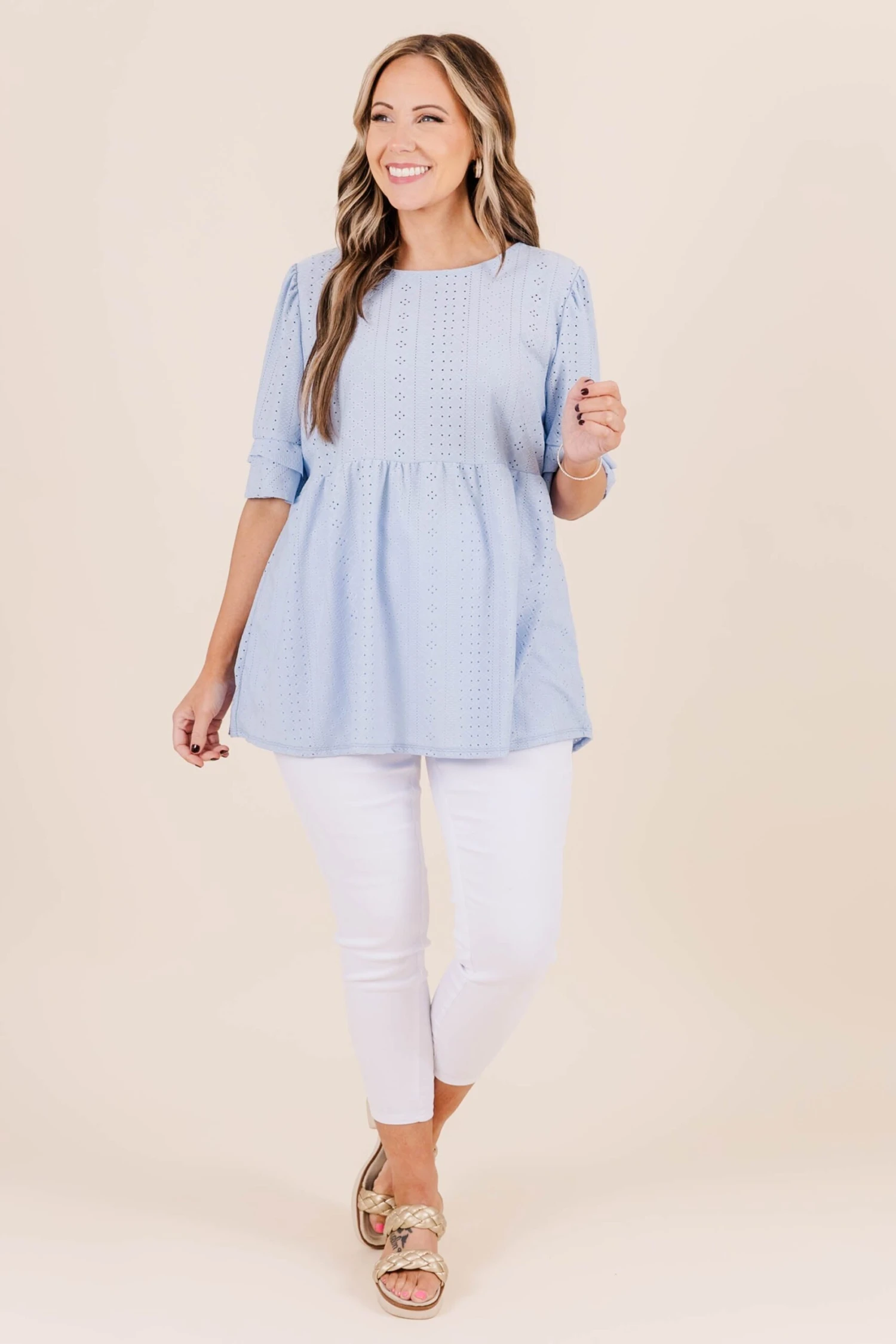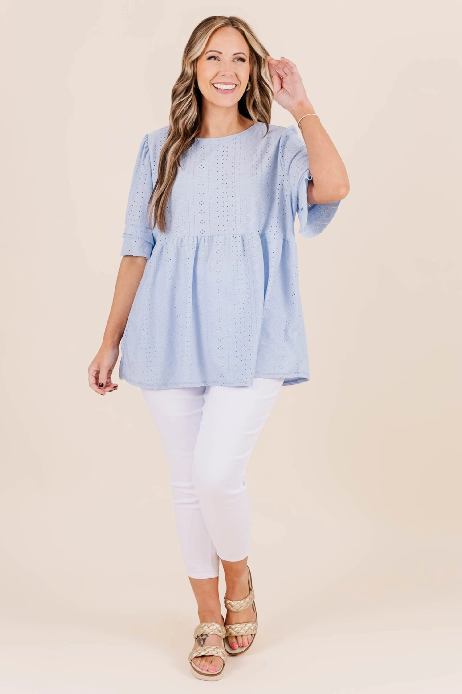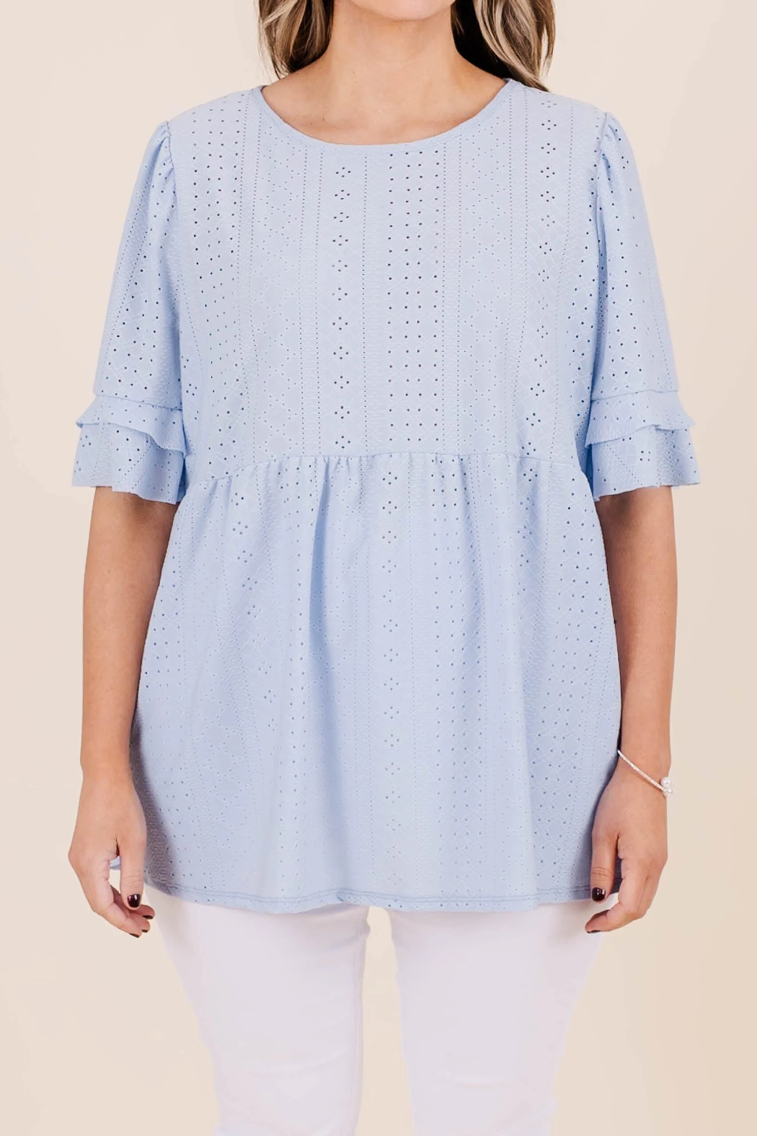 Achieve greatness while wearing this beauty! It boasts an eyelet design and stretchy fabric perfect for all-day wear! Its charming ruffle sleeves and elegant babydoll style effortlessly elevate your look, while the pretty blue color adds a touch of sophistication!