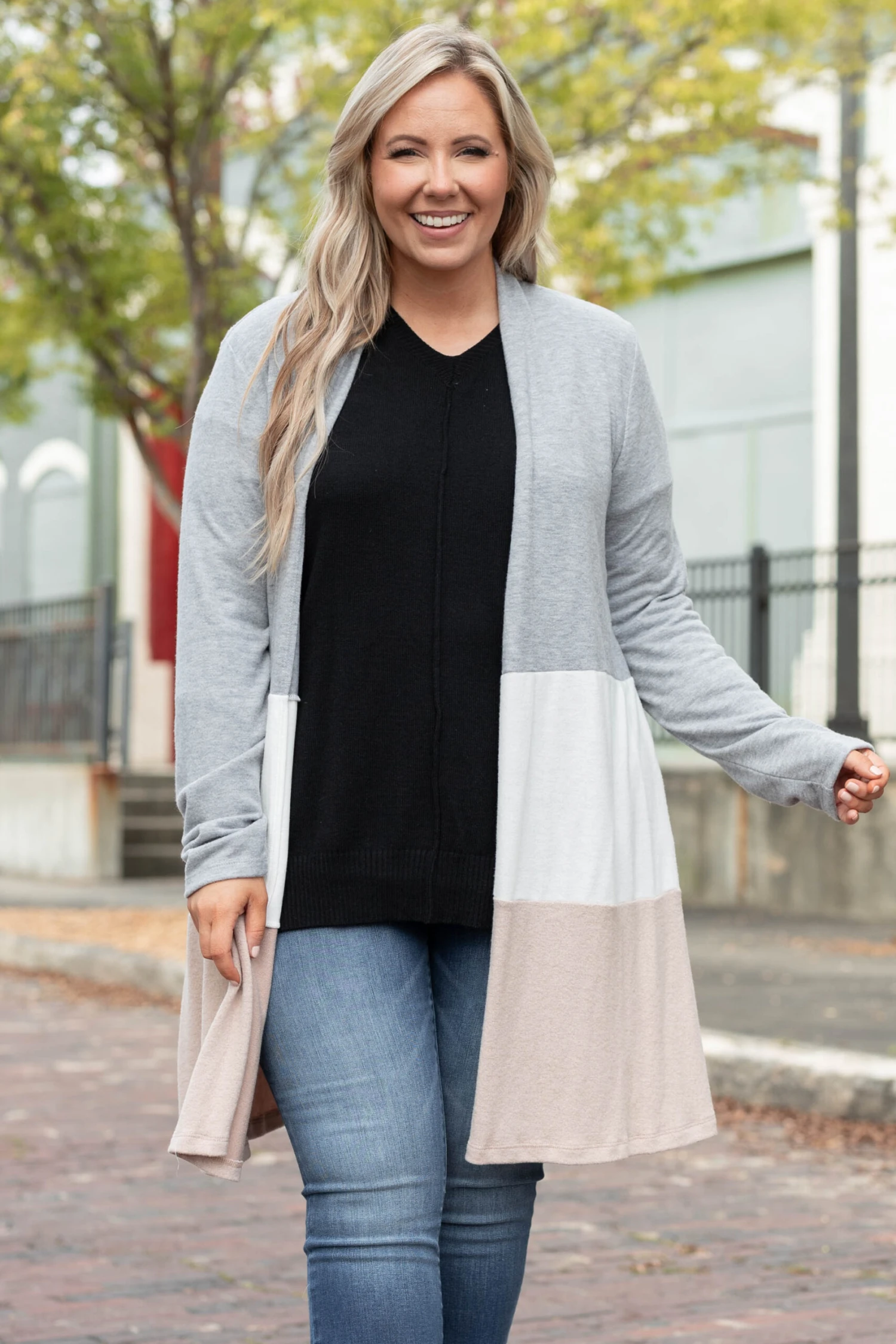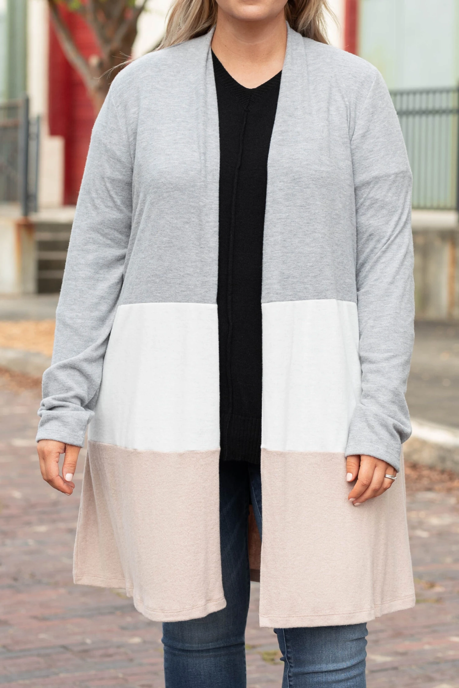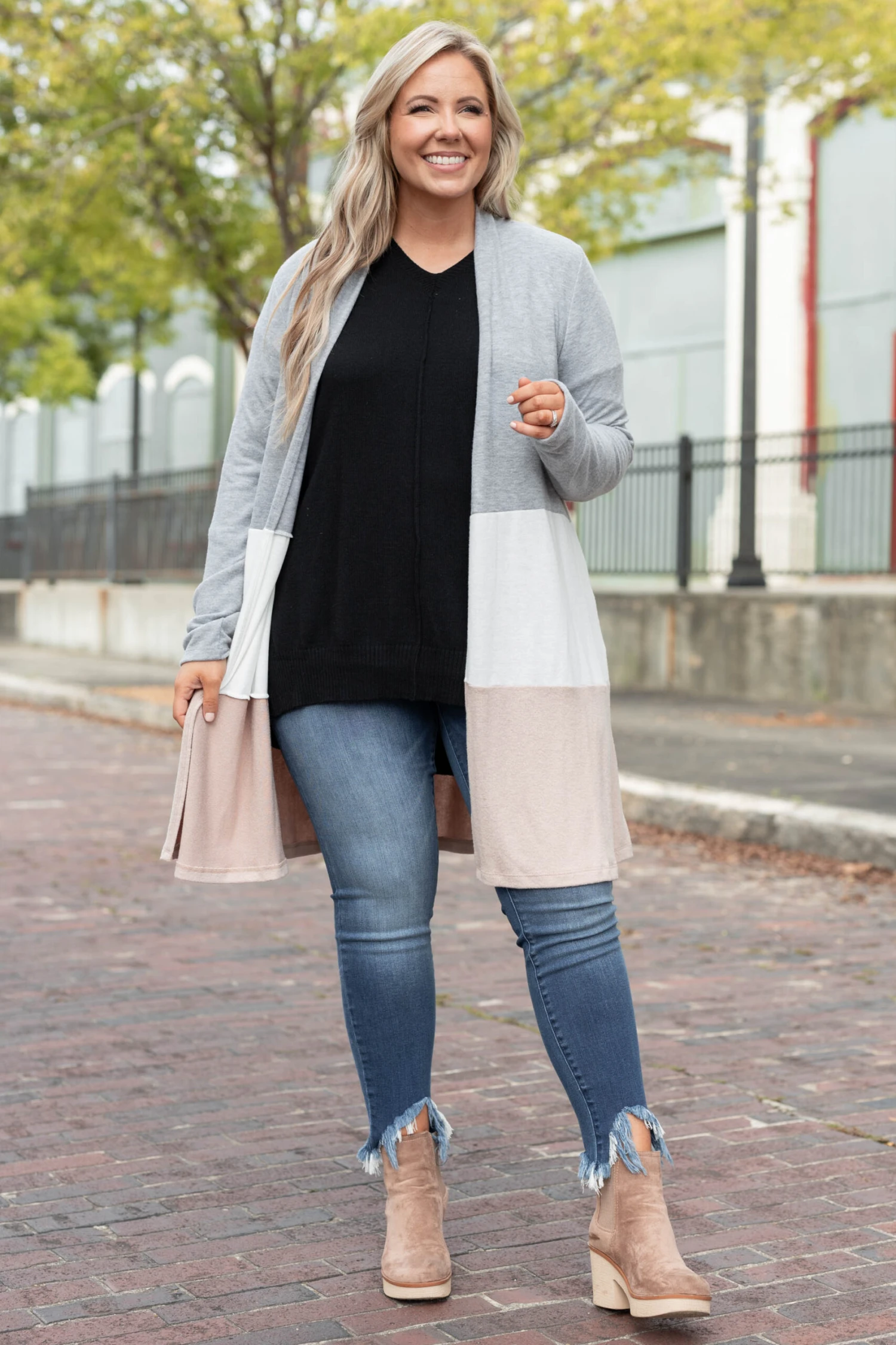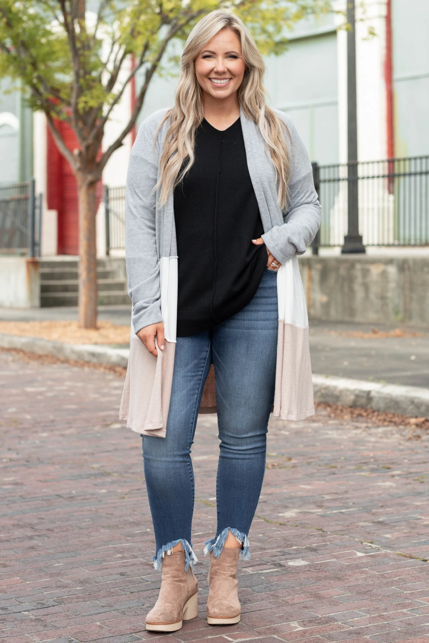 This top means business! It has a chic dark gray, ivory, and taupe with fun color-block detailing throughout! The soft fabric makes it a go-to layering piece! So easily paired with distressed denim and booties for a chic fall look!