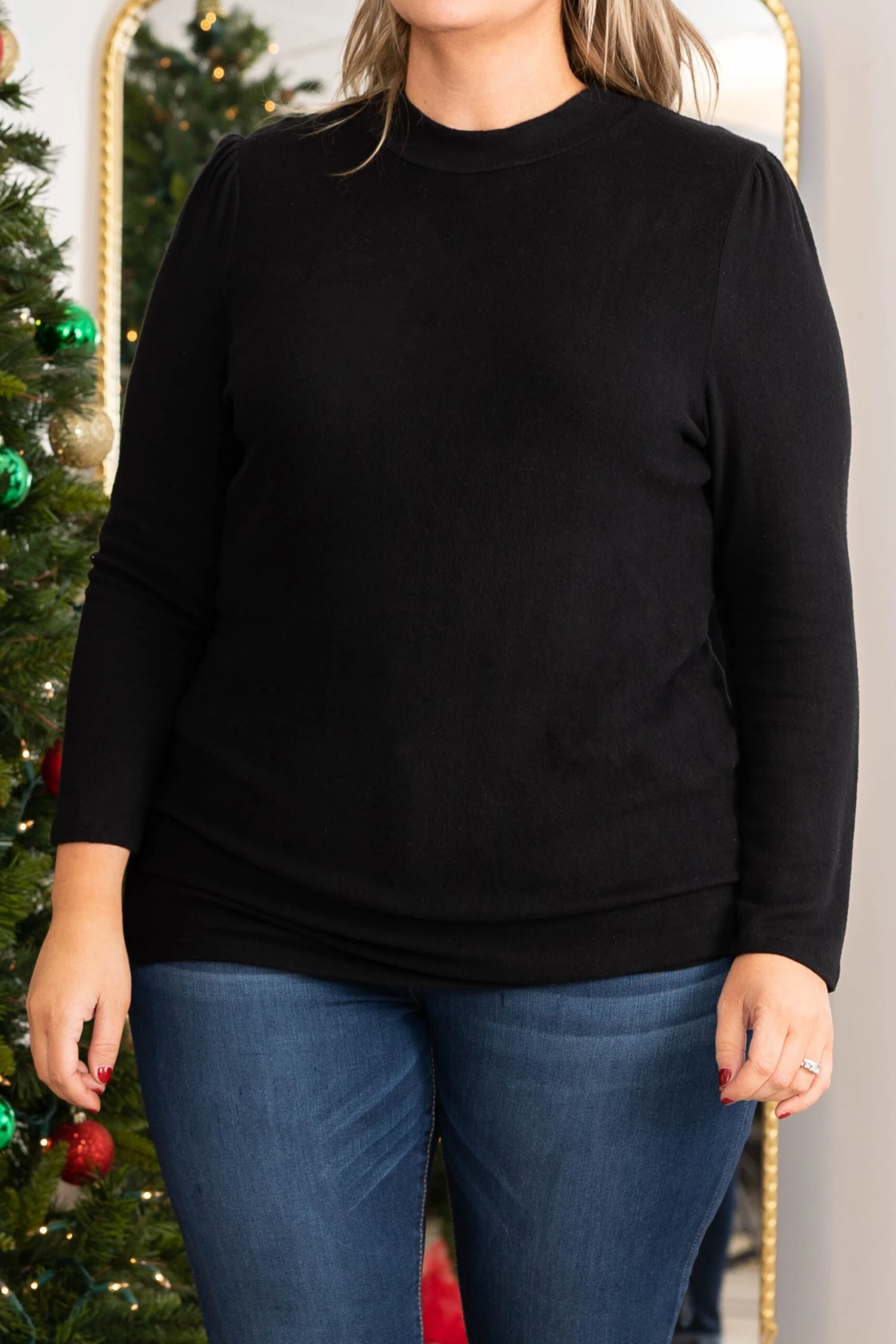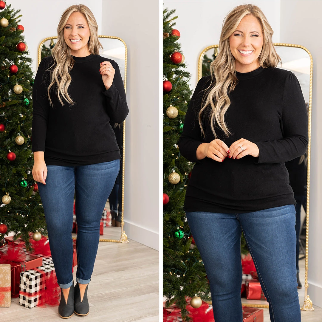 This top makes us so happy! The gorgeous black color, high neckline, and soft material are SO cute and cozy! The figure flattering fit and stretchy material are perfect for all day wear this season! Style this top with some skinnies and booties for a trendy, chic look!