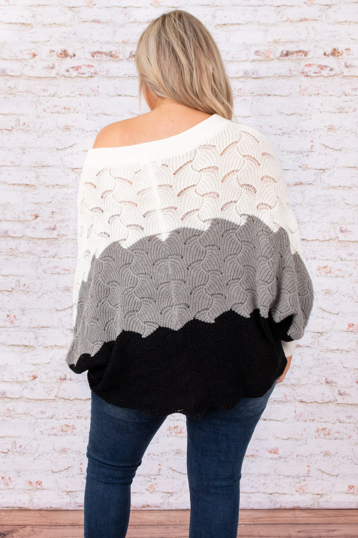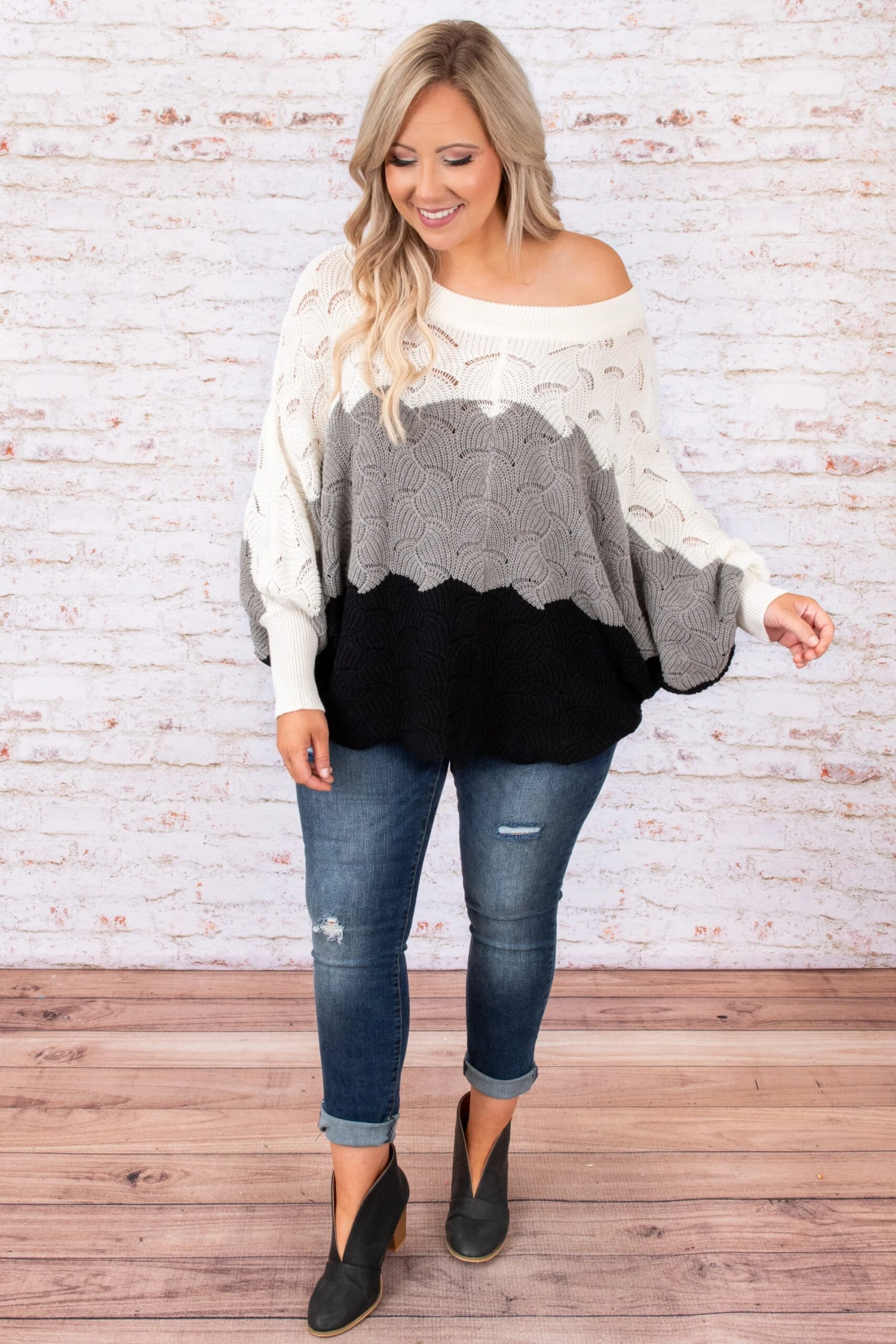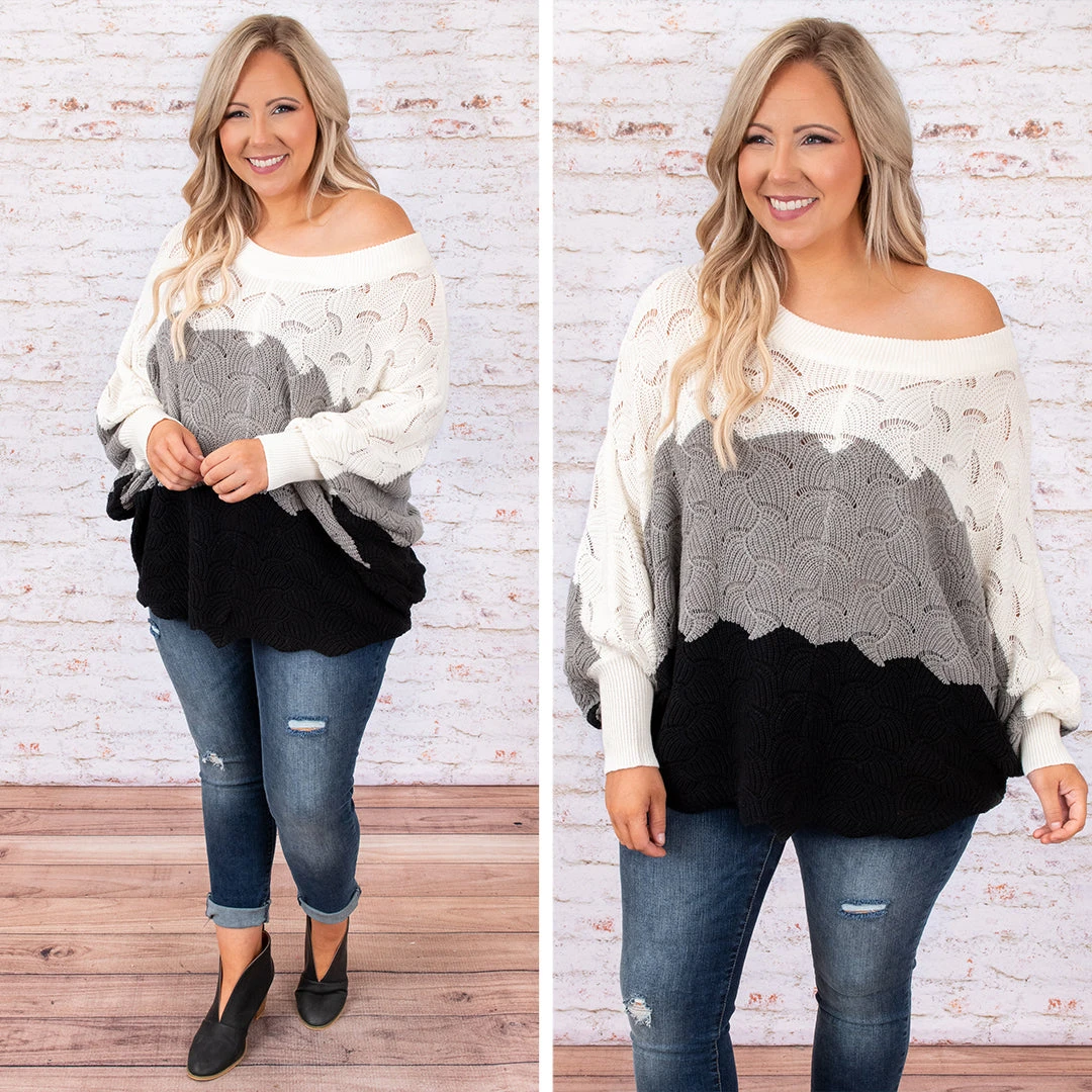 Look like the angel you are when you’re wearing this sweater! This sweater has a large knit fabric with a sweet scalloped design you can wear all season long! It’s comfortable for all day wear, has a over-sized fit to flatter your figure, and can even be worn off the shoulder! Not to mention how easy this piece is to style! Wear this sweater with skinnies and booties for an effortlessly chic look!Â