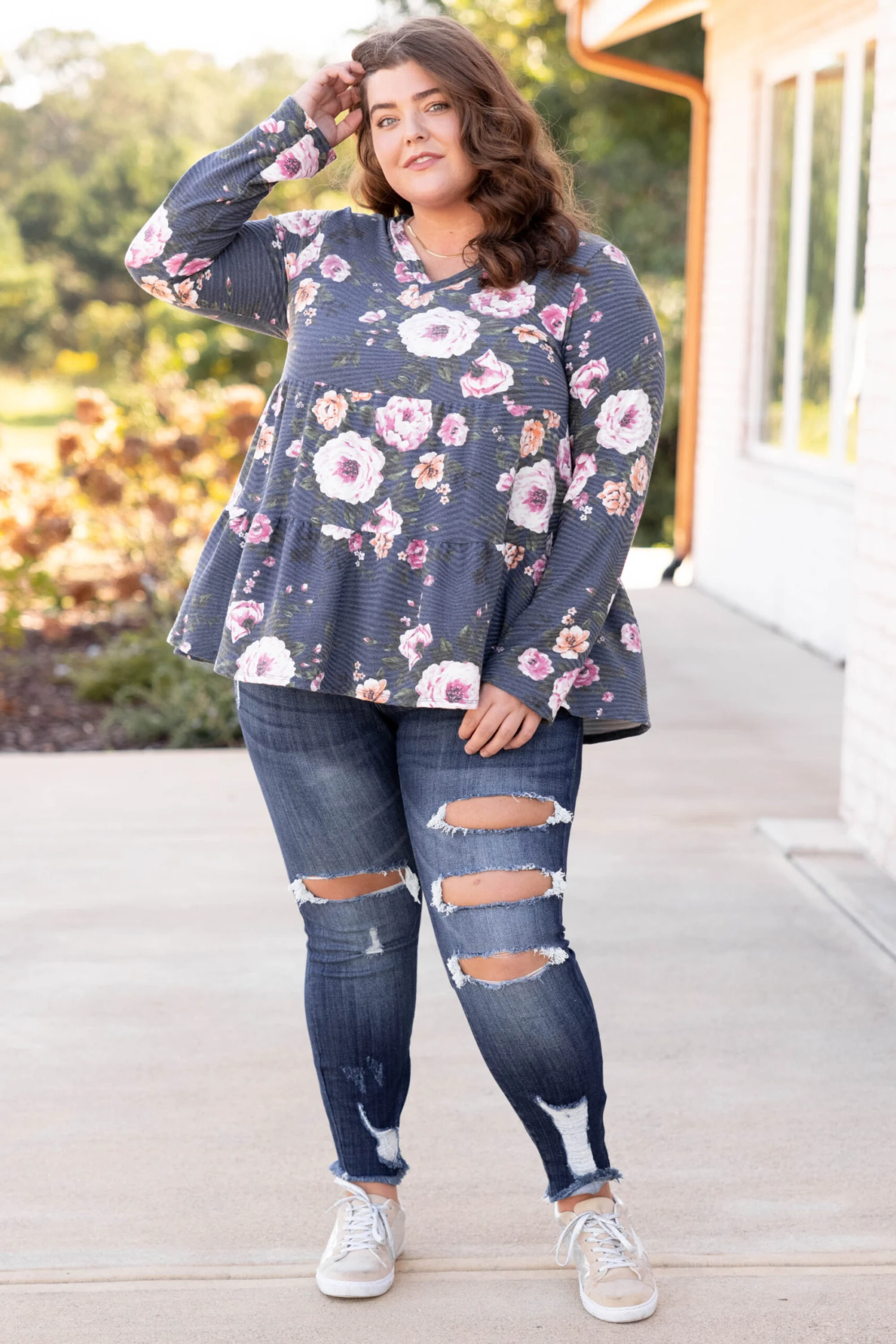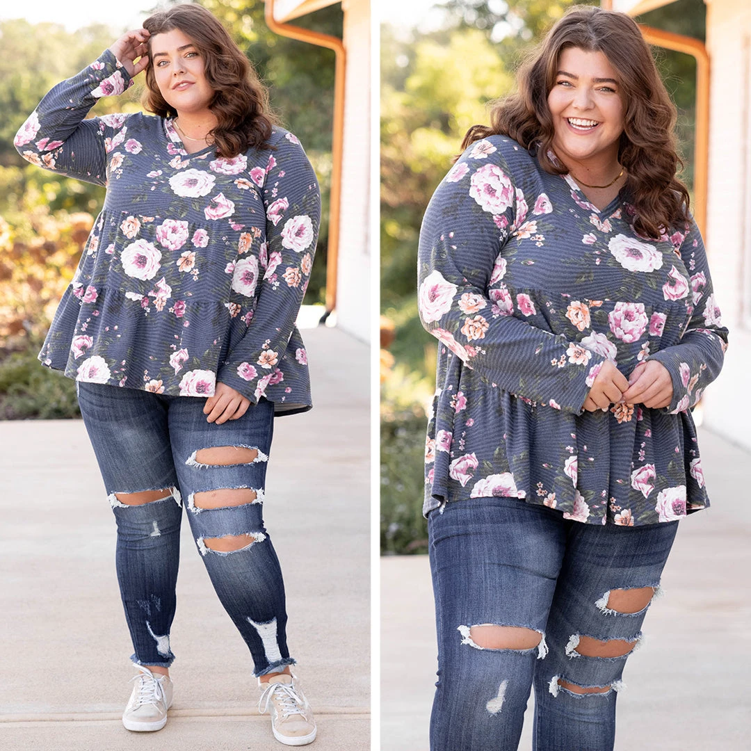 We know you are going to love this top! This top has a pretty floral pattern with a soft navy color we adore! It’s comfortable for all-day wear, has a flowy fit! Simply style this top with skinnies and flats for an effortlessly chic look!
