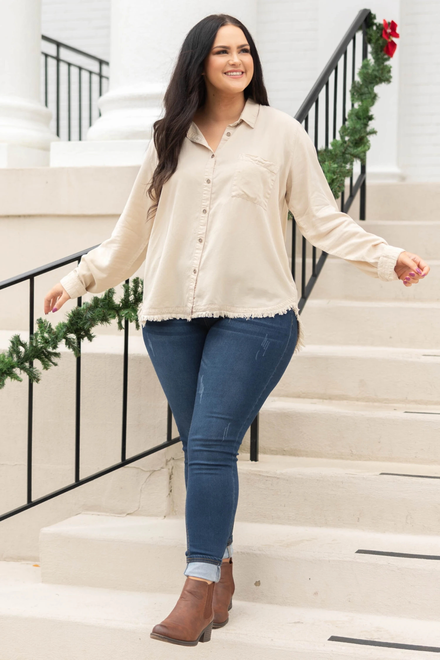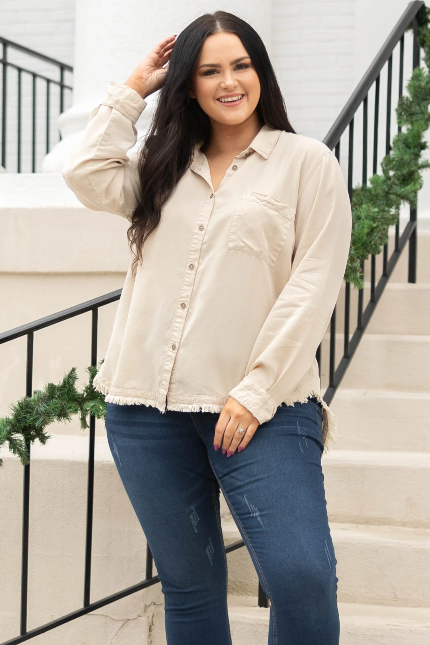 You will basically never want to take this top off! The distressed hem is so stylish and the button down look is so trendy! This cutie can be worn layered over a tee or on its own for the perfect look!