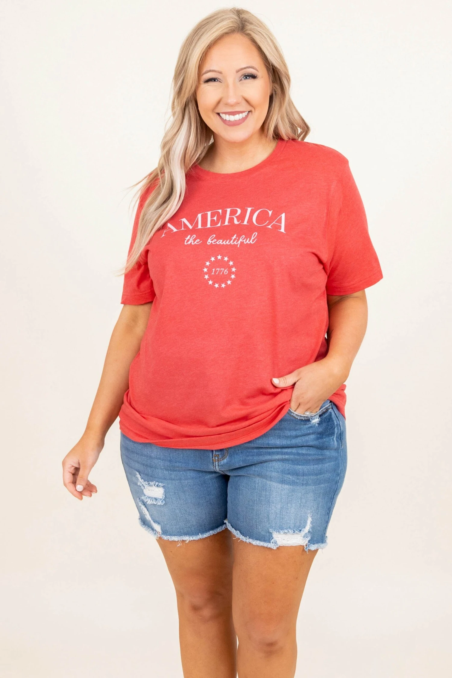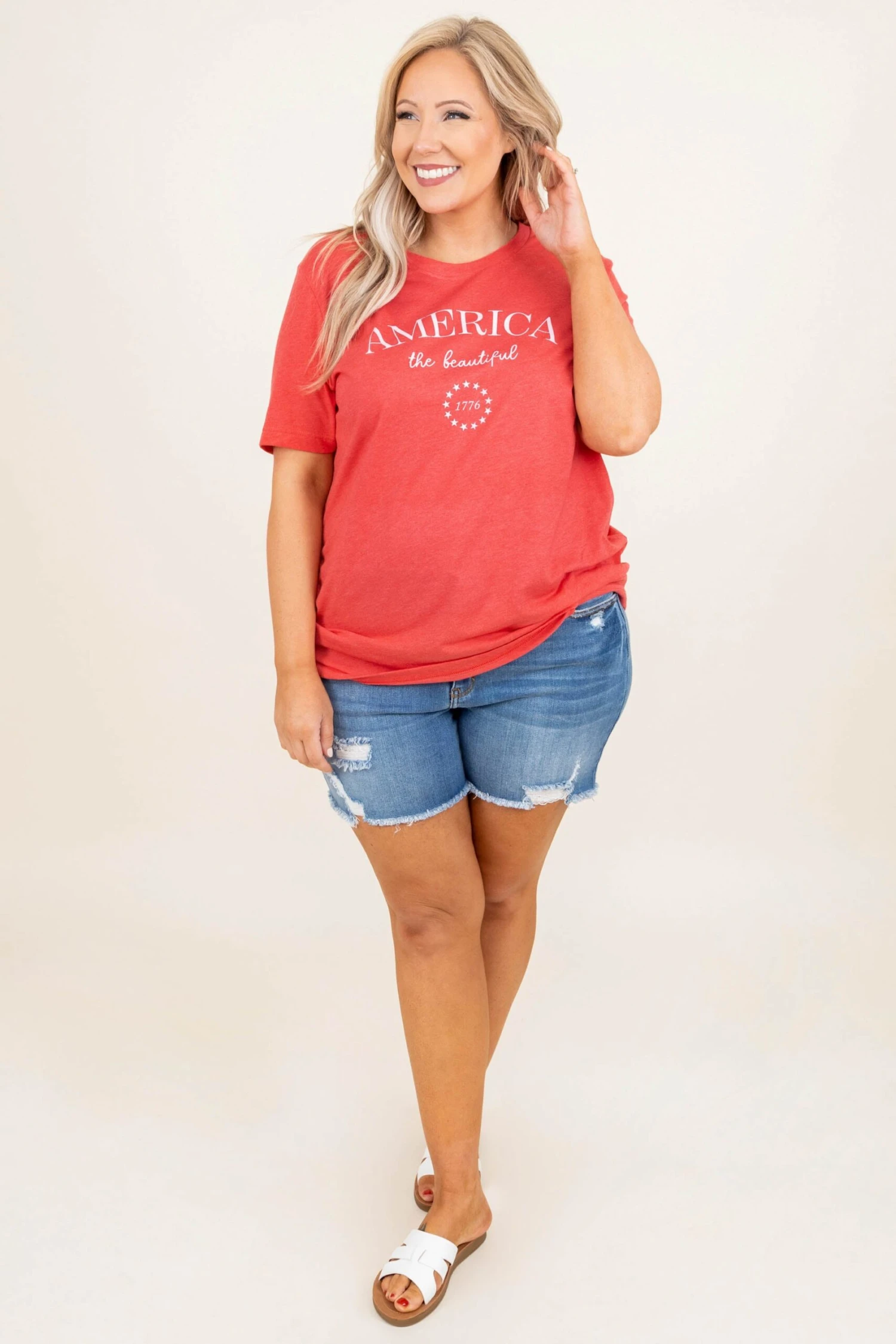 Look as beautiful as the country in this tee! The heather red color is super bold and perfect for Memorial Day! The white graphic really pops against the red and the tee fit is so comfy! Style this with jean shorts and sandals for a patriotic look!