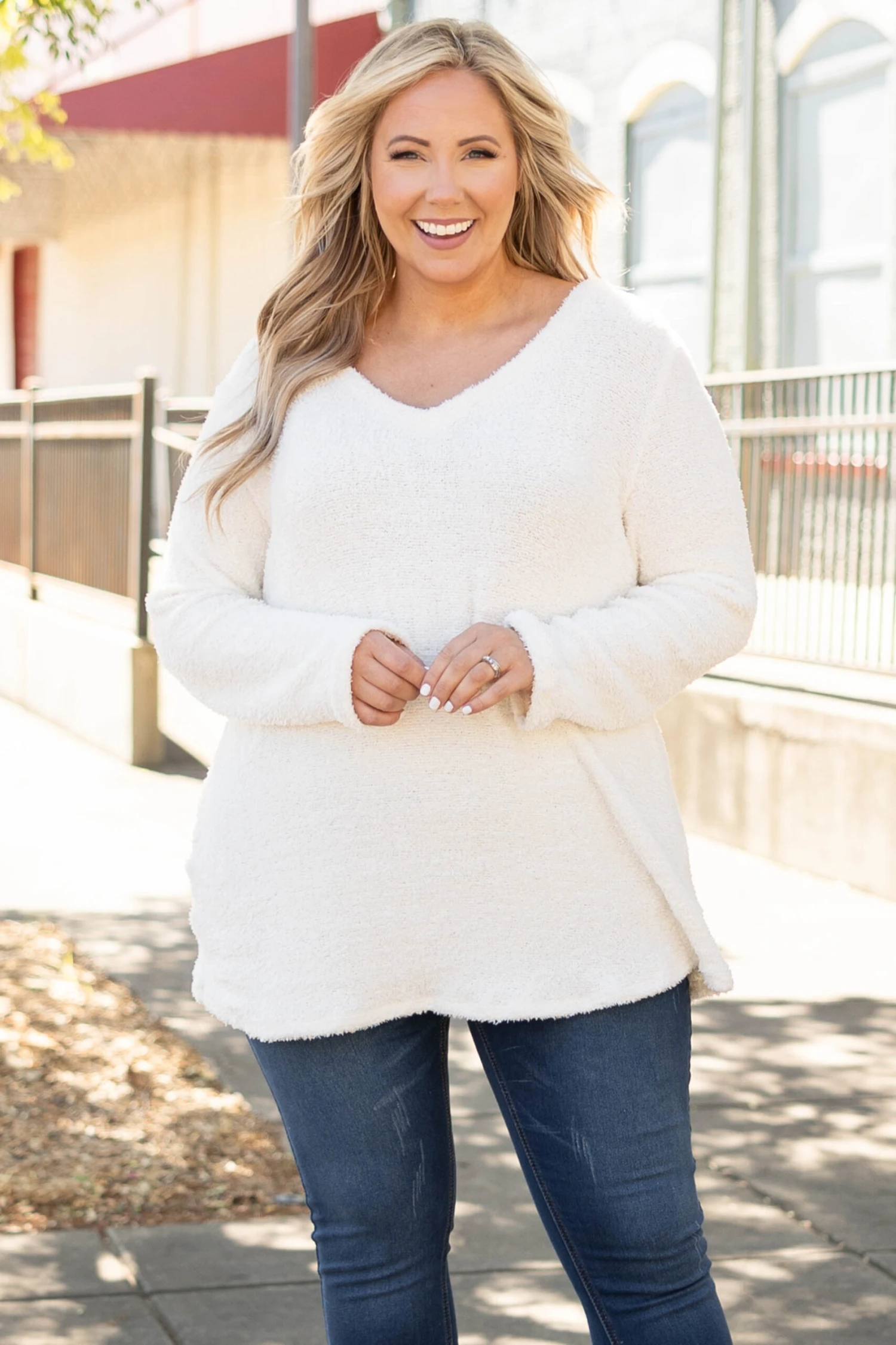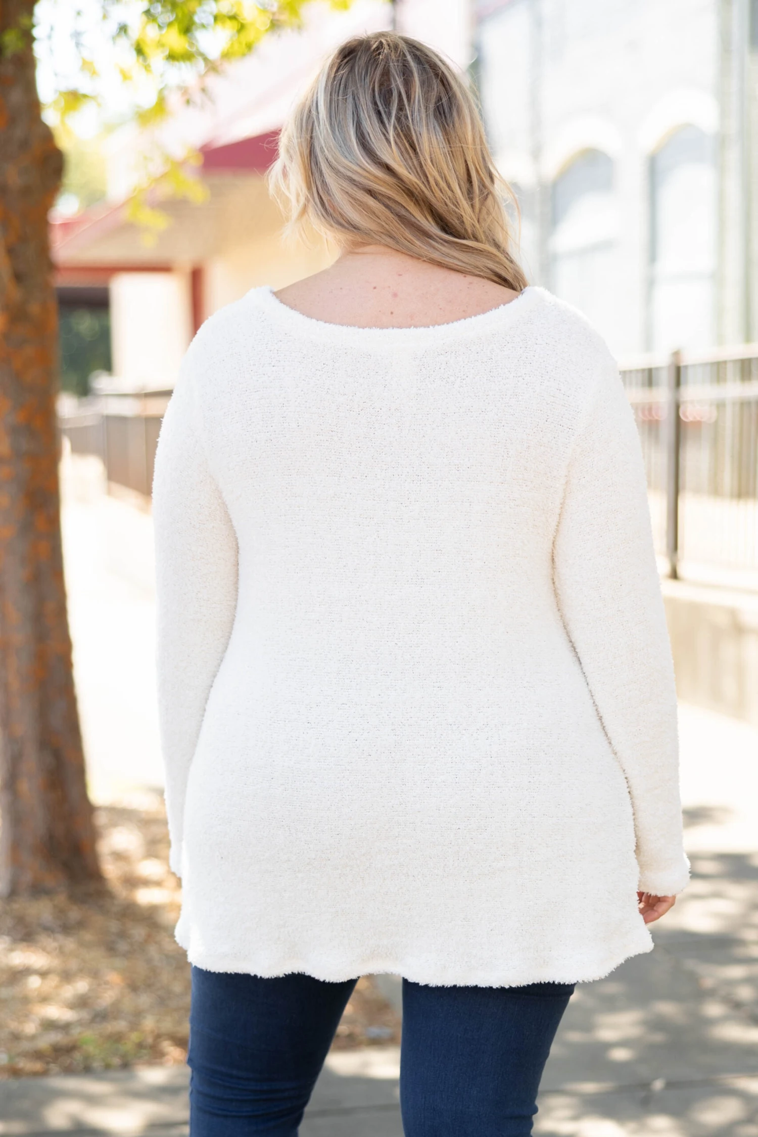 Take on the season in this gorgeous sweater! This sweater has a sweet ivory color with soft, cozy fabric perfect for those cool days ahead! The flowy, figure flattering fit pairs well with all of your faves! Style this sweater with some skinnies and booties for a totally fab look!