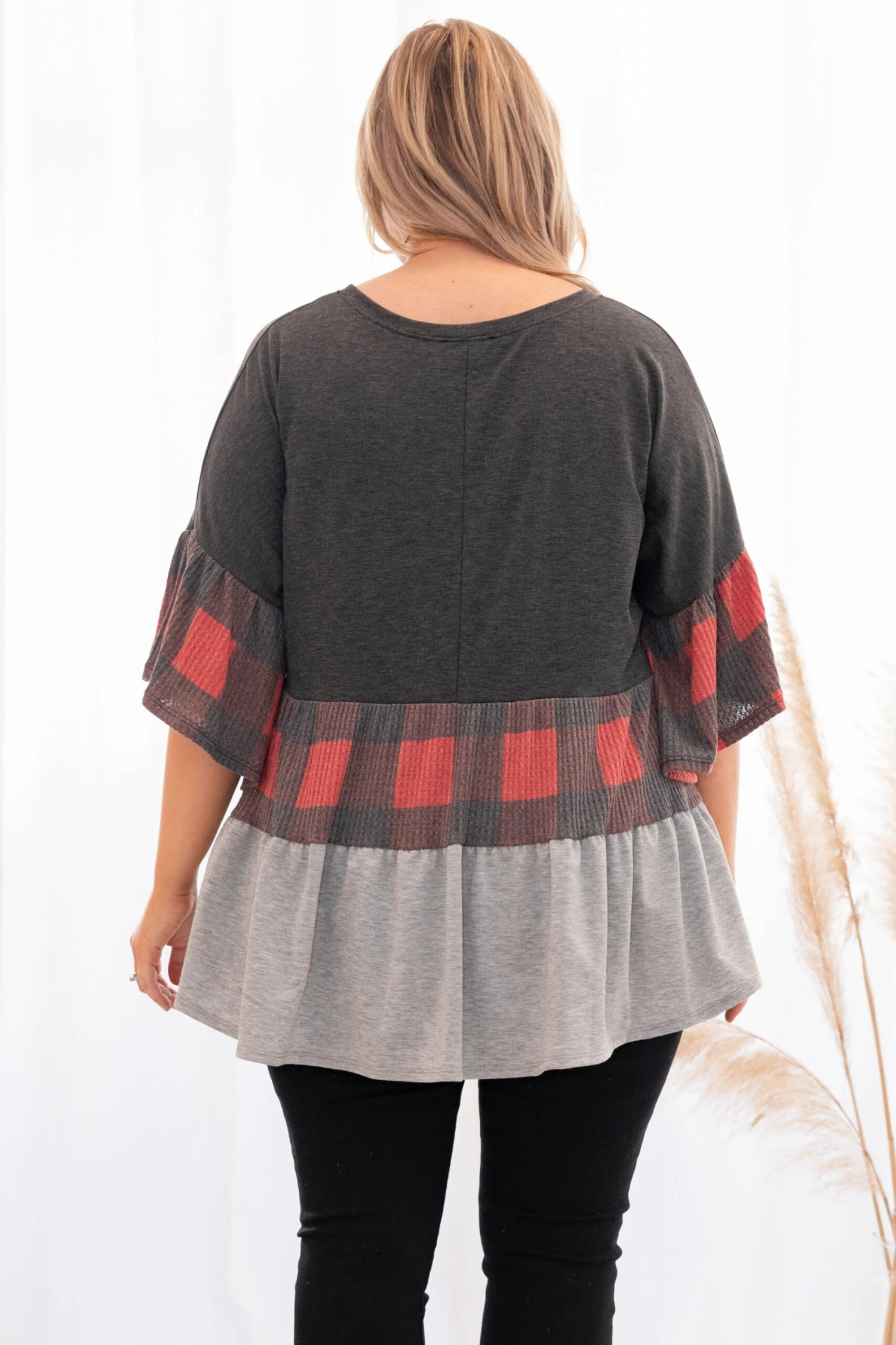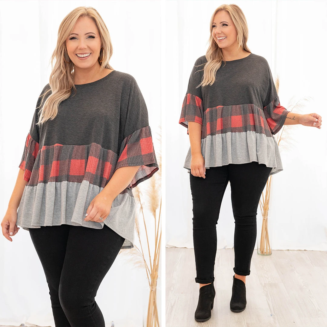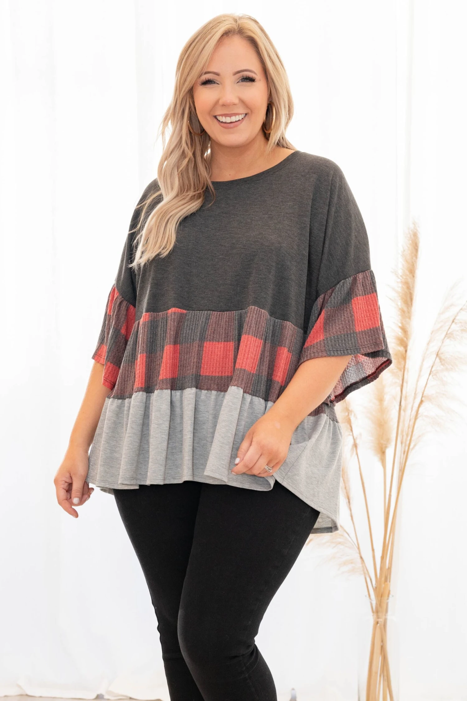 This new top is the best of them! It has a sweet babydoll fit and a plaid colorblock that has a fun waffle fabric. Pair with jeans and booties for a fab style this season!