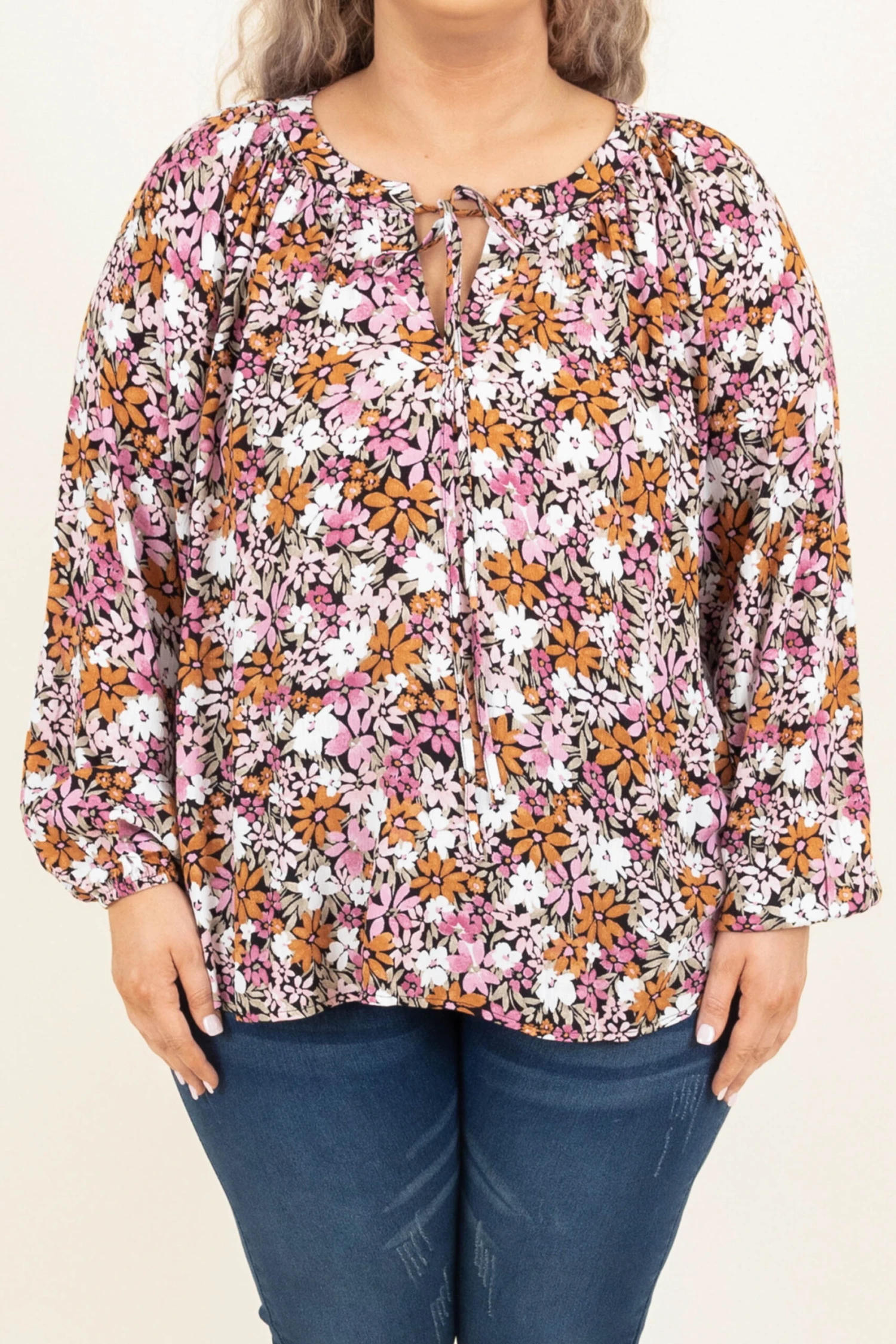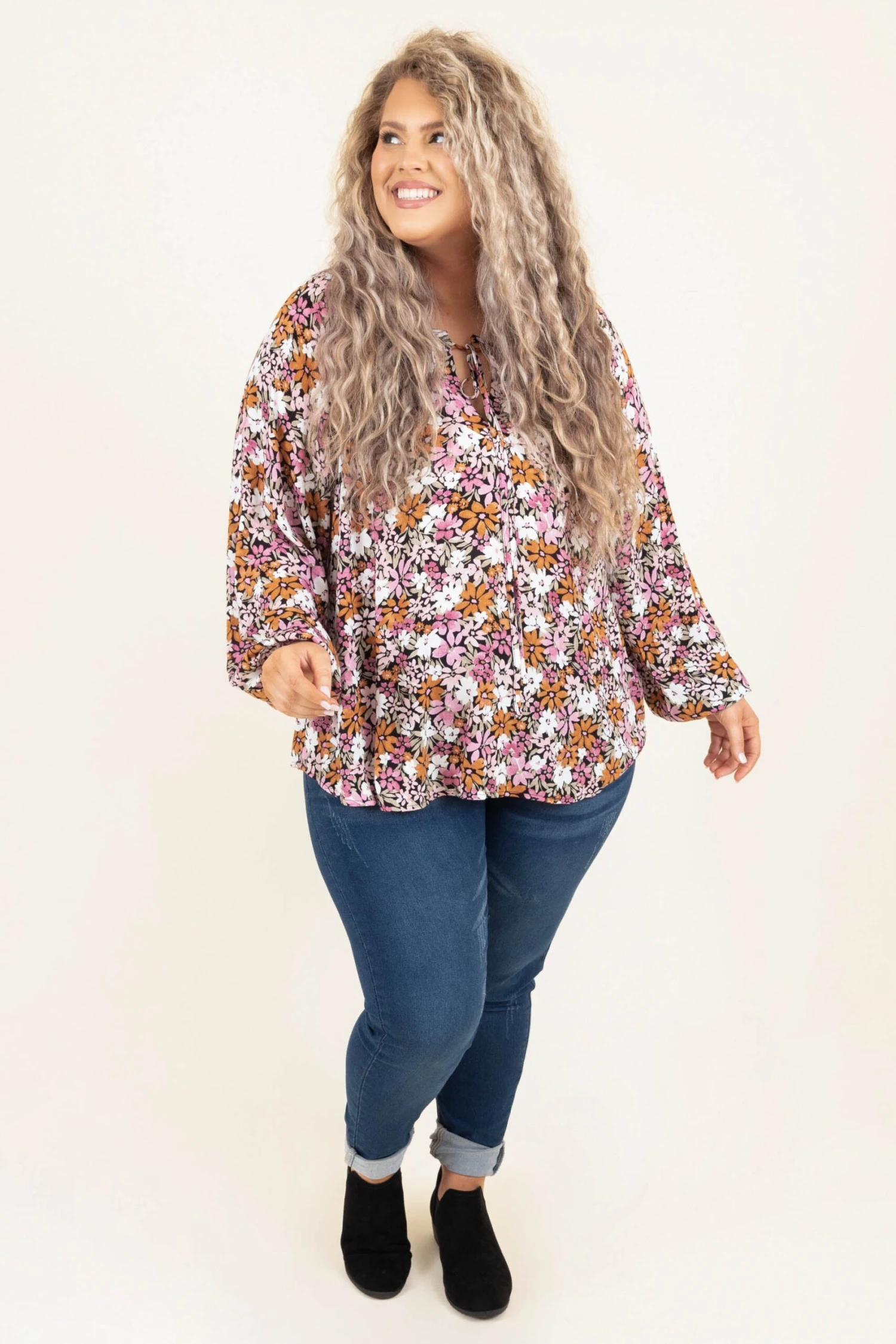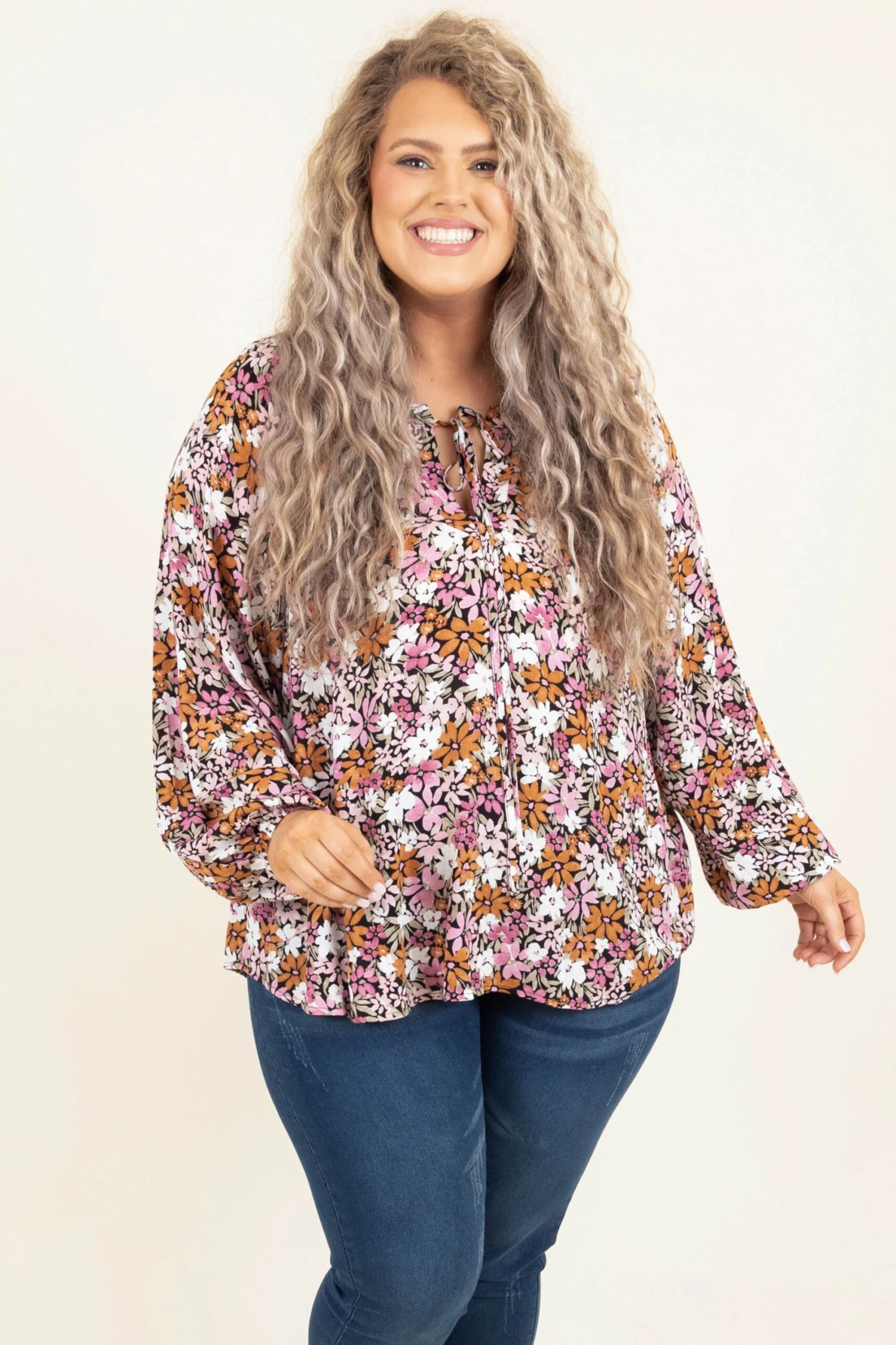 Let your courage blossom in this gorgeous top! This top has a beautiful, floral pattern and a flowy fit that will flatter any figure! The keyhole tie and lightweight material is so sweet! Style this top with some skinnies and booties for a classic chic look!Â