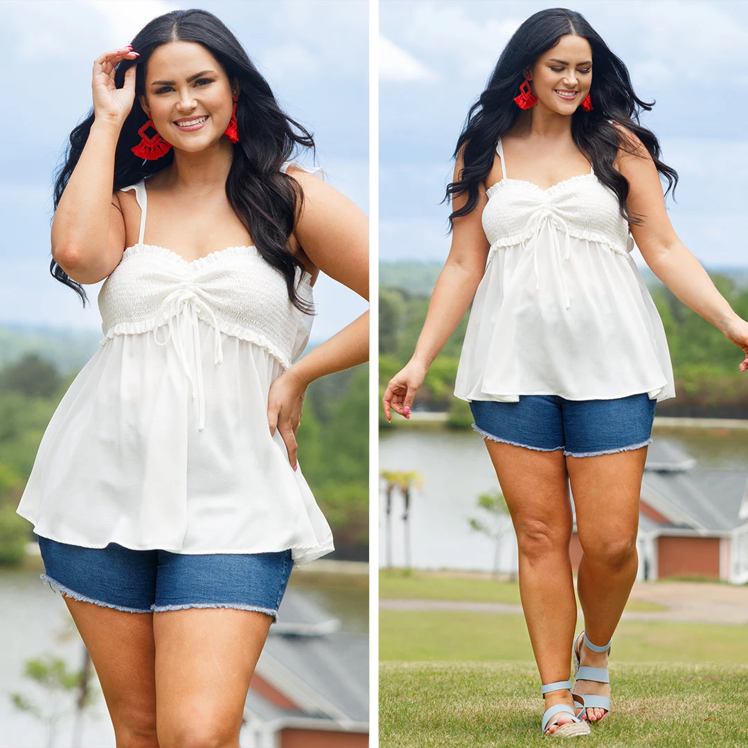 This top is sure to be a staple in your wardrobe! Crafted from a soft fabric blend, it features a smocked bodice for a comfortable fit, spaghetti strap detailing, and a neutral white hue! Perfect for a casual day out!