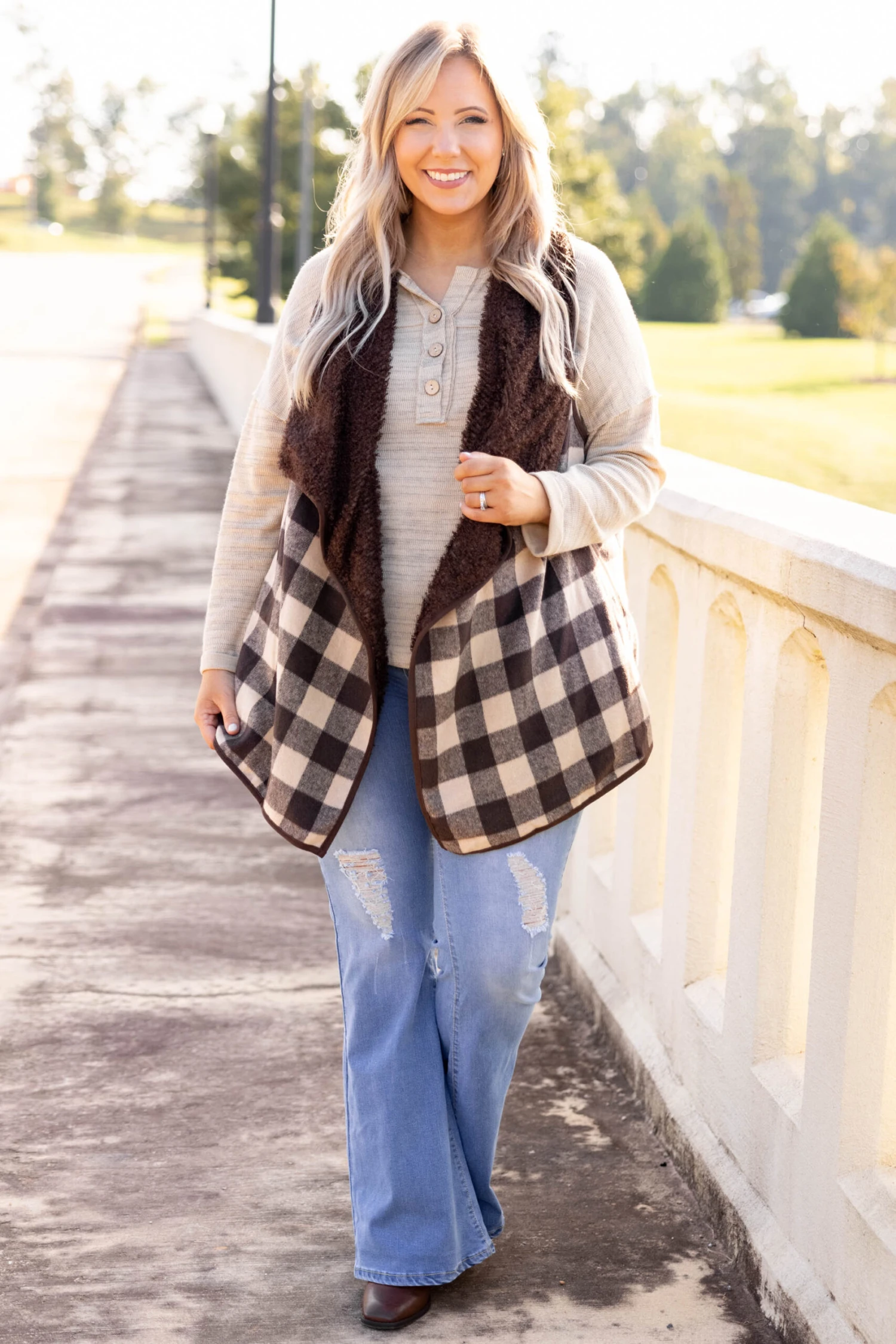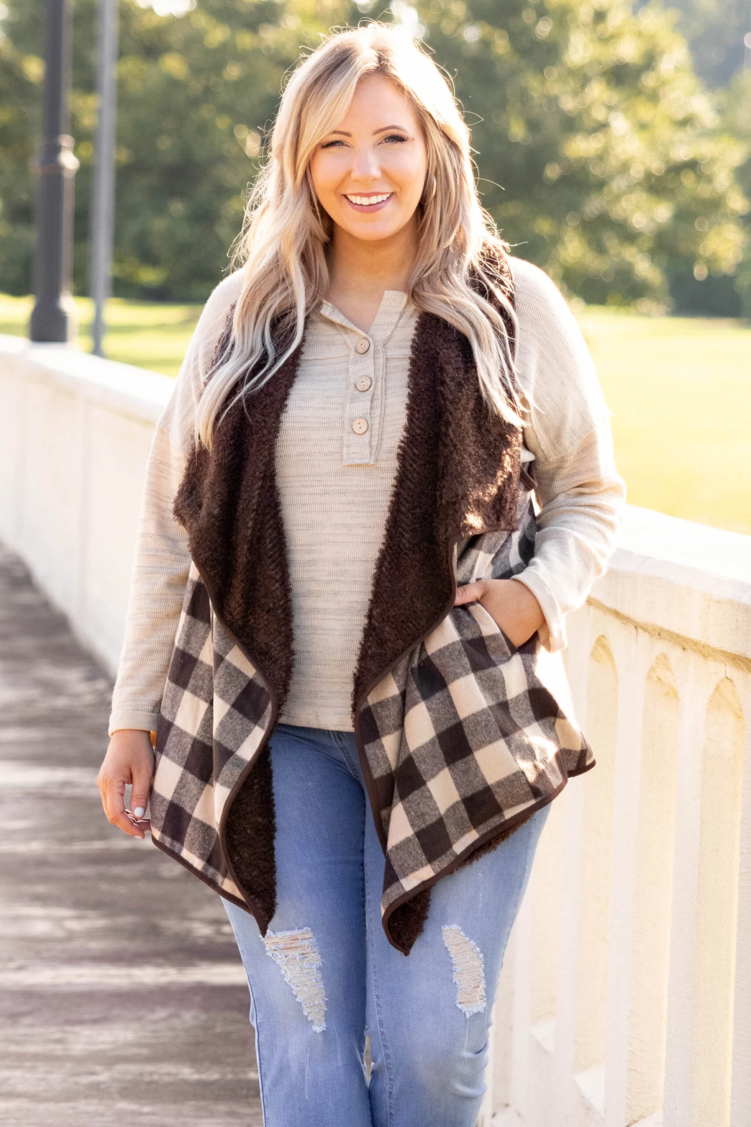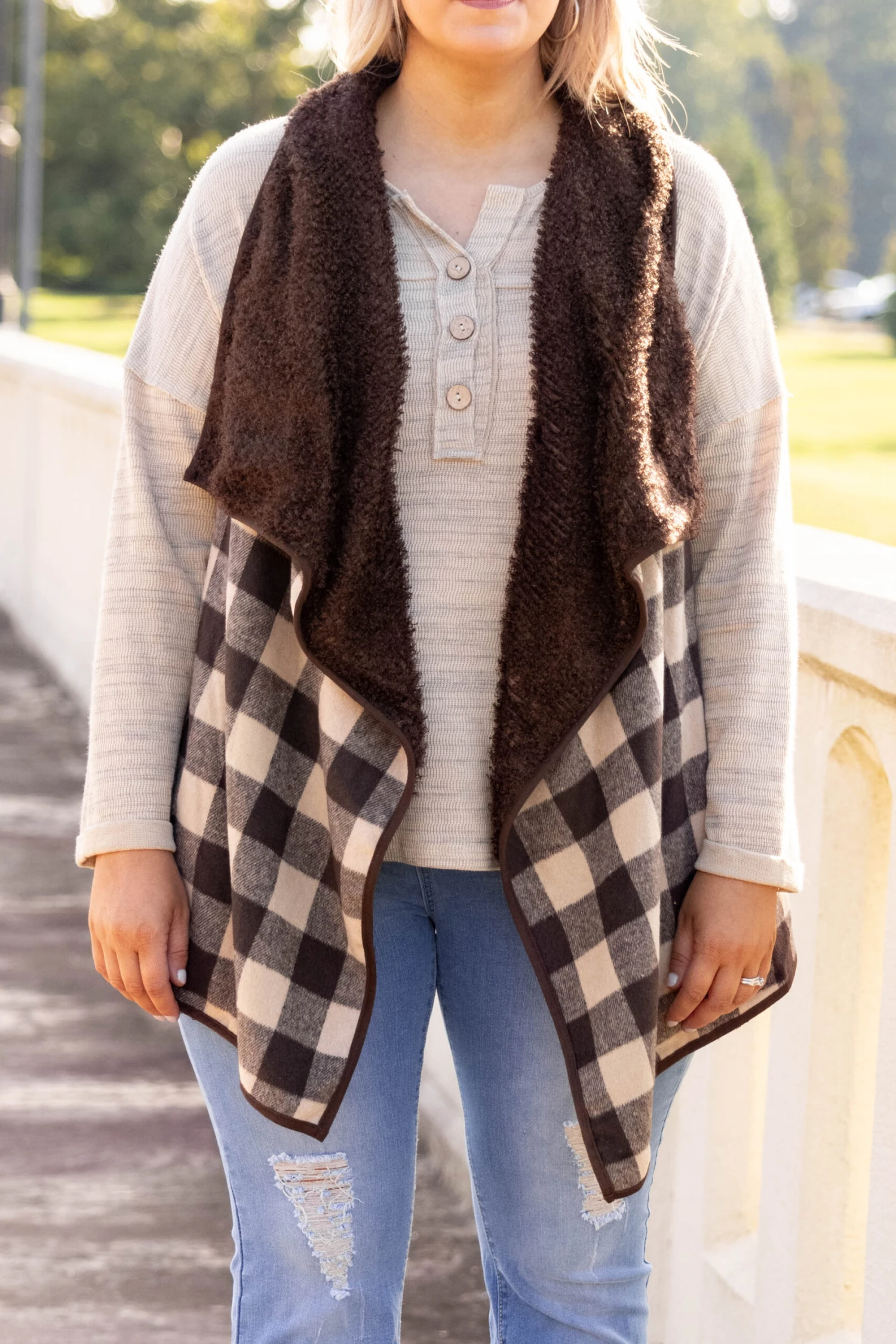 This vest was made for blustery nights! It has a classic plaid pattern with colors that are perfect for the season! It’s heavyweight, has a fur-lining, and even features pockets! Simply, style this mocha vest with a basic top or dress for an effortlessly chic look!