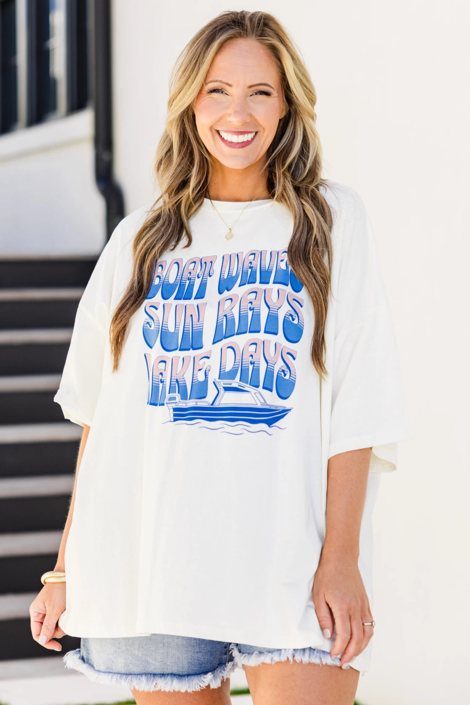 Get ready for endless lake days with our Boat Waves & Lake Days Boyfriend Tee! This oversized tee features a playful lake graphic, making it the perfect choice for a day of fun in the sun! So grab your shades and sunscreen, and get ready to rock this tee!