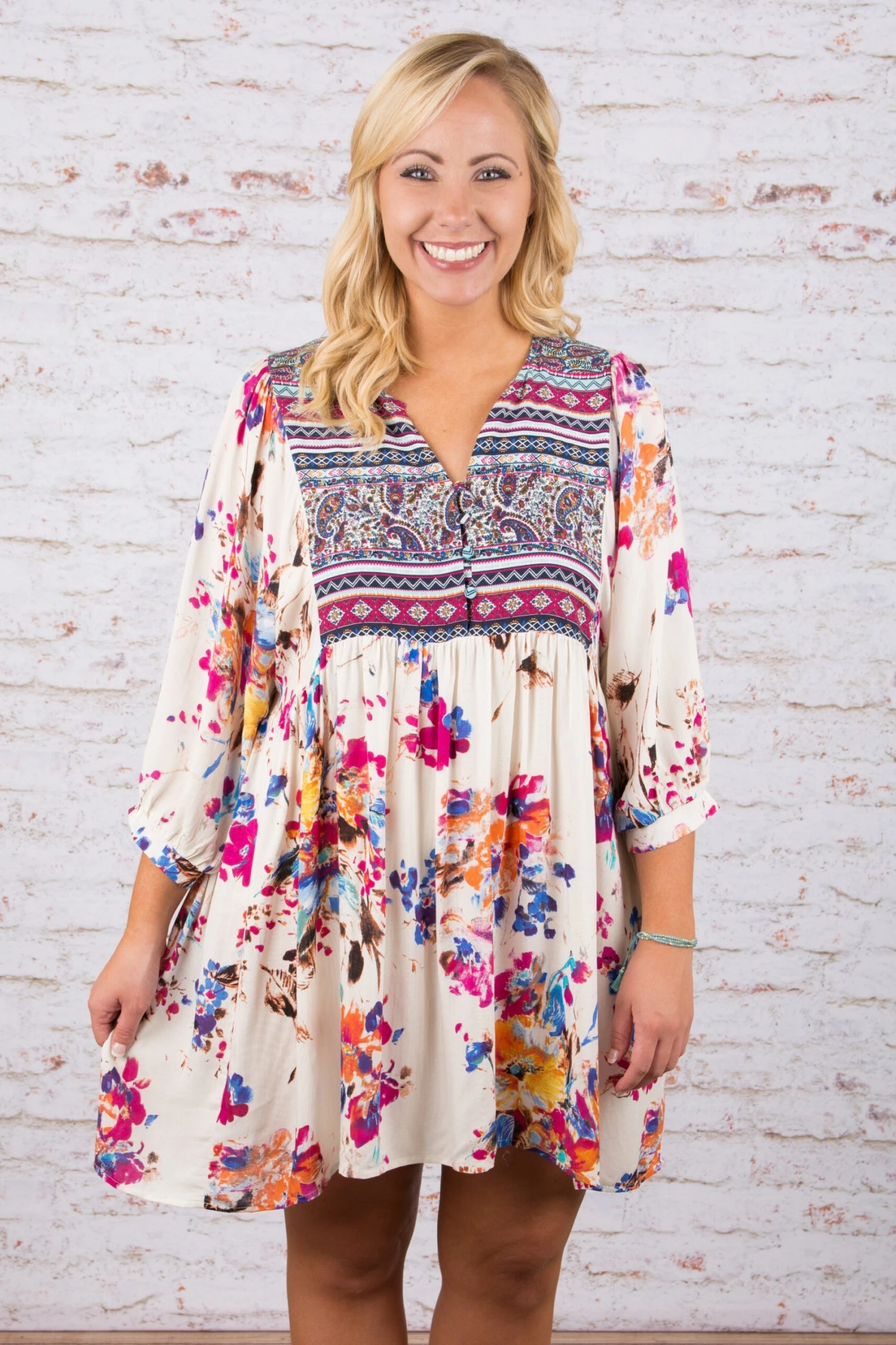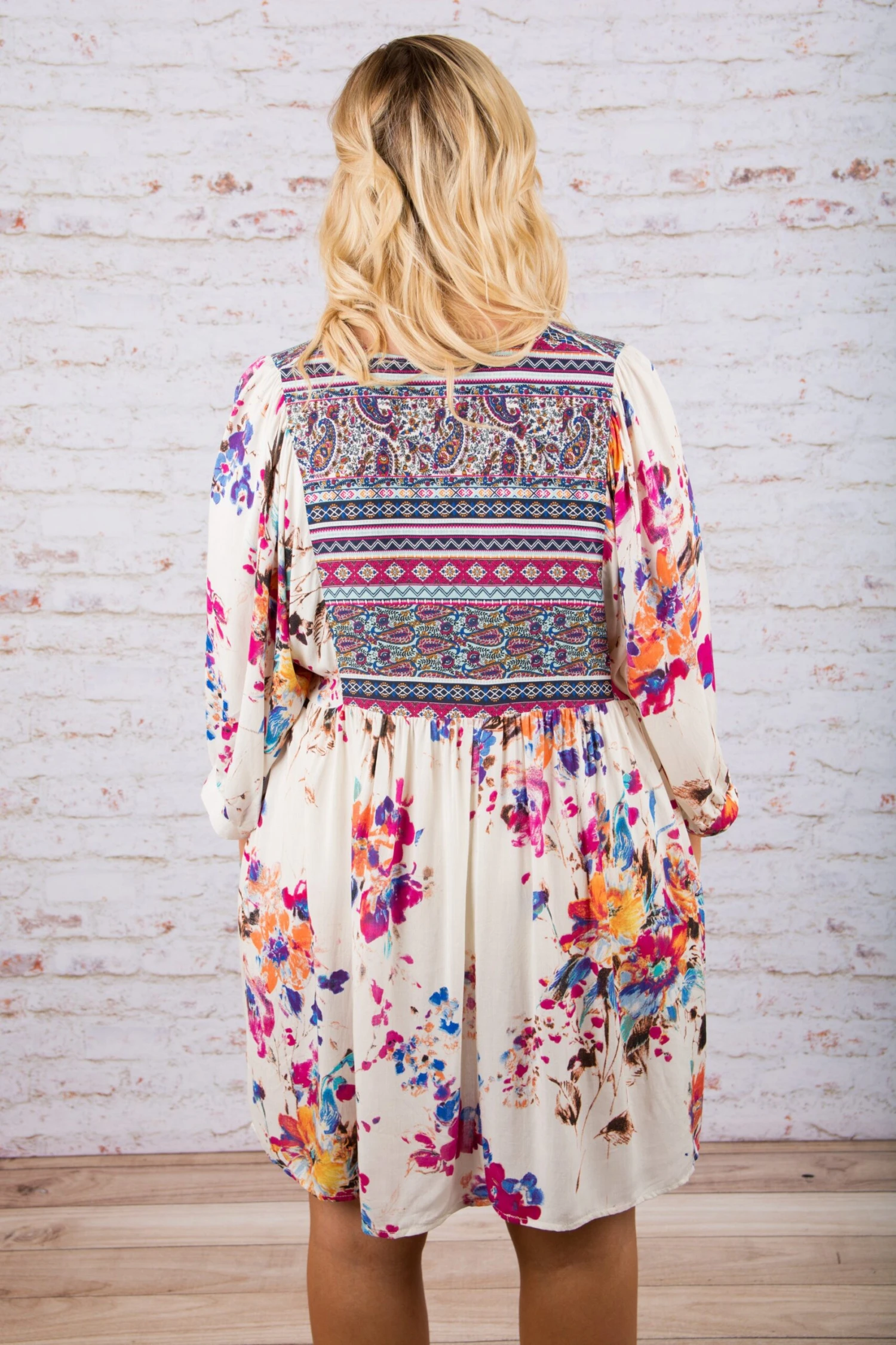 This dress is absolutely fascinating! We are so in love with the combination of both prints and colors! It’s all so wild and boho! This dress features a generous cut which makes it super comfy and flattering! Wear this beauty alone or over leggings for a more modest look!