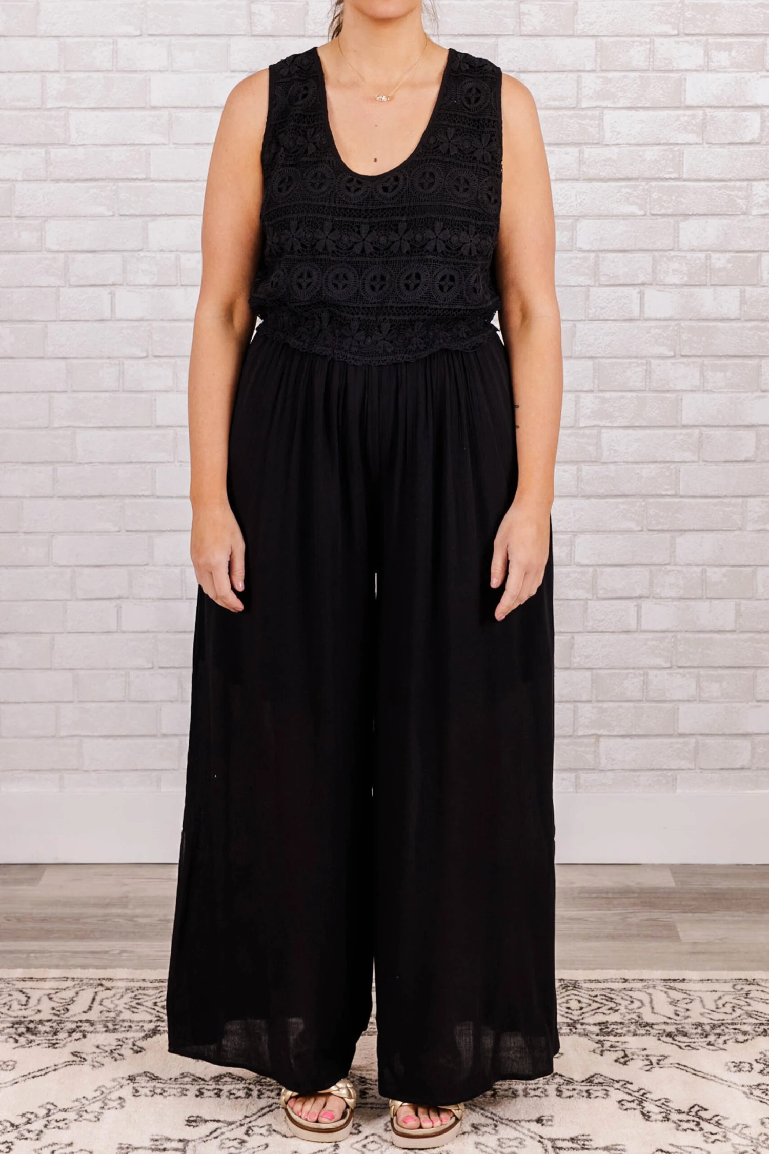 We are so in love with this FAB jumpsuit! The sassy fit and neutral black color can easily be dressed up with a pair of heels or kept casual with a denim jacket and booties! The lace detailing along the bodice adds an extra touch of elegance and charm!
