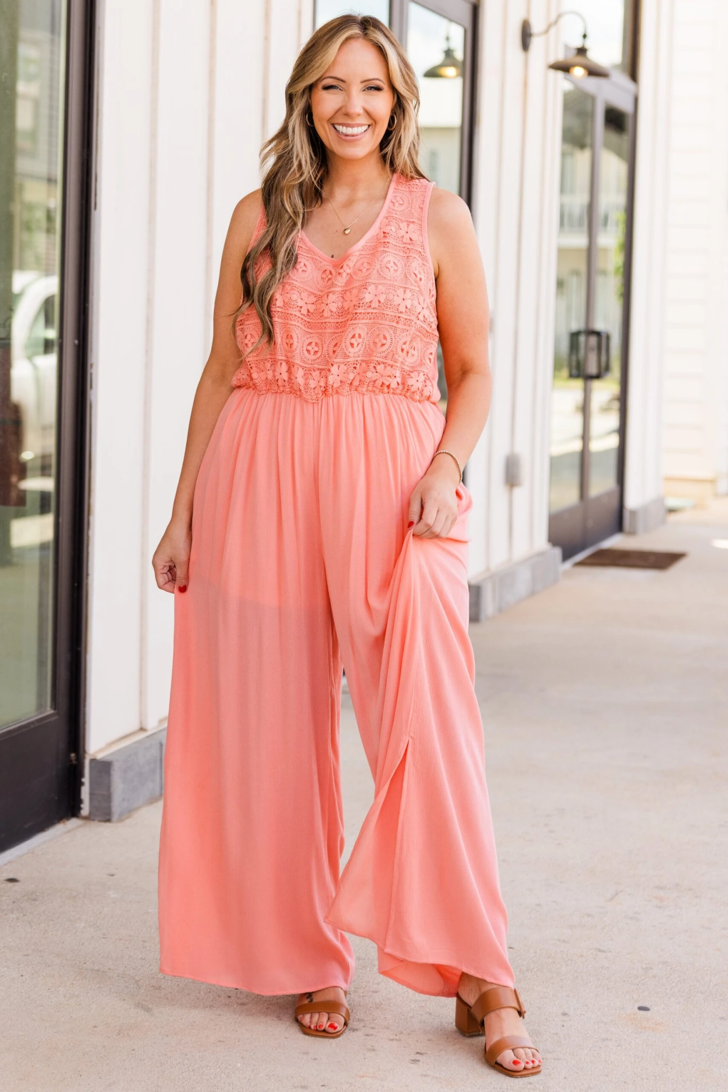 We are so in love with this FAB jumpsuit! The sassy fit and peach color can easily be dressed up with a pair of heels or kept casual with sandals and cute accessories! The lace detailing along the bodice adds an extra touch of elegance and charm!