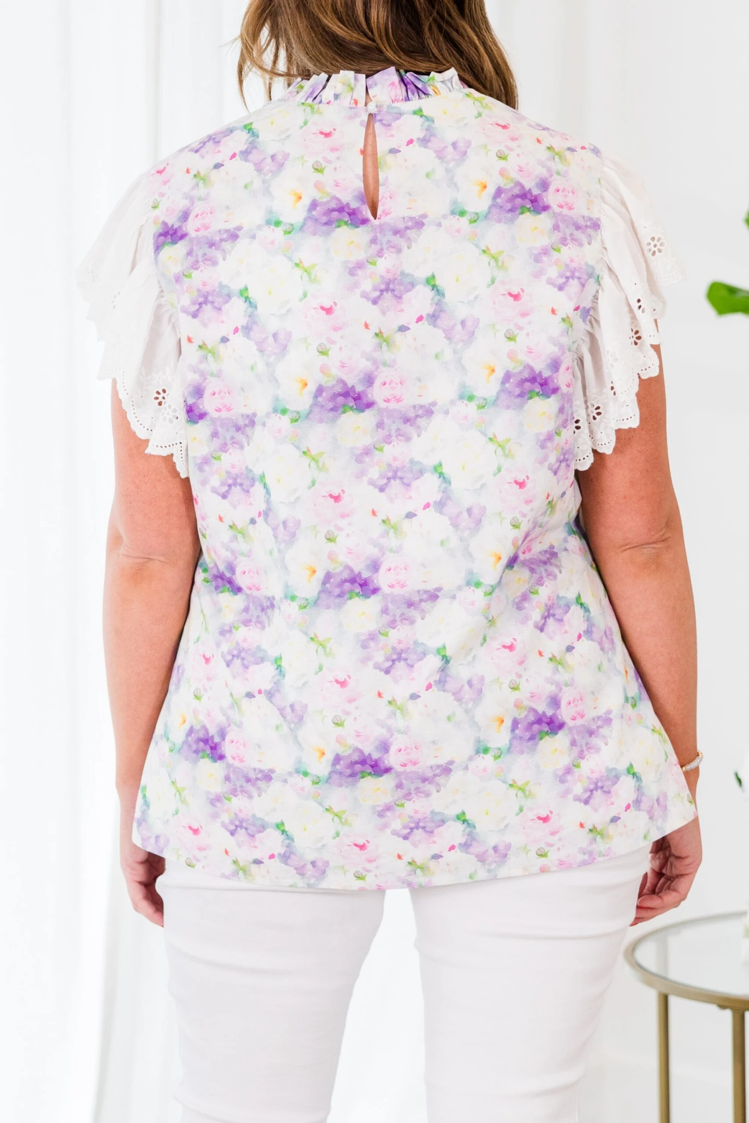 Upgrade your style with our Breathe Freely Top in lavender! The flutter eyelet lace sleeves and ruffle detailing add a touch of elegance, while the floral pattern brings a sleek charm! Stay classy and comfortable in this top, perfect for any occasion!