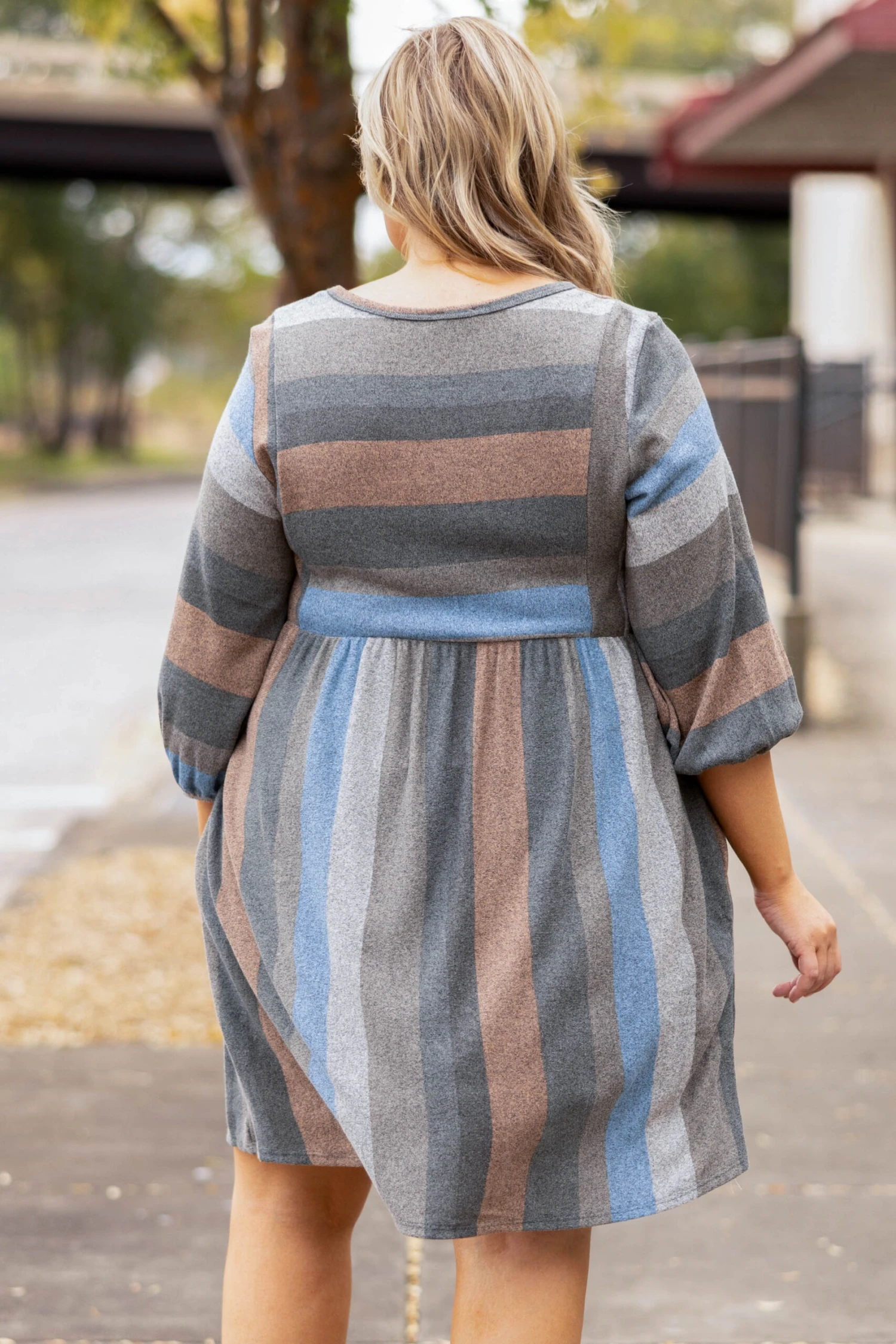 You will want to wear this dress back to back! This dress has a trendy stripe print with sage and mocha colors we adore! It’s comfortable for all-day wear, has a flattering fit, and even features pockets! Simply style this dress with booties for your next event!
