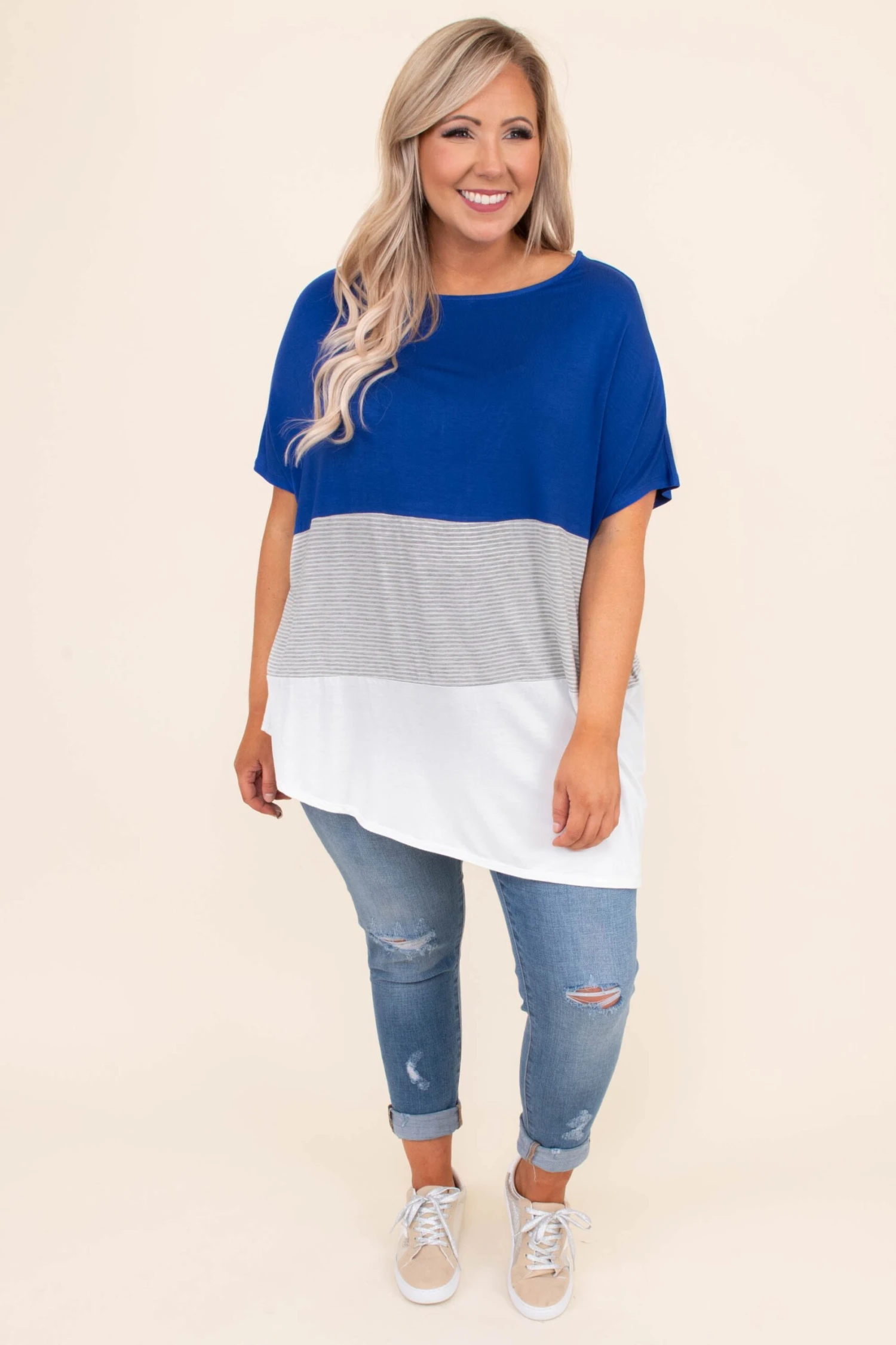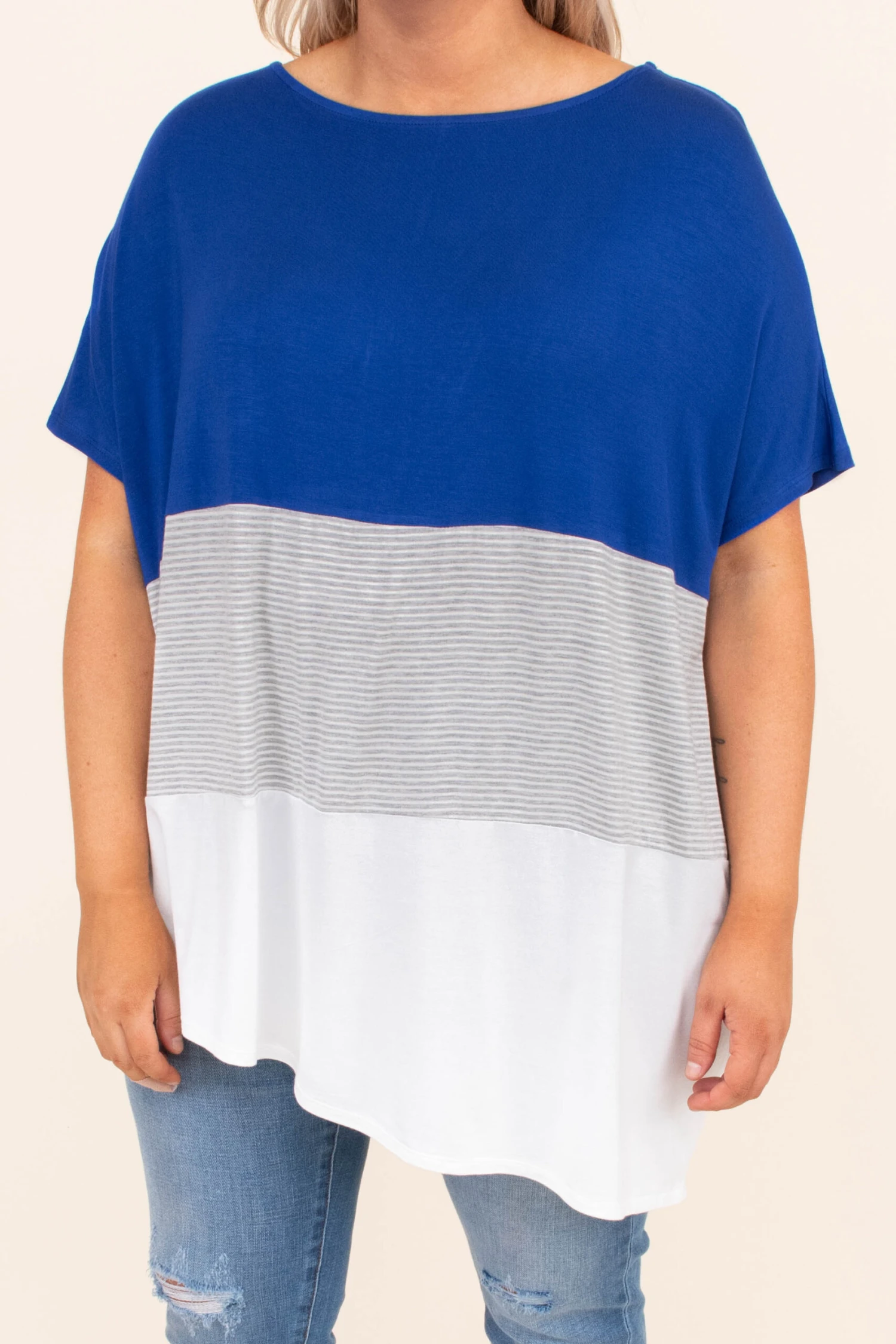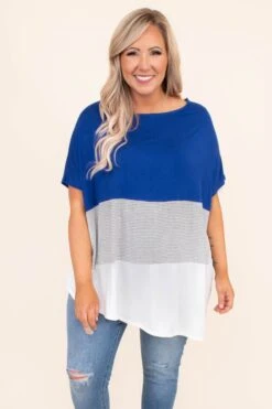 At the risk of sounding like a broken record . . . we are LOVING this top! It’s long enough to wear with leggings, is comfortable, and has a flattering fit! The bold colors make it easy to pair with other items in your closet, and the chic color blocking pattern can be dressed up or down! Pair this top with skinnies and wedges or keep it casual with leggings and sneakers.Â