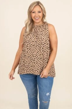 Enjoy a brunch get together in this cute top! This babe has a neutral color you can dress up or down and the leopard pattern is so fierce! We love the high neck ruffle collar that is so cute and the tank style that is perfect for spring! Style this cutie with some skinnies and sandals for the perfect look this season!