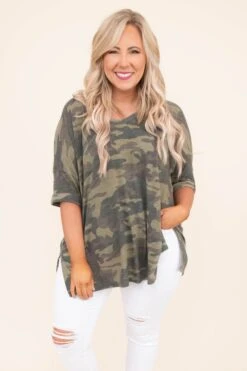 Camo for the win! This top is so on trend and perfect for an easy throw on out the door look! It is comfortable for all day wear, has an over sized fit to flatter every figure, and features a split side seam and v-neckline for the ultimate look! Pair this top with your favorite denim and sneakers a chic and edgy look!