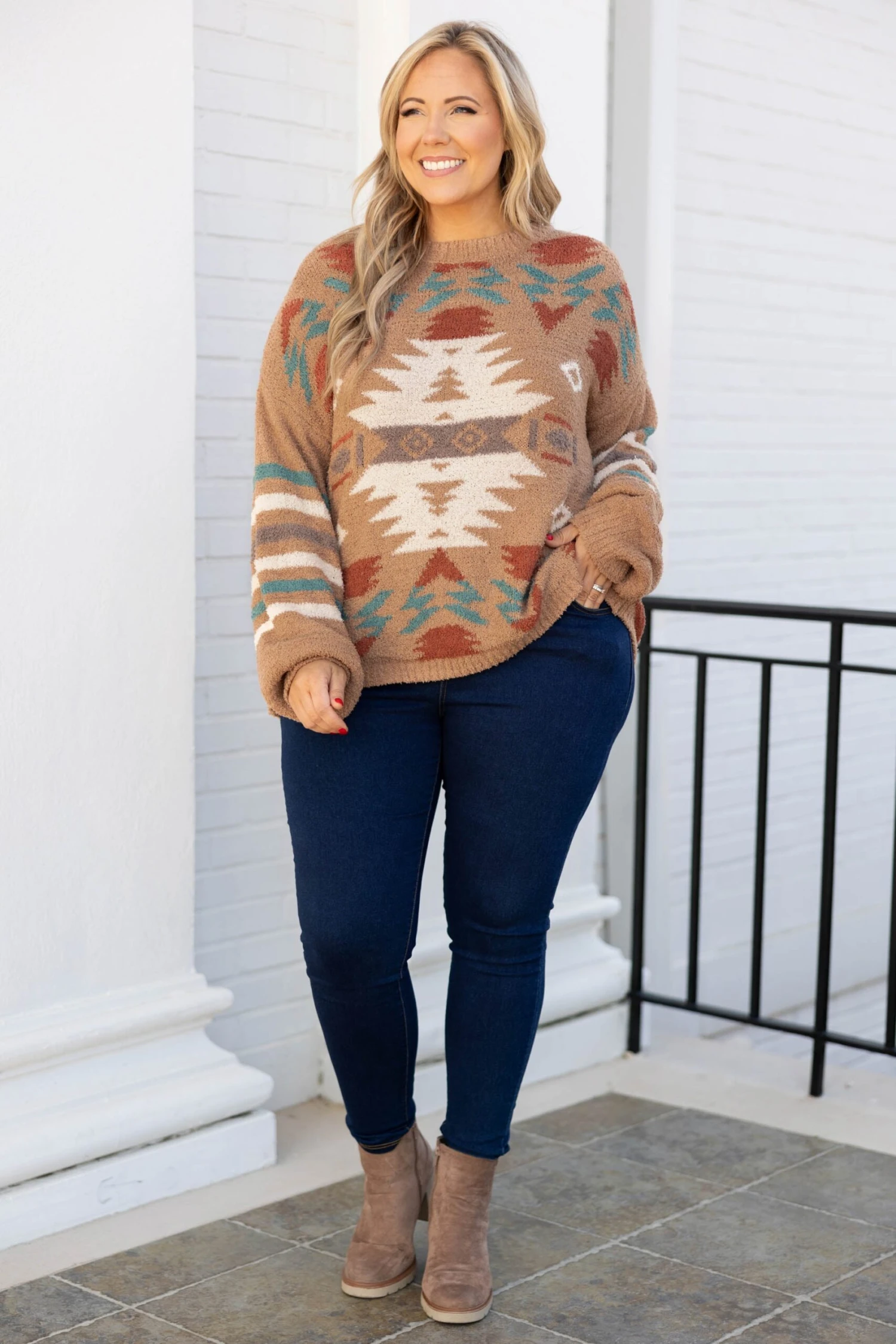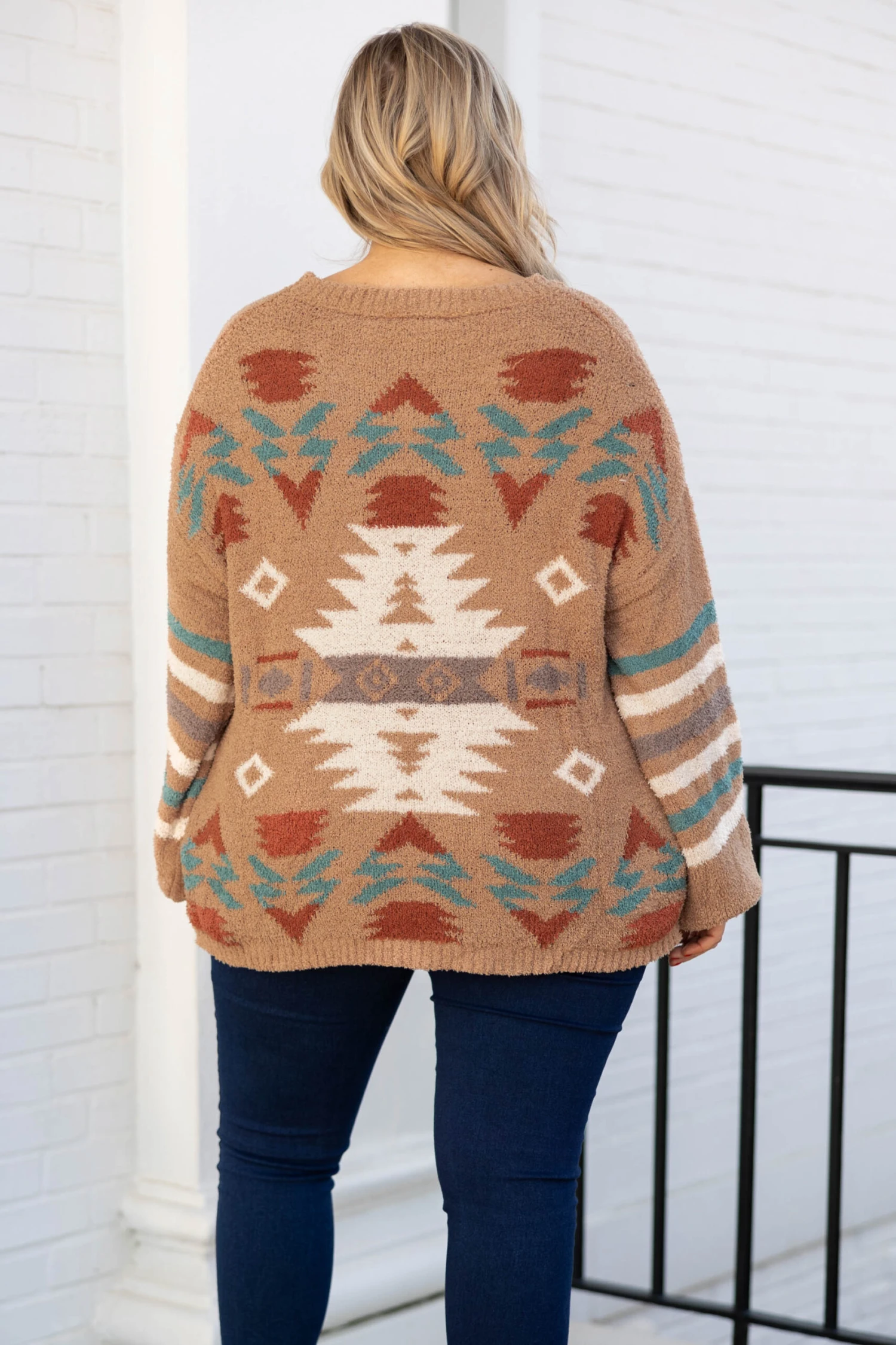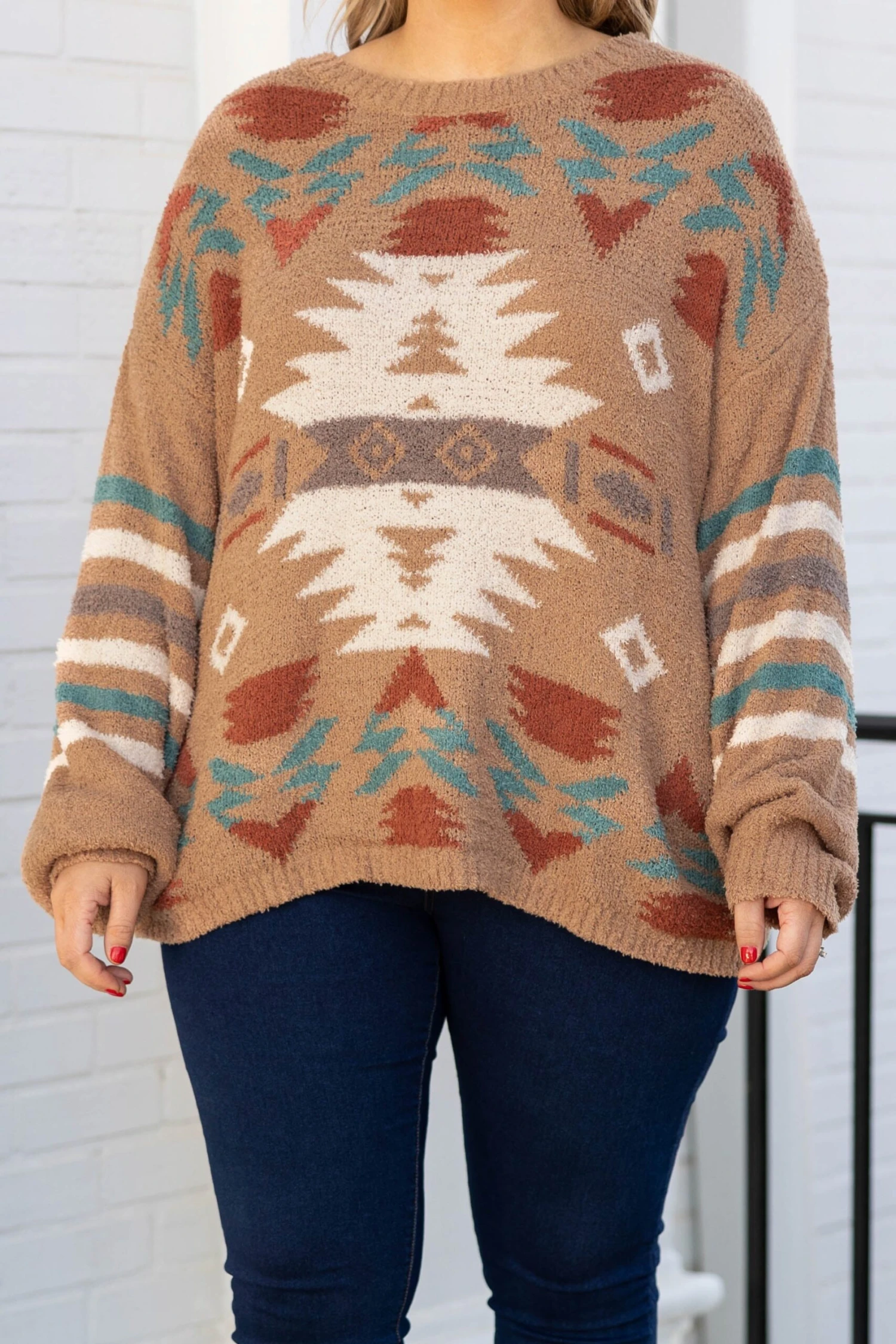 This sweater is calling your name! It has a neutral brown color with an Aztec pattern that is super sweet! It has the softest fabric and is super stretchy and cozy! Style this sweater with some jeggings or skinnies for a comfy casual look this season!