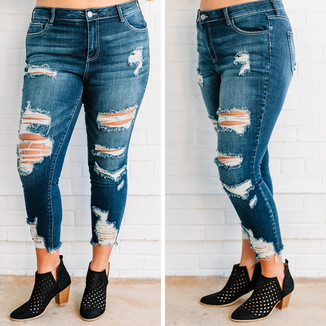 You will never need to say goodbye to these jeans! They are perfect in every way! These jeans have a classic dark wash and trendy distressing that is so easy to dress up or down! They have a comfortable fit and look good on every figure! We see these jeans paired with a cute top and jacket and cool sneakers! Add your favorite jewelry and you are good to go!Â
