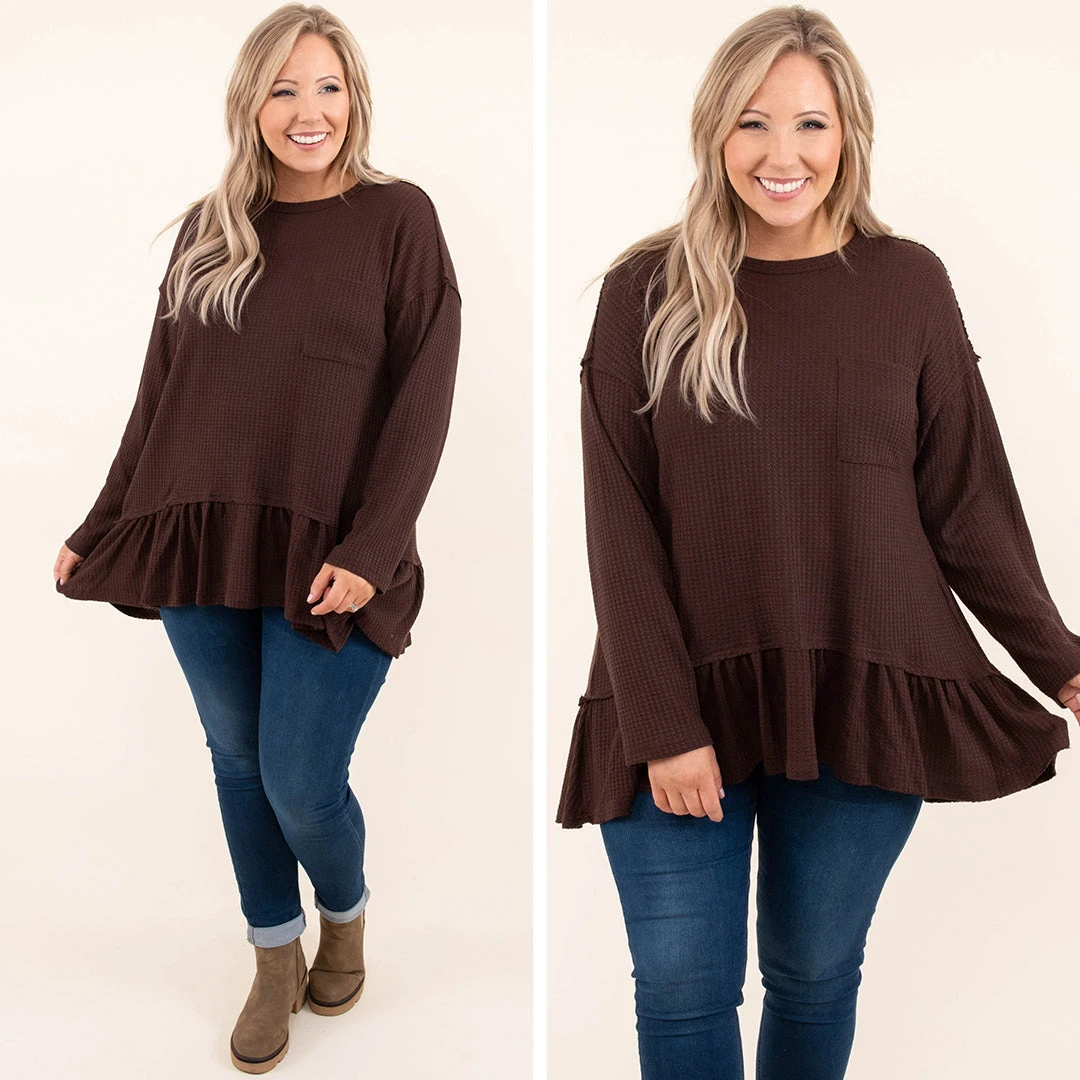 You can have so much fun in this tunic! It has a gorgeous chocolate brown color with a flirty ruffle along the bottom. Style with jeans and booties for a chic look this season!