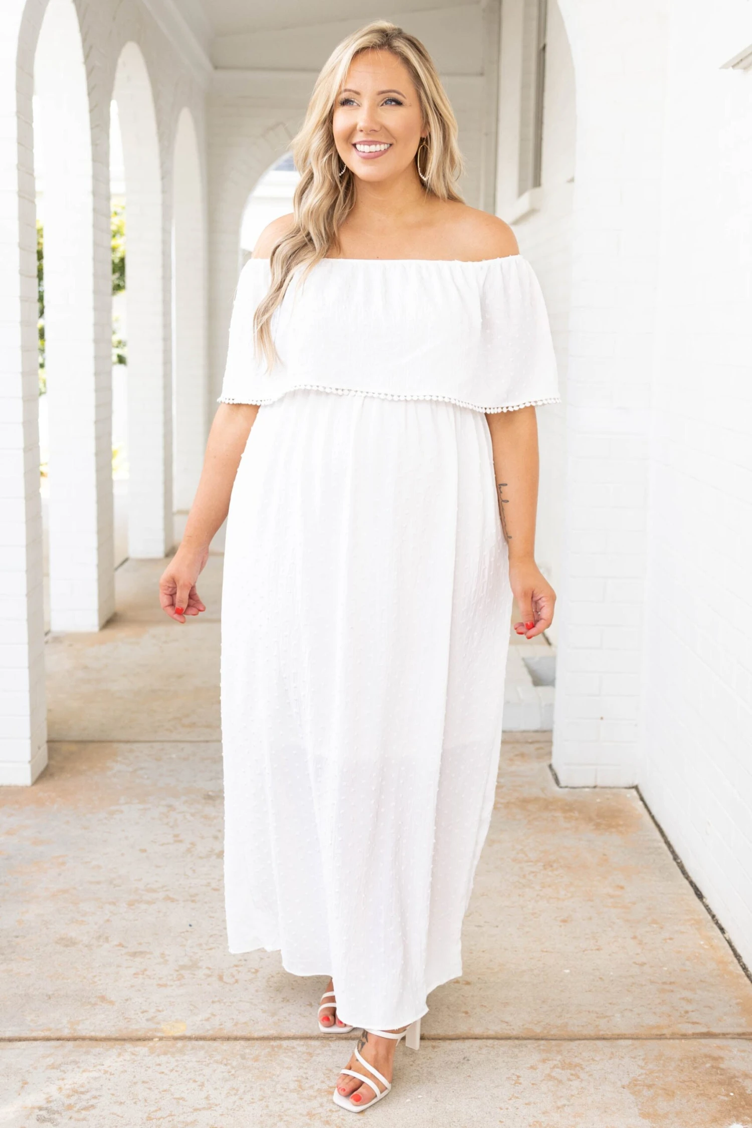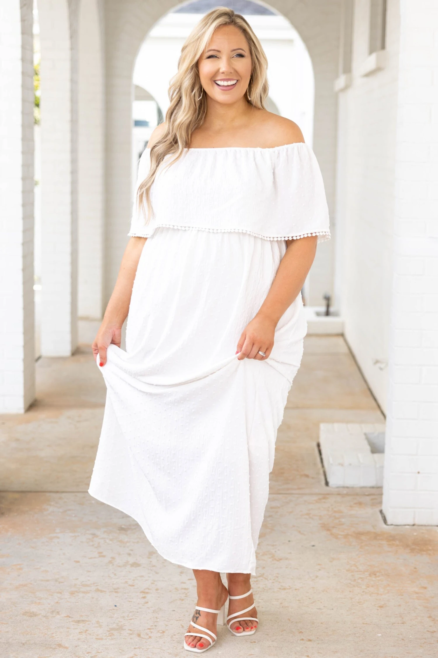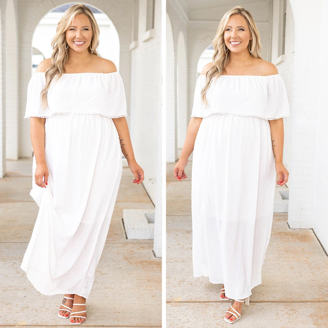Get carried across the threshold in this dress! The white color is so fresh and bright and the raised dot pattern is so stylish! We love the embroidered details on the off-the-shoulder neckline that give this a fun pop! Style this with some sandals for a super cute look!