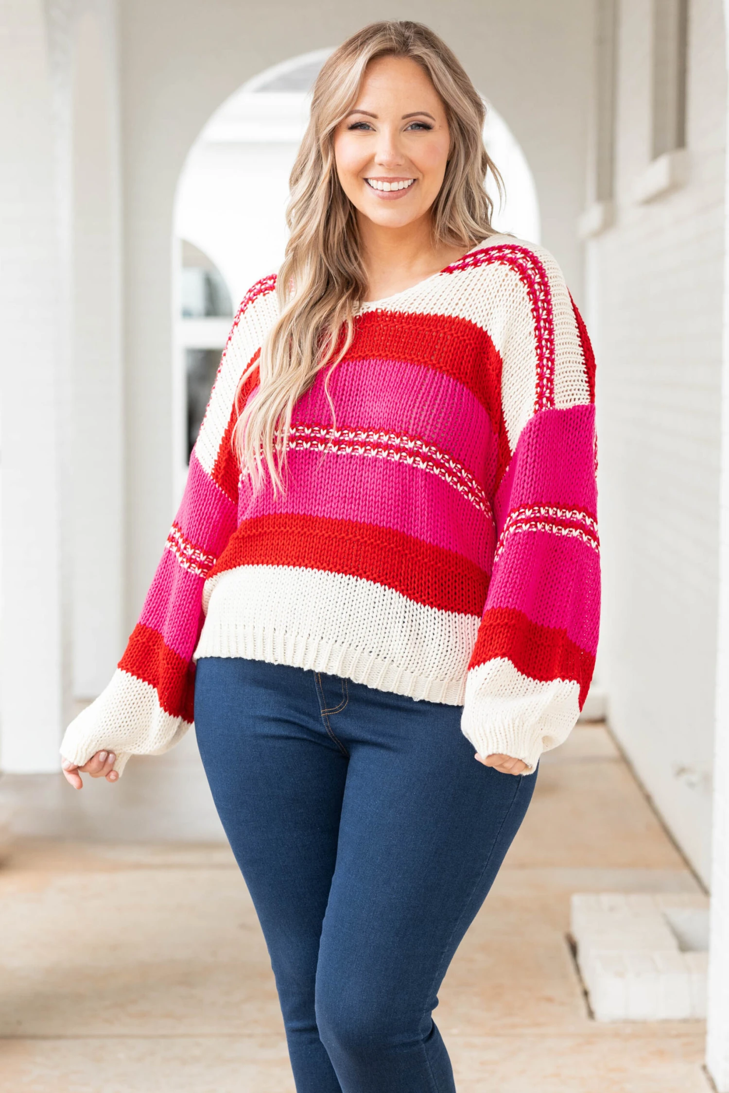 You can catch flights and feelings in this mesmerizing sweater! This sweater has a fierce hot pink color with a colorblock design that is a season favorite! The bubble sleeves and knitted style is great for pairing with skinnies and wedges for a classic chic look!