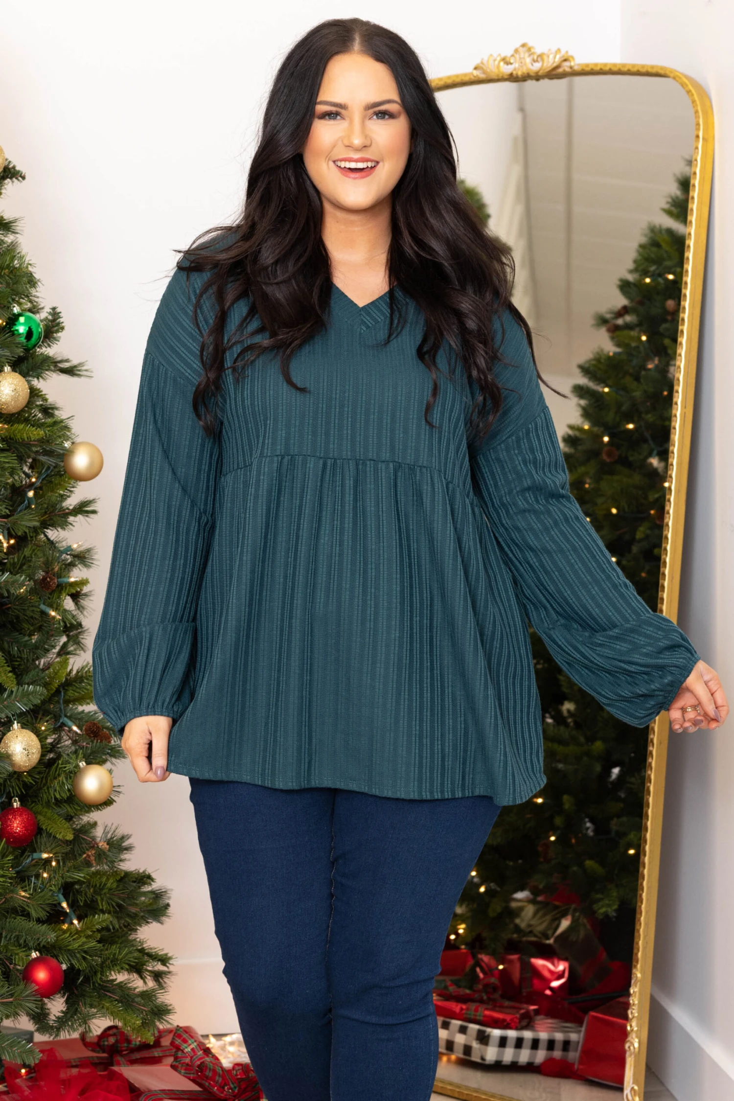 This top is such a vibe! This top has a textured design with a hunter green color and babydoll style that you can dress up or down and style for every occasion! It’s comfortable for all-day wear, has a figure-flattering fit, and features the cutest bubble sleeves for the ultimate trendy look! Style this top with skinnies and heels for an easy everyday outfit!Â