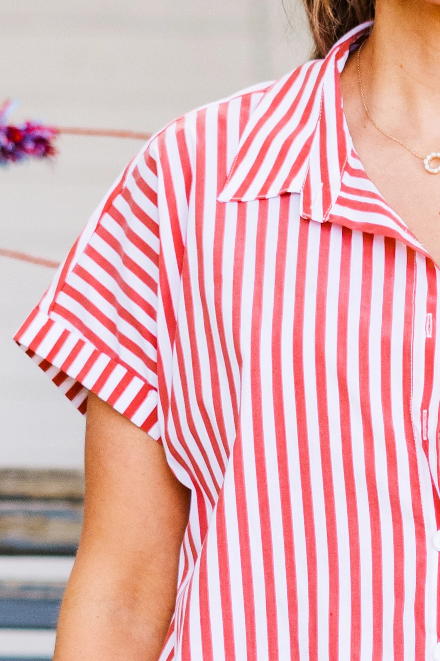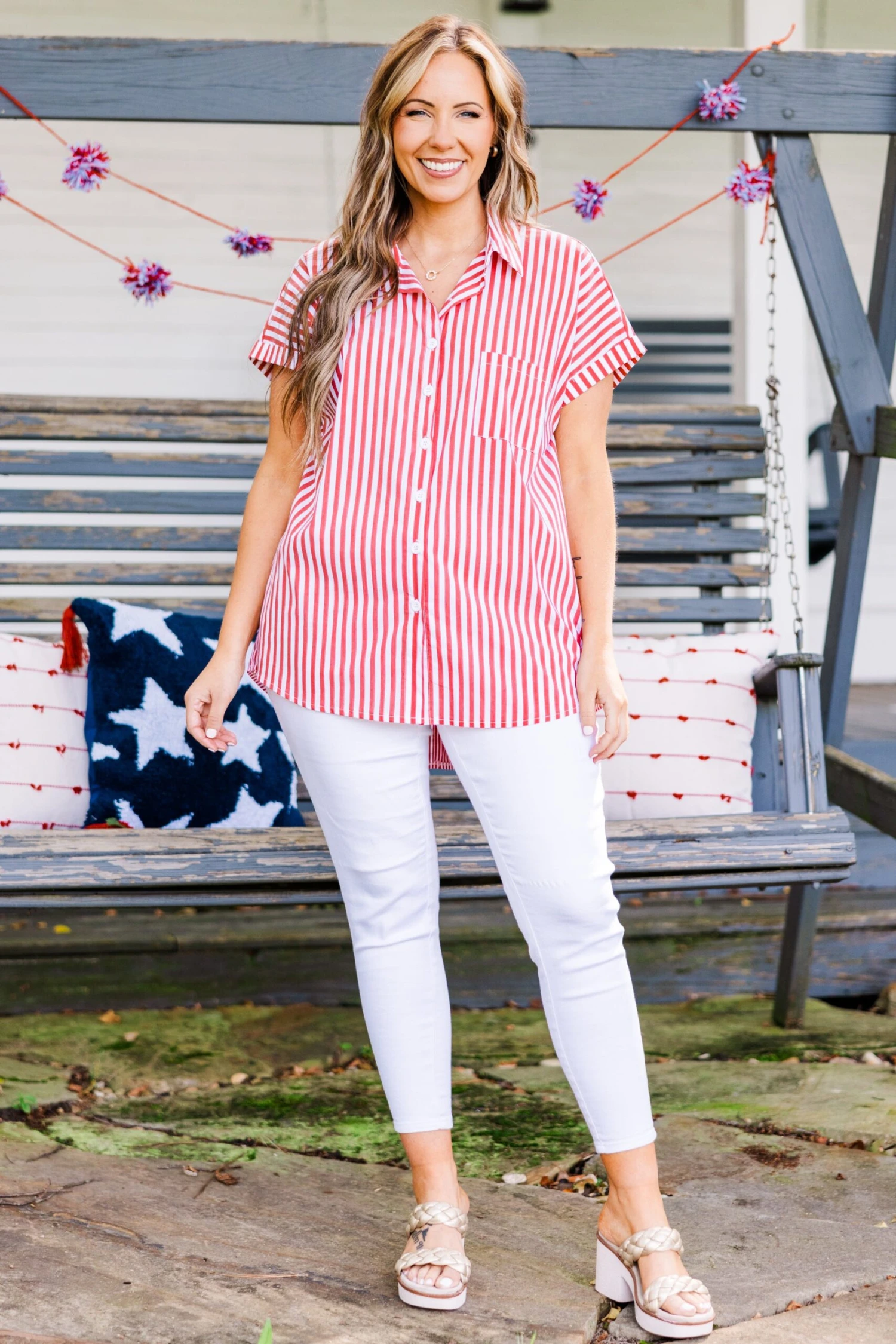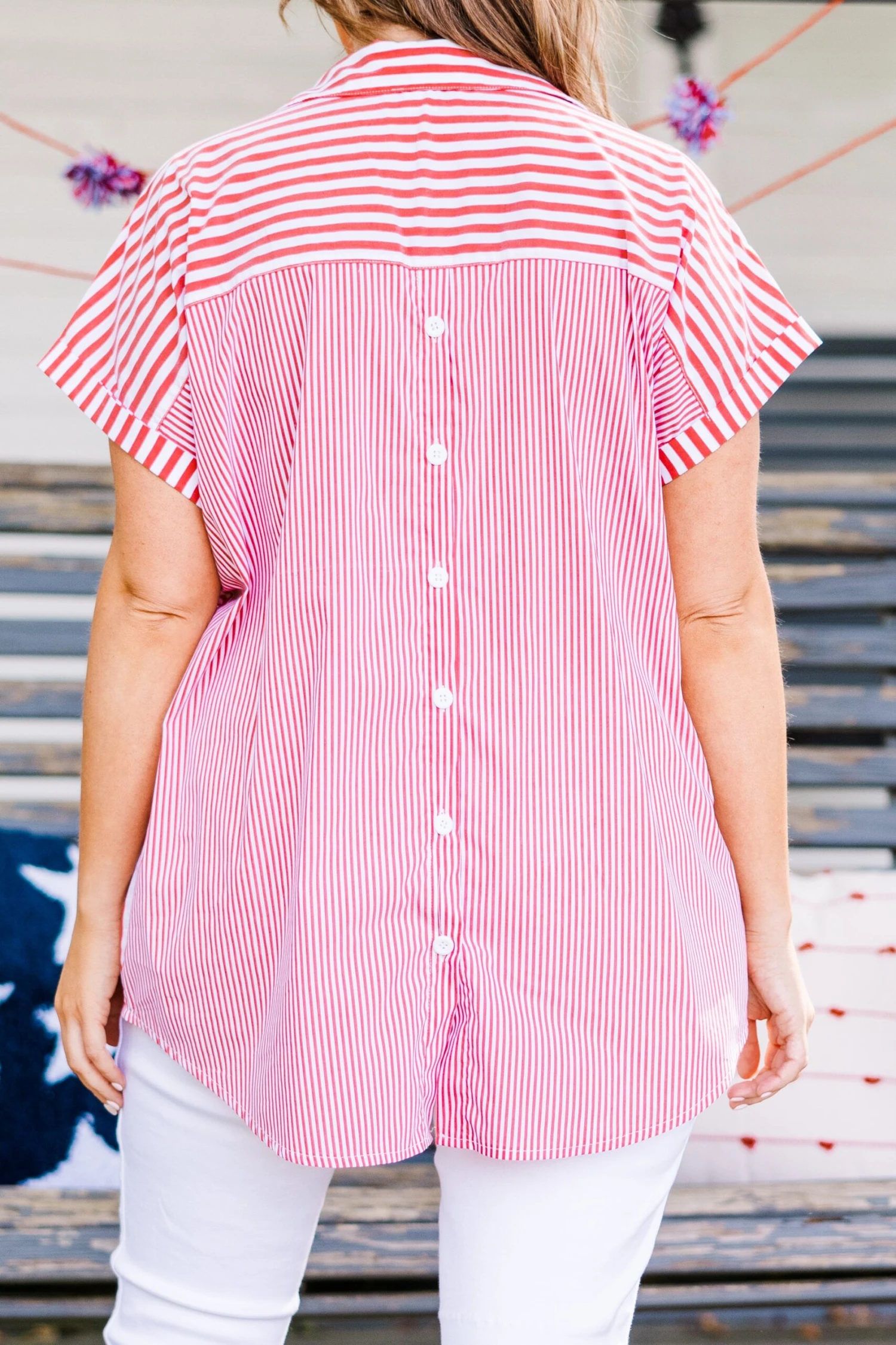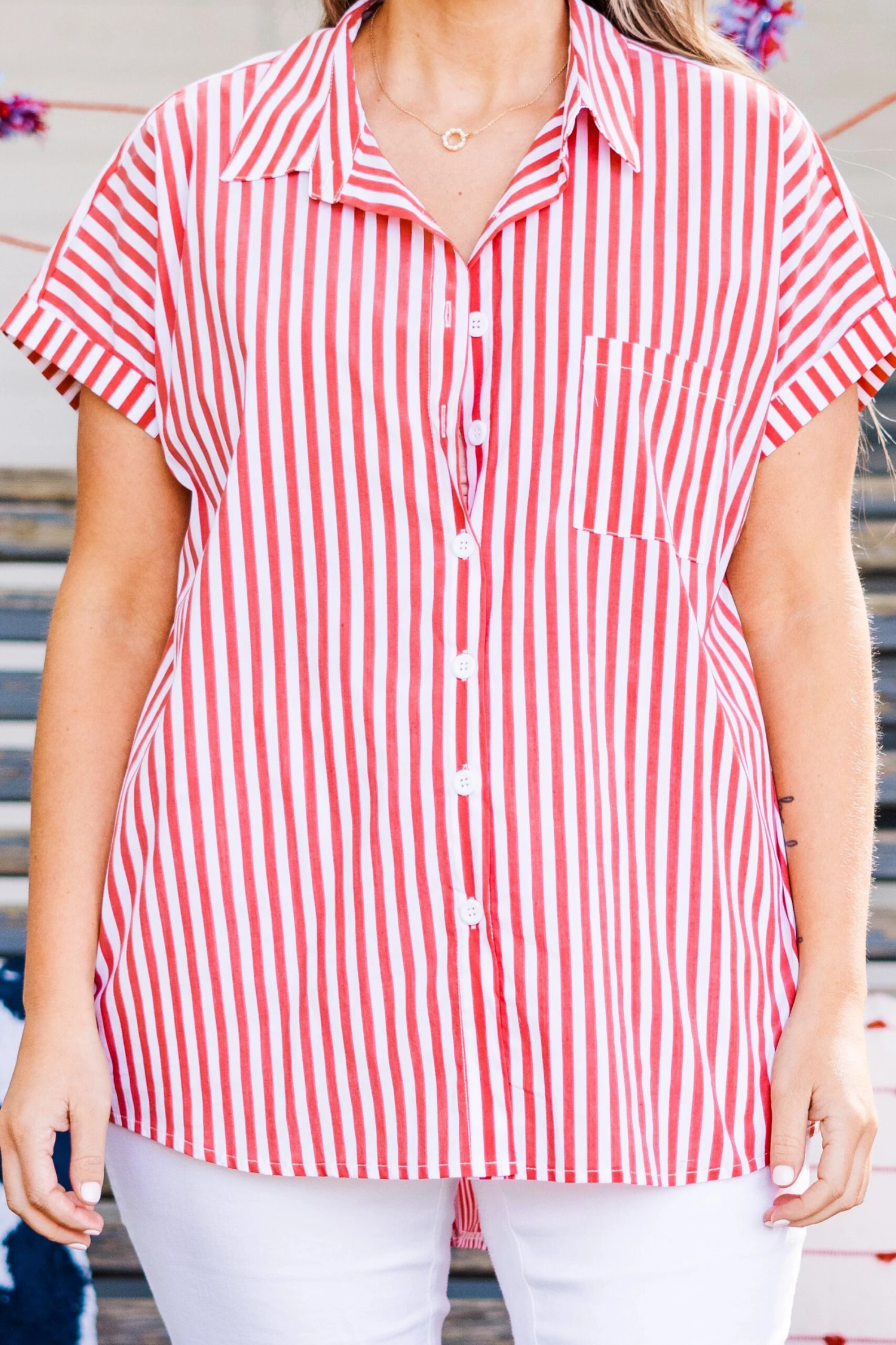 Elevate your style with our Celebrate Today Top, in festive red and ivory stripes! Featuring a high-low hemline, functional buttons, and cuffed sleeves, it’s perfect for any occasion! Pair with blue or white denim for a patriotic 4th of July look!