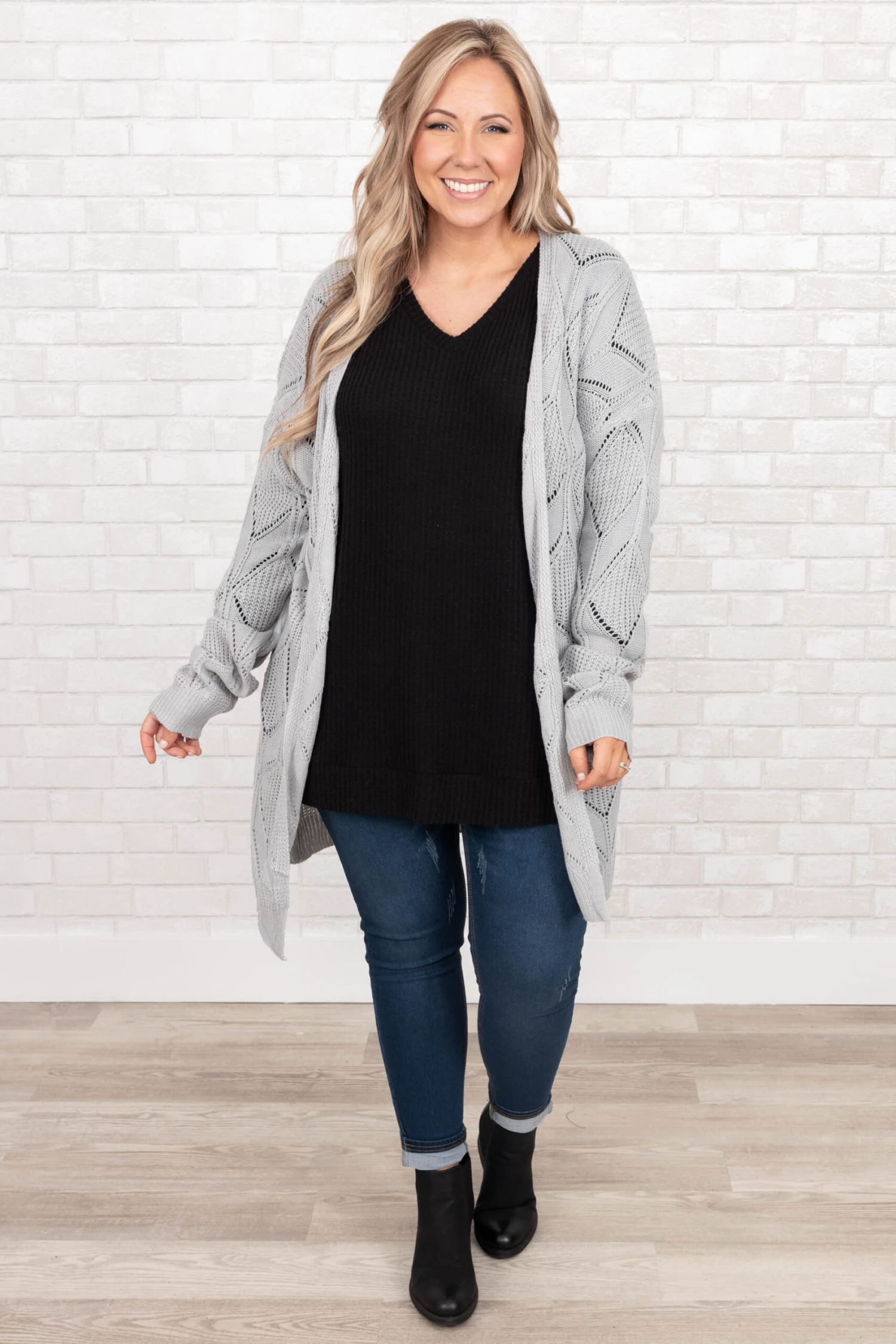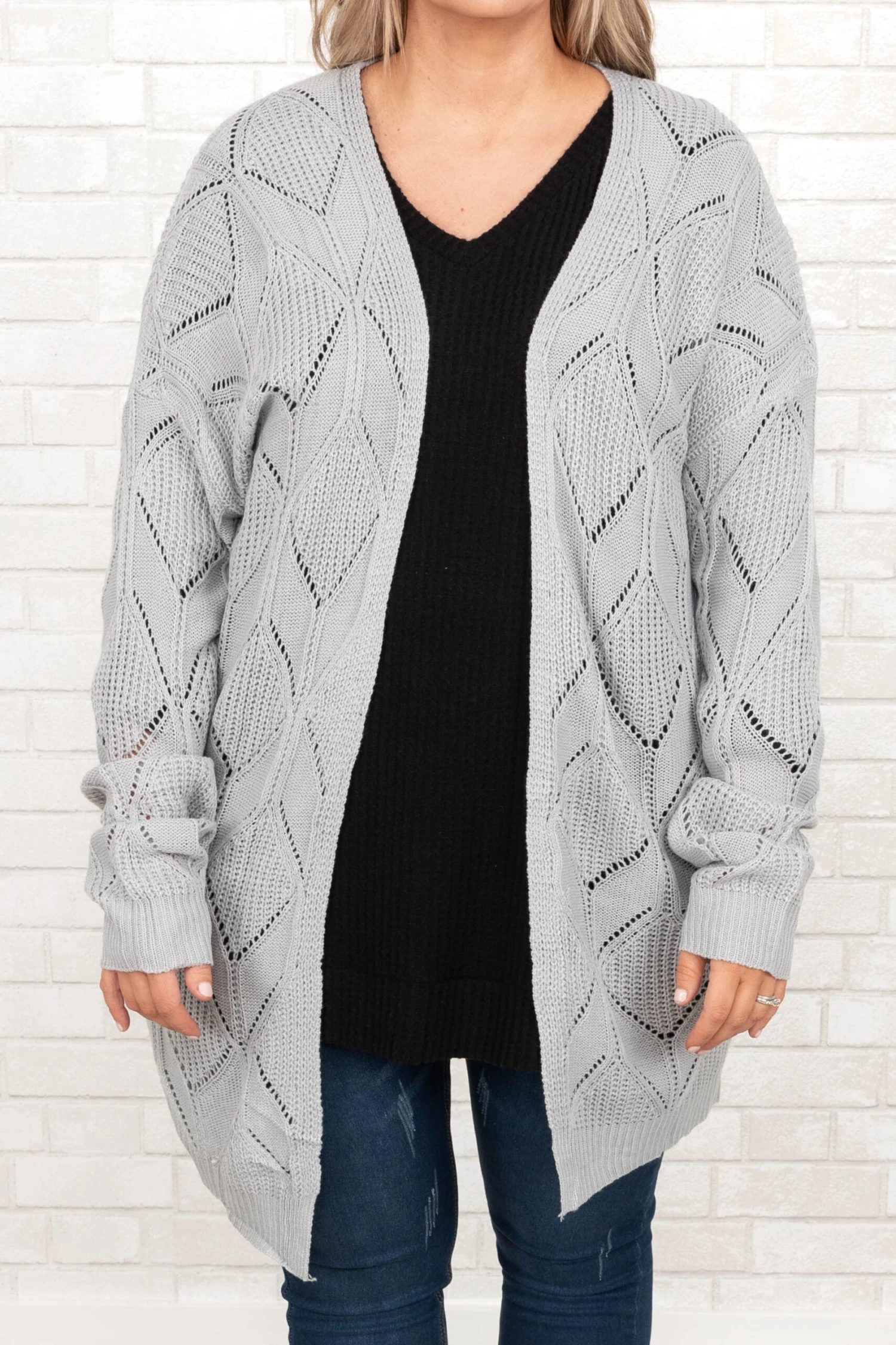Channel your inner bliss with this gorgeous cardi! This cardigan has a soft gray color and a knitted design that is just in time for the season! The flowy, cozy fit is perfect for layering over all of your faves! Style this cardigan with a solid top or patterned dress for a classic chic look!