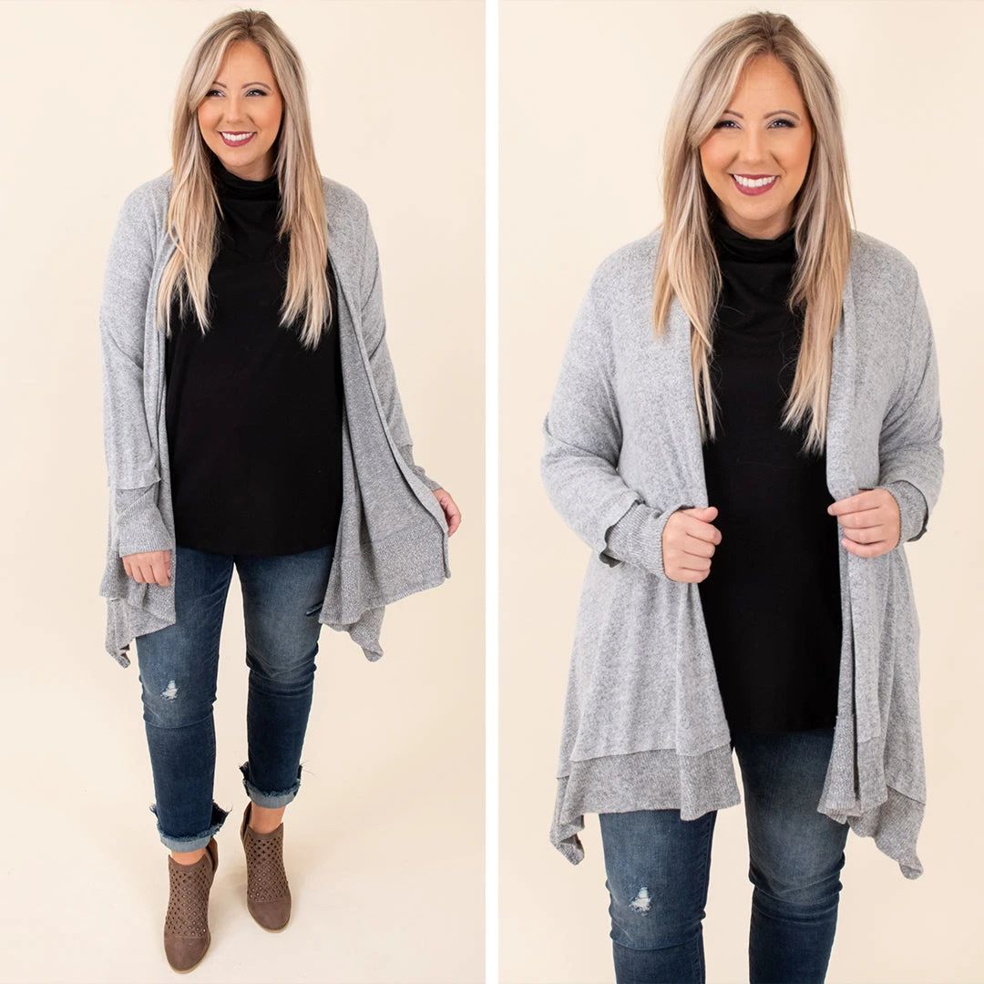 Everyone will be chasing you down asking where you got this cardigan! This cardigan has a solid gray color you can dress up or down and style with everything in your wardrobe! This cardigan has heathered detailing that is dreamy and a shark bite hem that will bring a pop of fun to your wardrobe! Layer this cutie over a patterned top for a stylish and super cozy outfit!