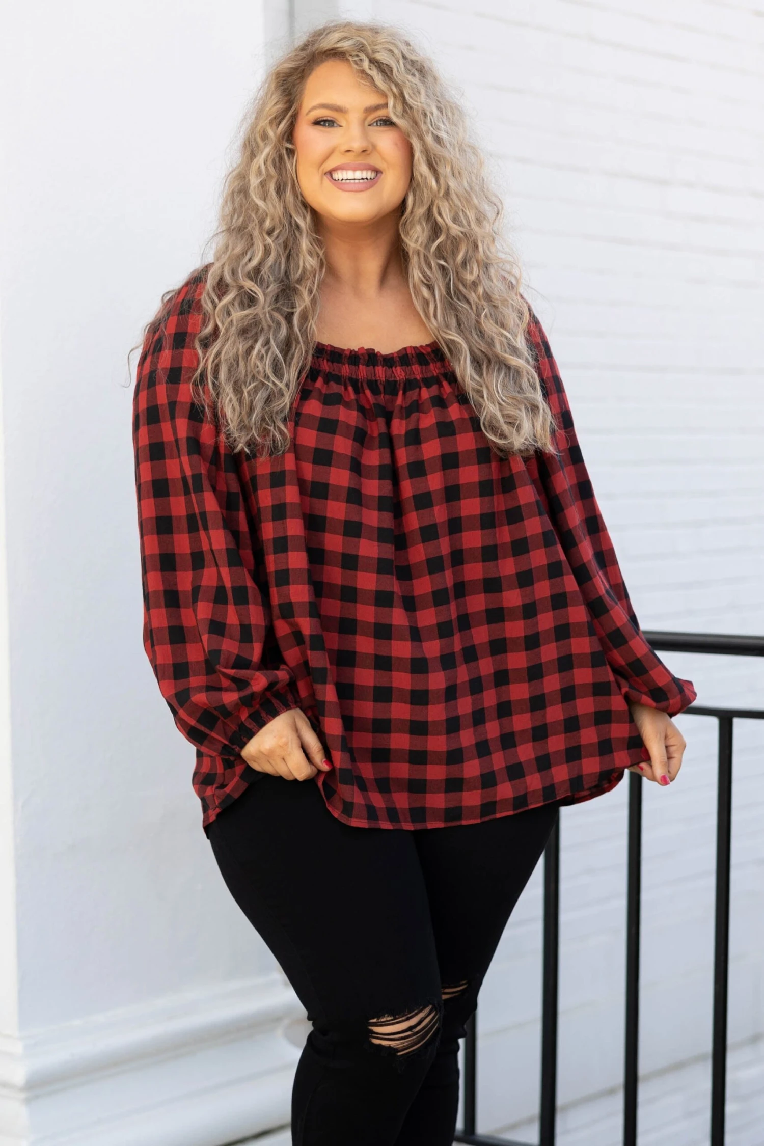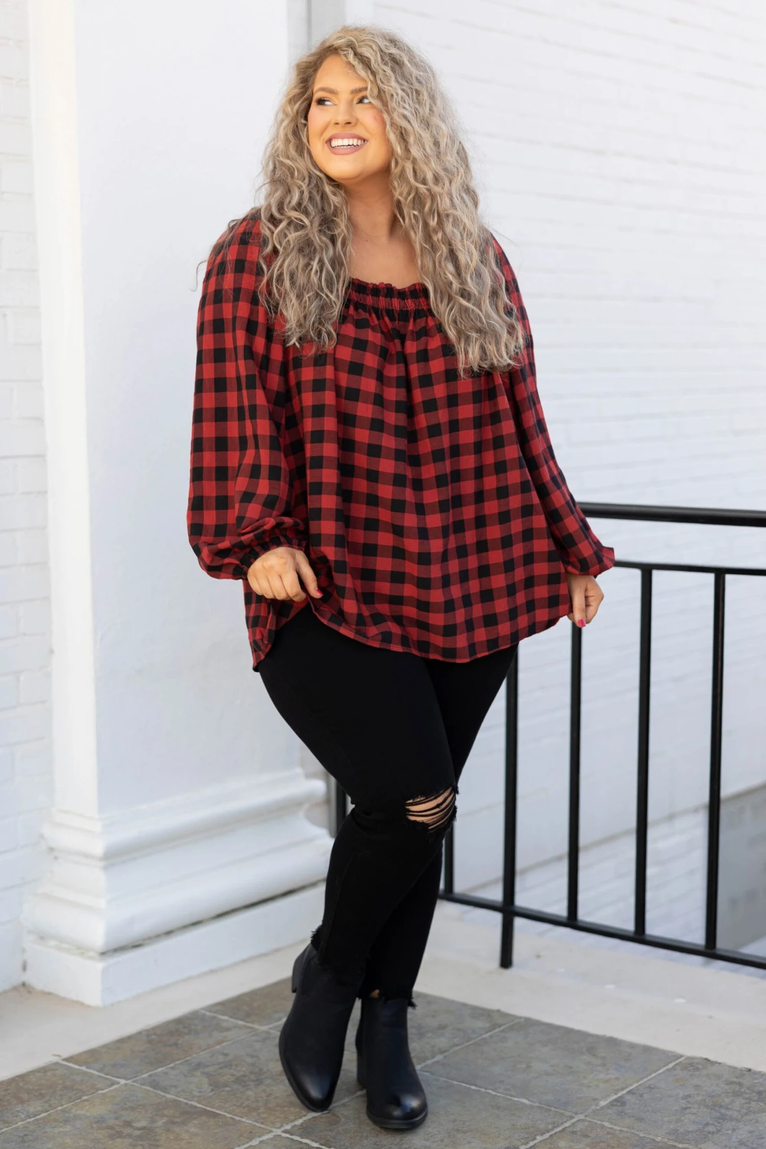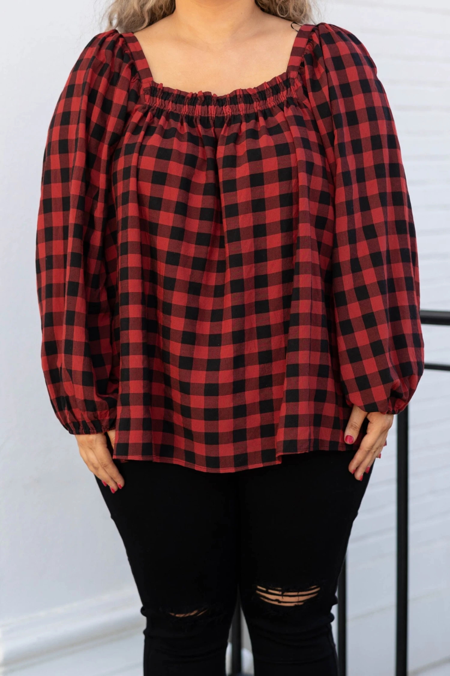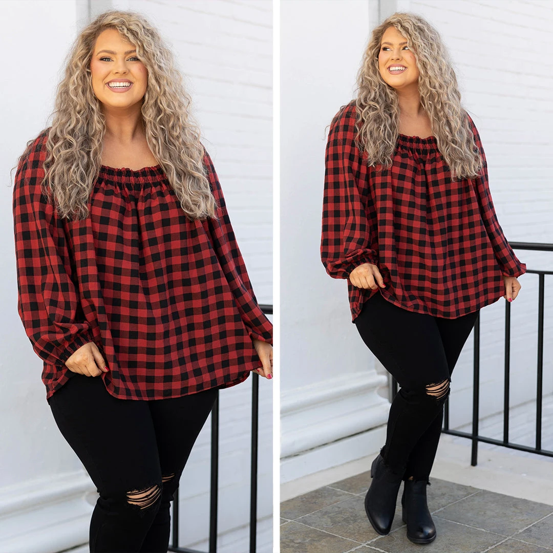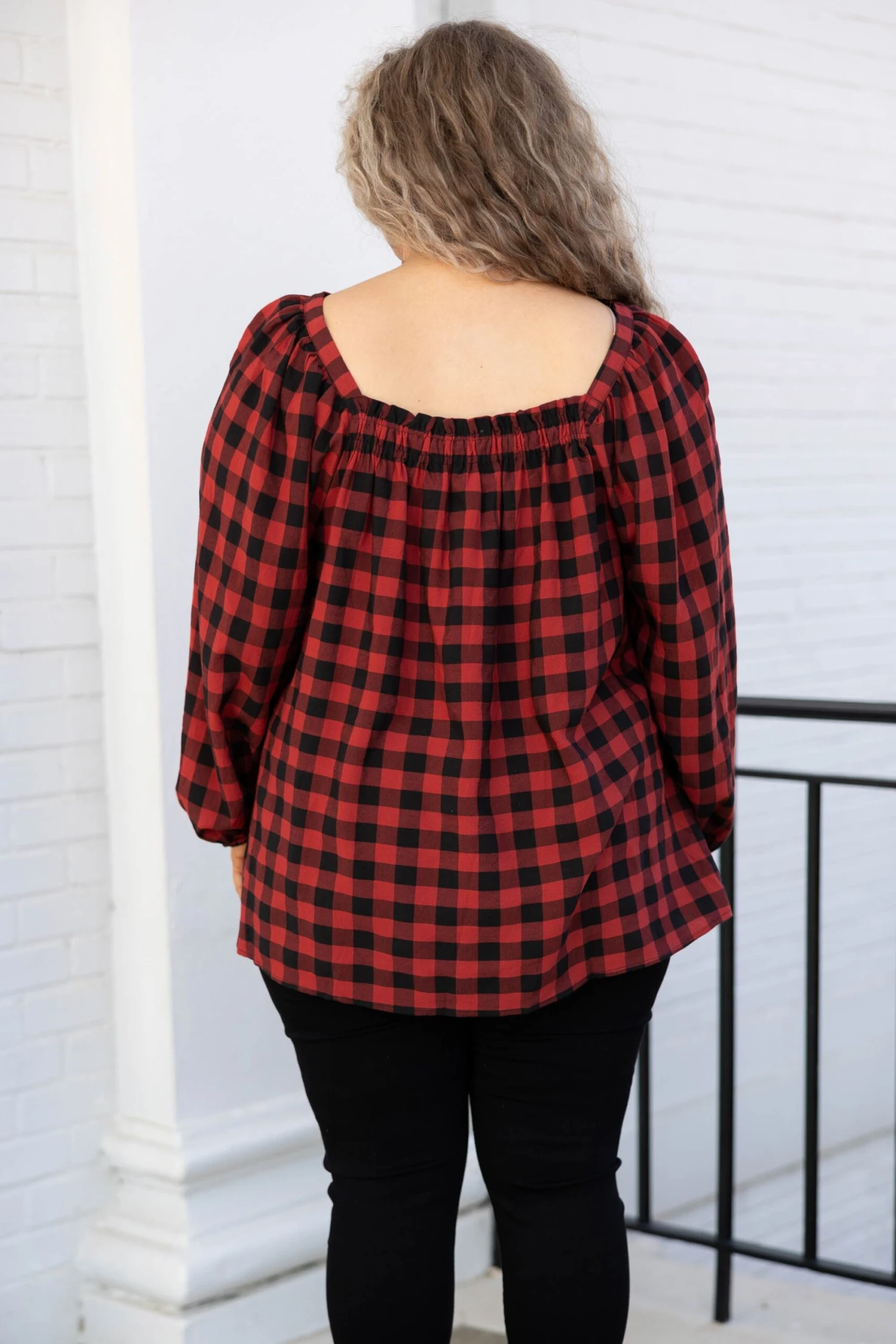 Every moment in this top will be a cheerful one! This top has a bold red color and a plaid pattern that is a season favorite! The smocked neckline and flowy fit is perfect for all day wear! Style this top with some distressed skinnies and booties for an everyday chic look!
