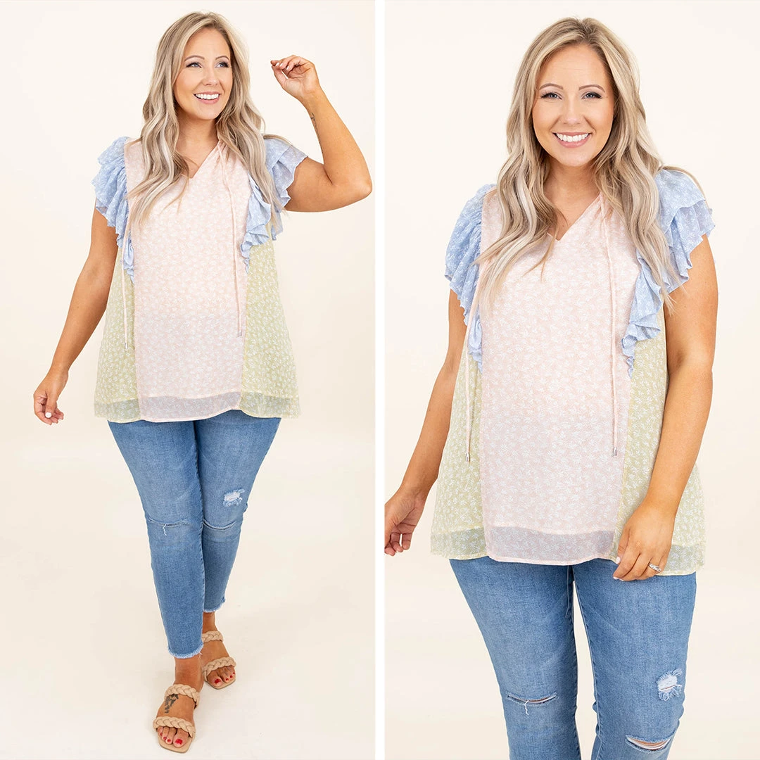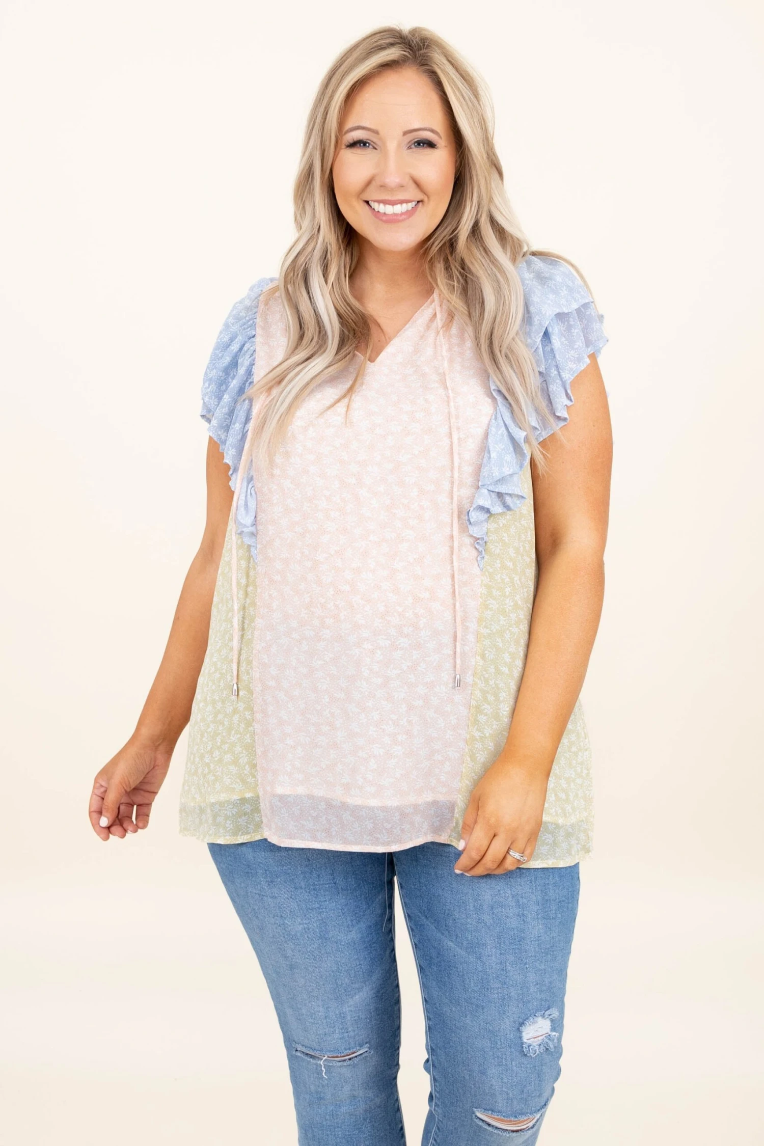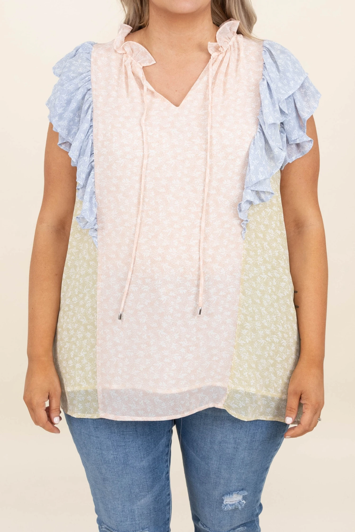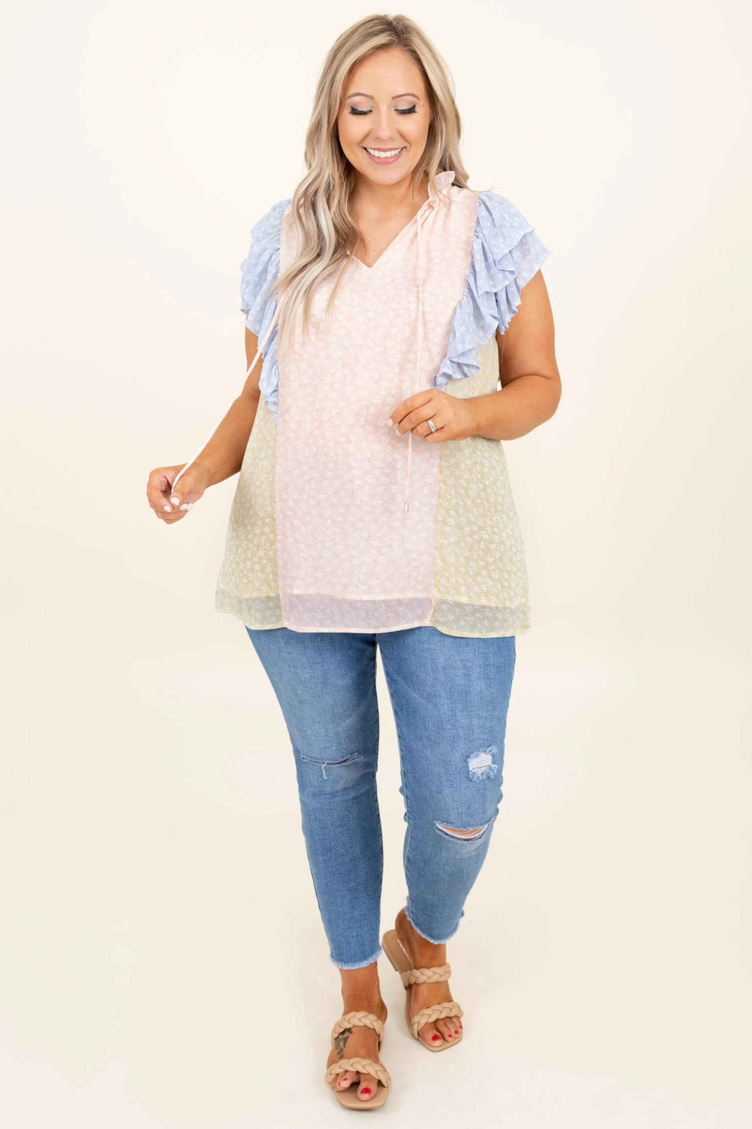 Choose yourself in this top! The colorblock floral pattern is so trendy and the ruffle sleeves are so sweet! The ruffle at the collar with the tie is so chic and the neutral peach colors are easy to match with everything! Style this with skinnies and sandals for a super stylish look!