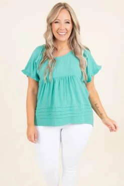 Get in on the coastal trend with this top! The emerald color reminds us of turquoise ocean waters and the linen look is perfect for a beachy vibe! The babydoll style is so flattering and the line design at the bottom is super unique! Style this with white jeans and gold wedges for beachy chic look!