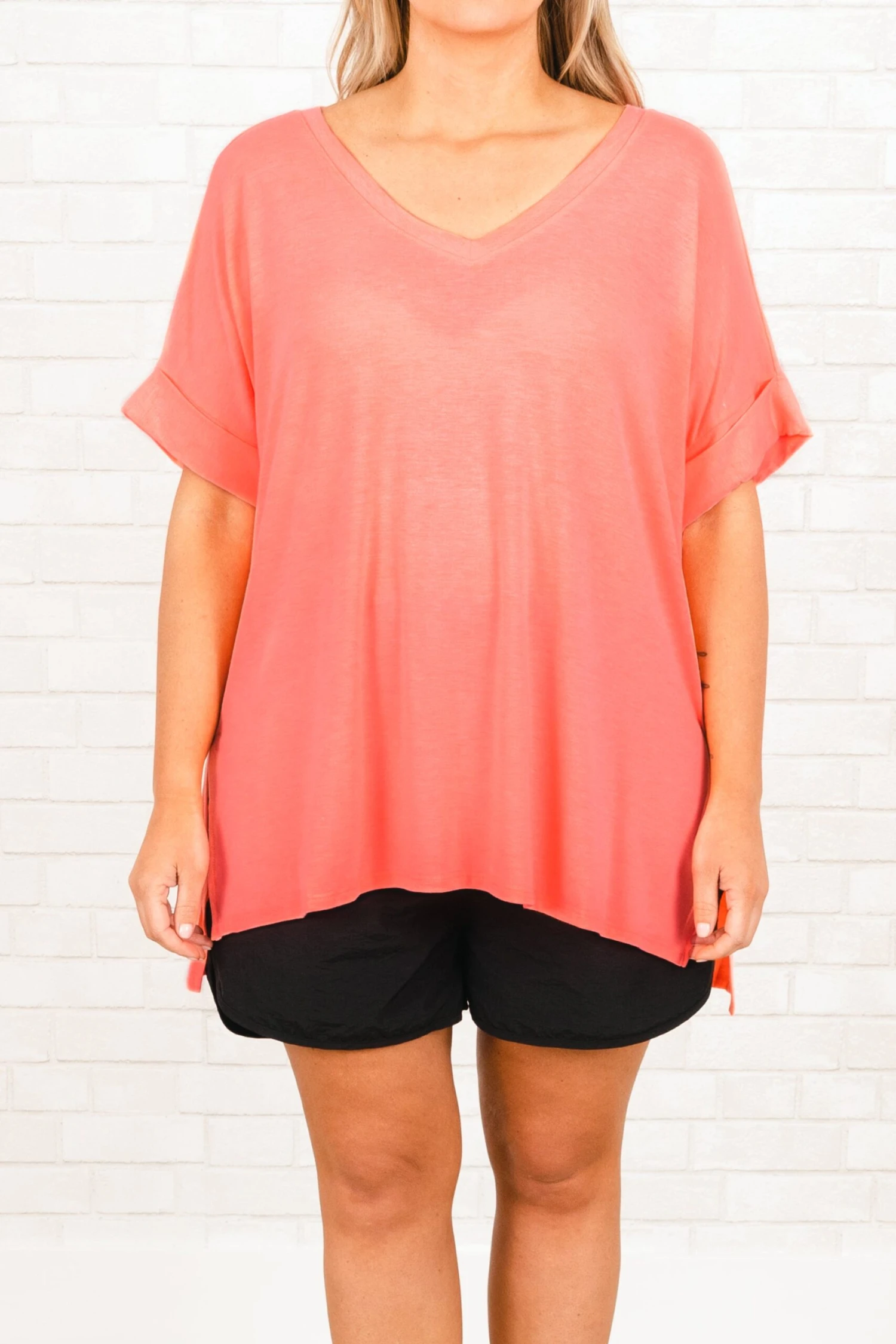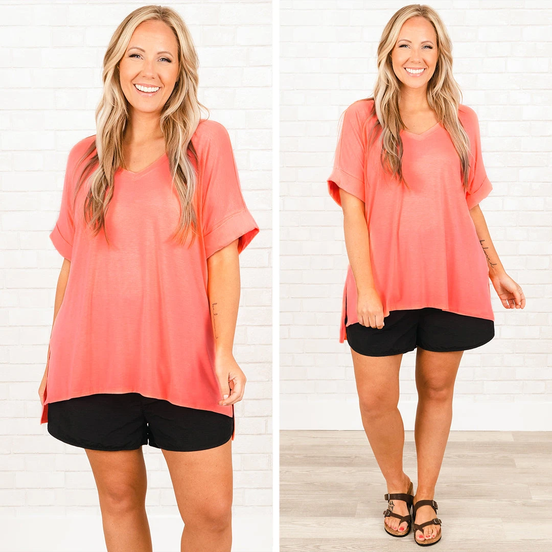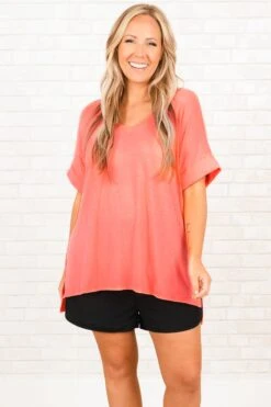 Travel comfortably in this cute top! It’s a solid neon peach top that is a closet staple! It has a relaxed fit and super soft fabric that will keep you comfy from day to night! Throw it on with skinnies and sandals for your next adventure!