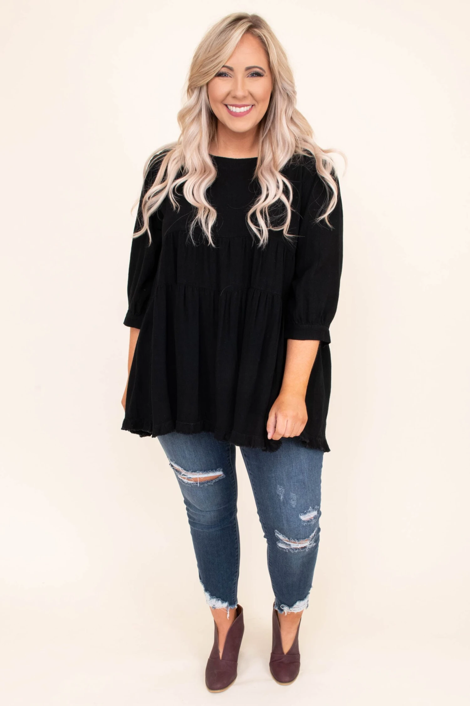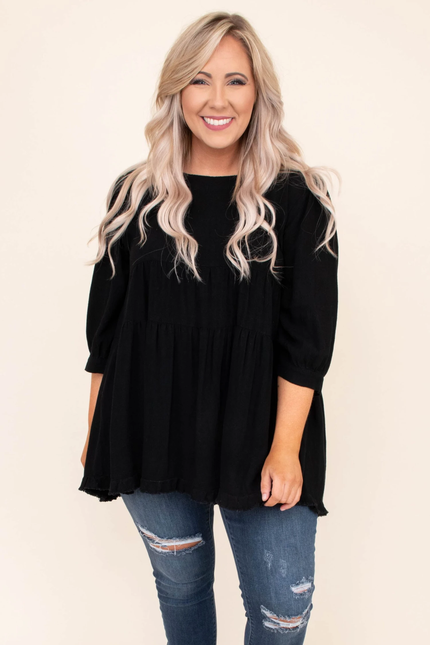 This top was made for date night! It has a pretty black color you can dress up or down and style with everything in your wardrobe! It’s comfortable for all night wear, has a relaxed baby doll fit to flatter your figure, and features the cutest ruffled hemline! Pair this top with skinnies and booties for an effortlessly chic outfit!Â