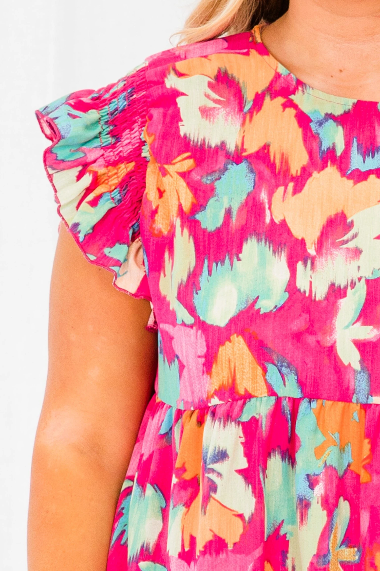 Indulge in the vibrant energy of the Dancing In The City Dress! Adorned with flutter sleeves and convenient pockets, this fuchsia mint dress boasts an abstract floral pattern that will turn heads! Don’t just wear fashion – make a statement!