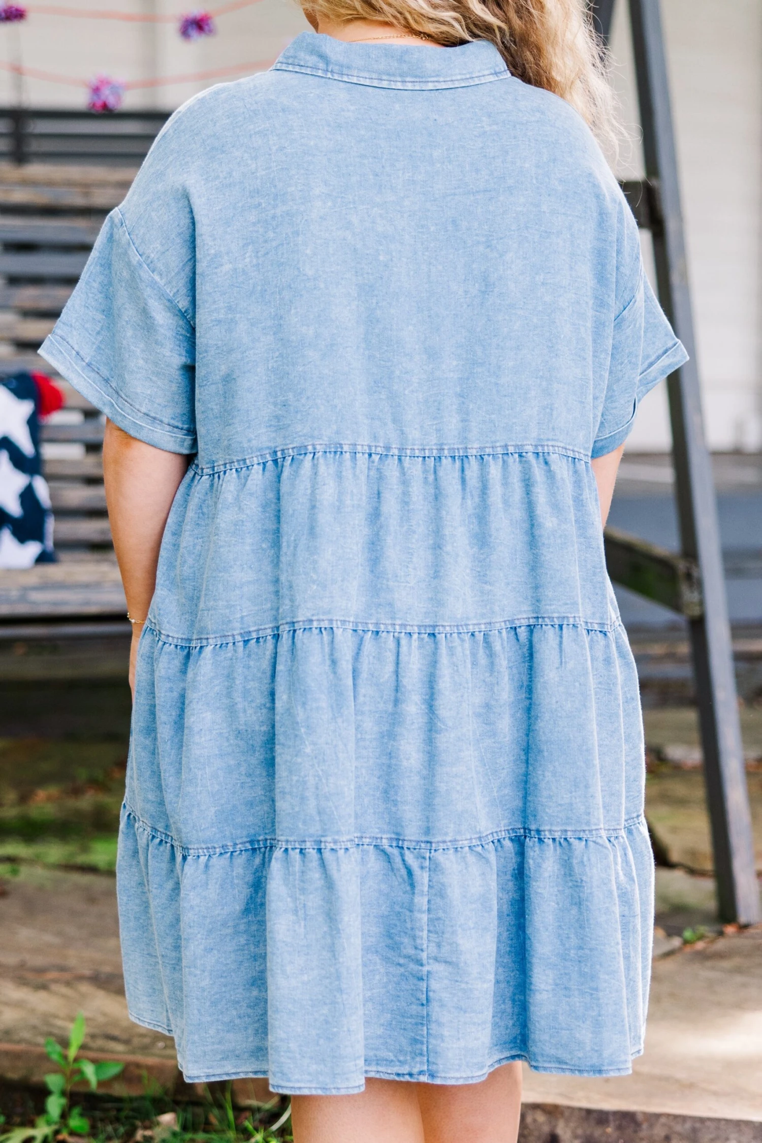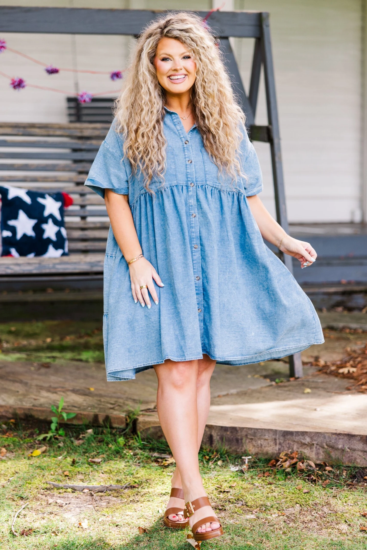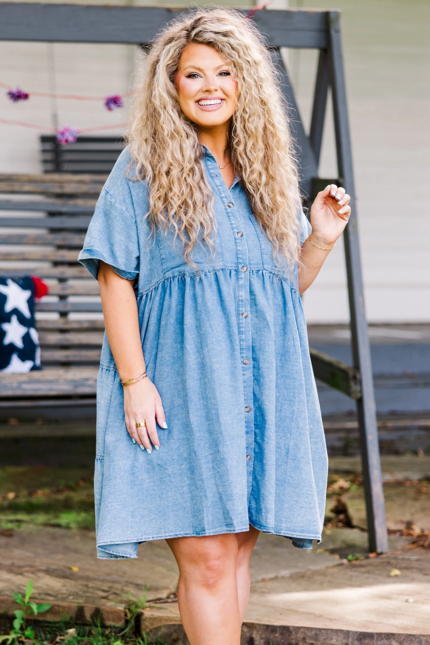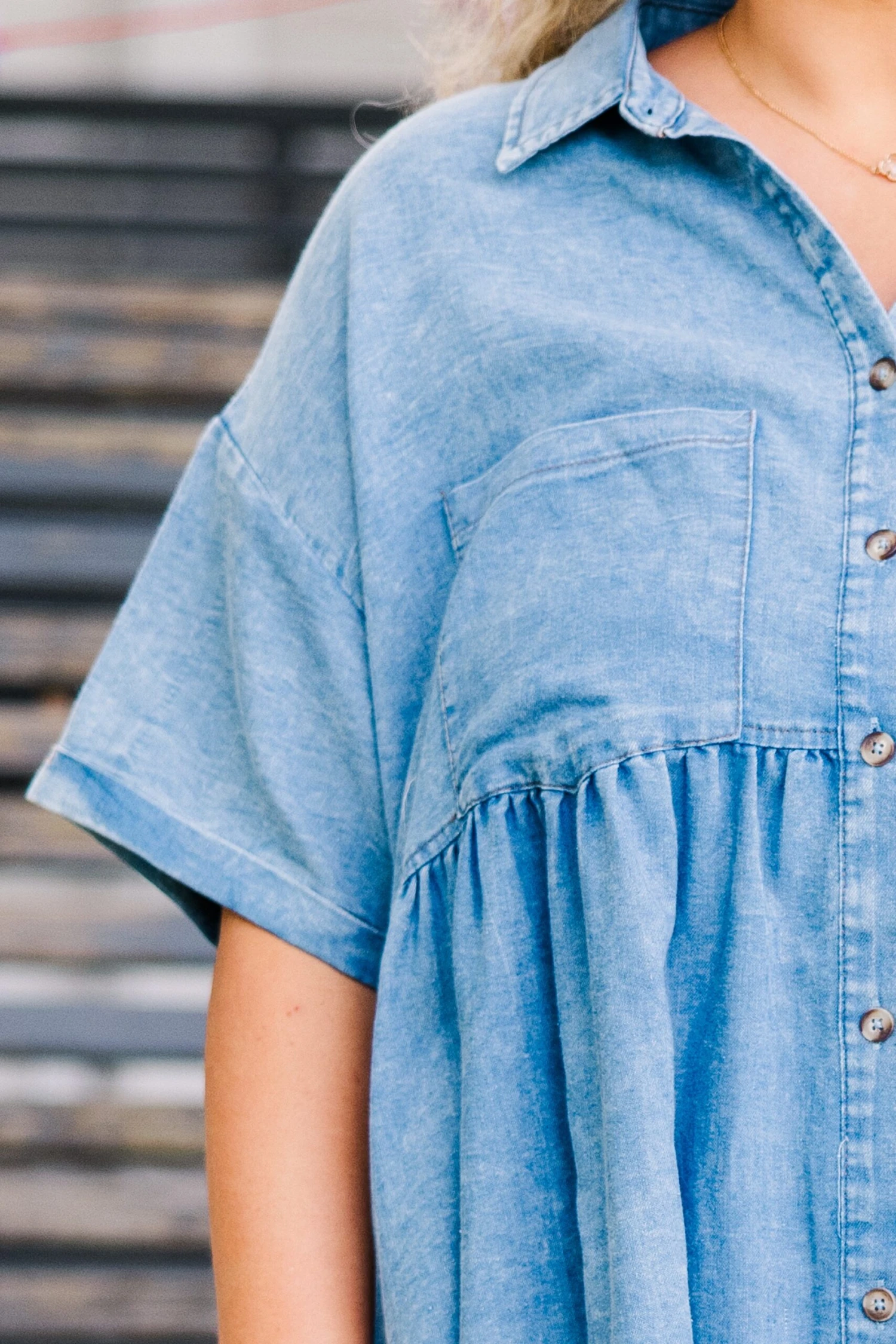 Introducing the Darling Denim Babydoll Dress in medium wash! Featuring a flattering babydoll silhouette and functional buttons, this dress is perfect for any occasion! Pair it with your favorite cowboy boots or heels for a versatile and stylish look! Upgrade your wardrobe with this must-have piece!