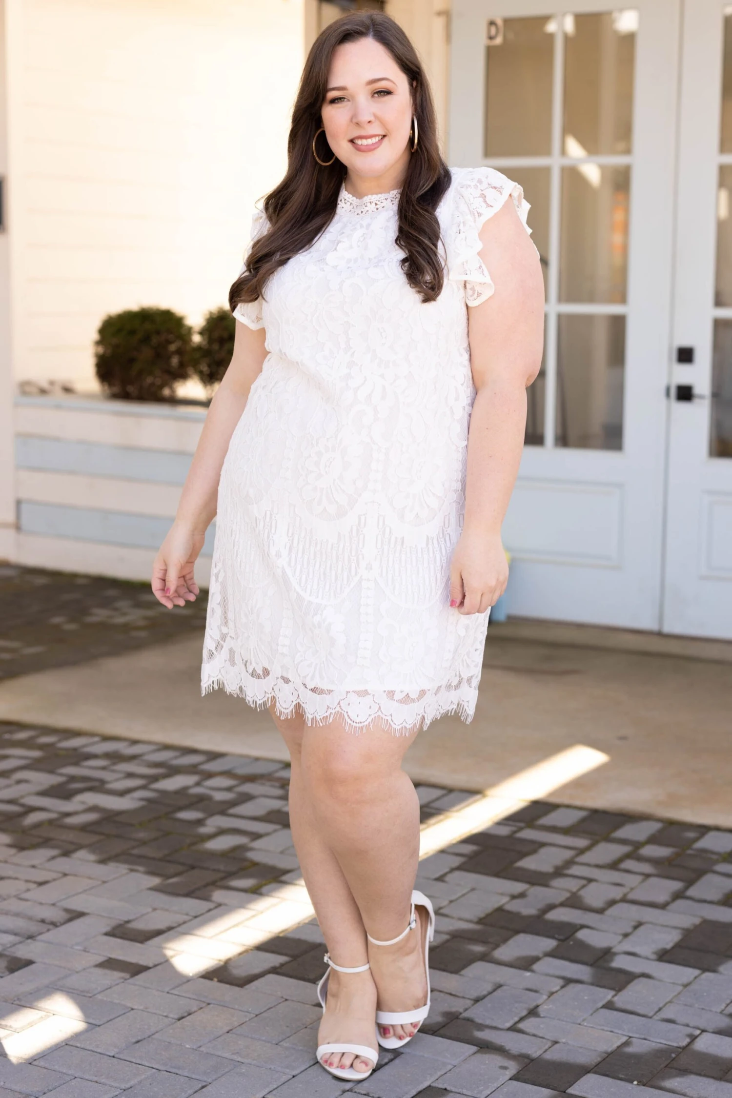 This is the perfect dress for a date night out on the town! The lace is so stunning and the white color is so perfect for warm weather! This cutie has a fringed bottom and a super sweet high neck look that we love! The flutter sleeves are so delicate and the keyhole button in the back is a little flirty touch! Style this dress with some white heels and a fun accessory for the perfect look!