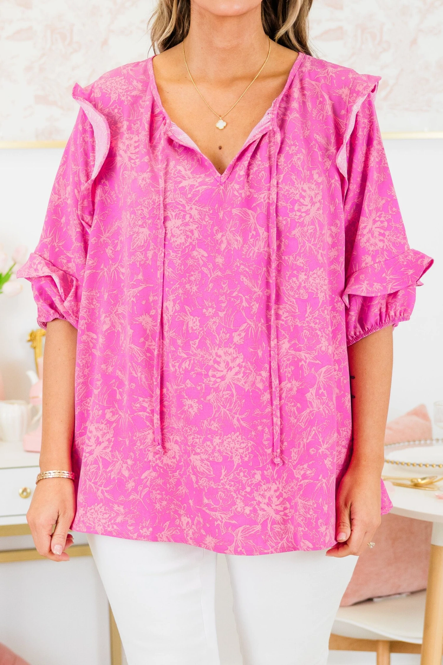 Get ready to fall in love with this top! This playful magenta top features a unique split v-neck design and elastic puff sleeves with charming ruffle detailing! The vibrant floral print adds a touch of whimsy, while the adorable tassels add a fun finishing touch! You’ll be ready for any adventure in this top!
