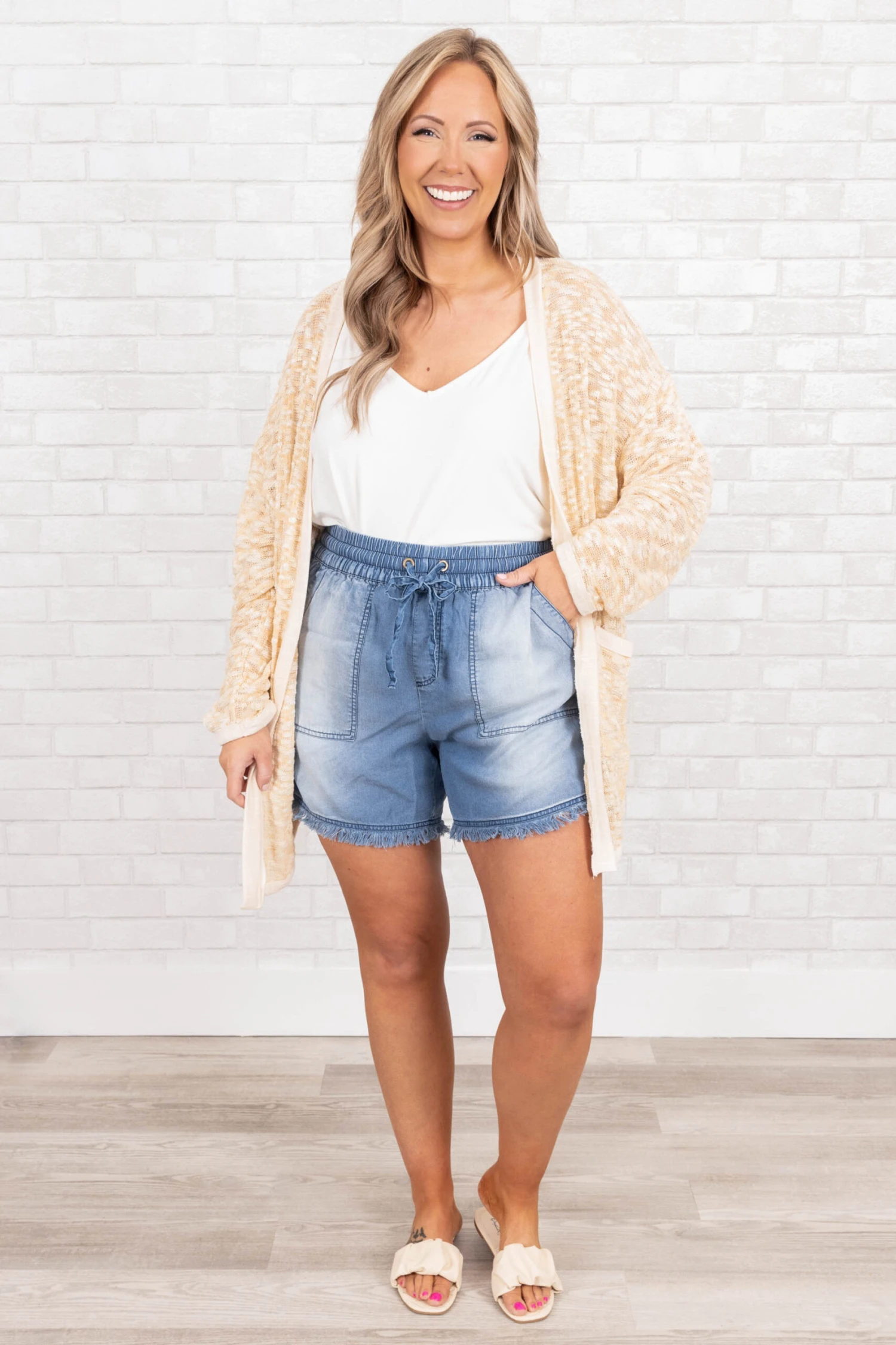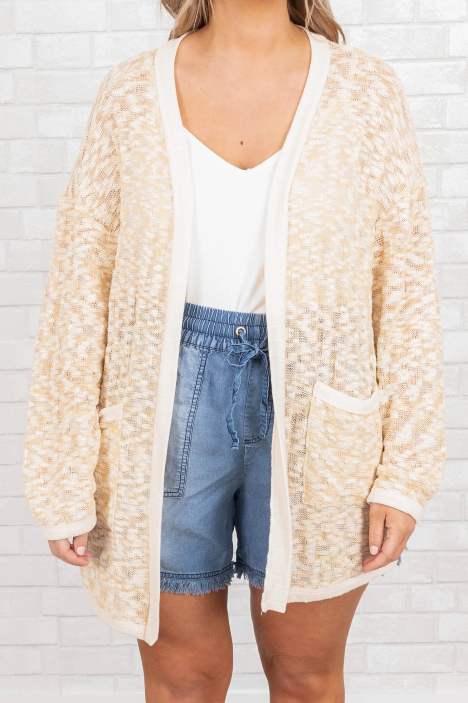 You couldn’t have dreamed of a cuter cardi! This cardigan has a beautiful mustard color with a knitted design that is perfect for layering over all of your favorite outfits throughout the season! Style this cardigan with a cute cami and shorts for a casual chic look!
