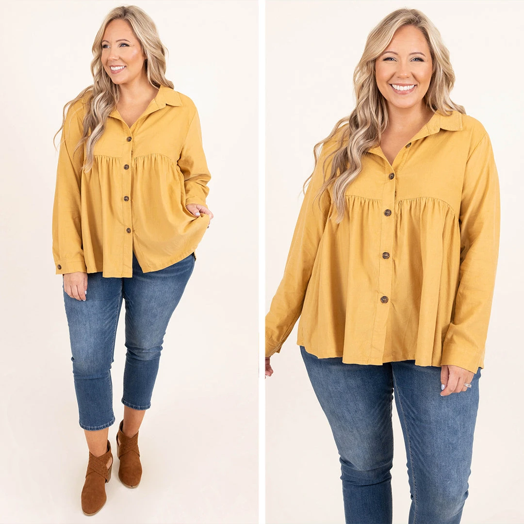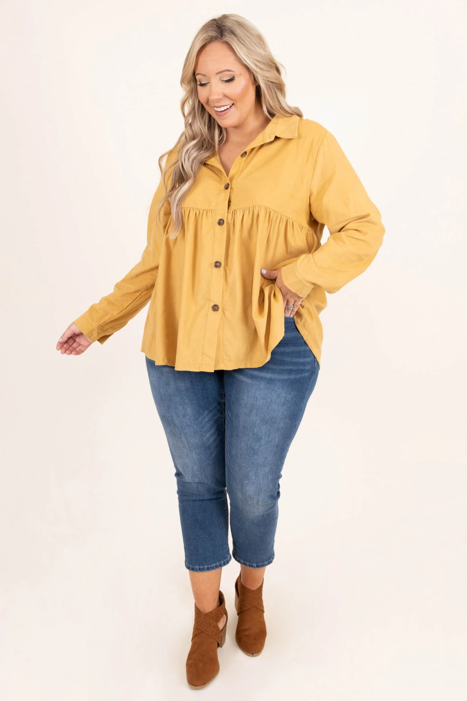 Go on a daytime adventure in this top! The bold mustard color and babydoll style is just in time for the season! Style this top with some skinnies and cute accessories for a trendy, classic look!Â
