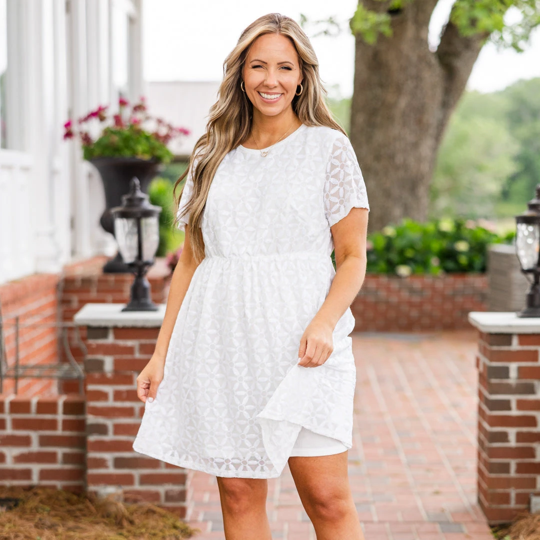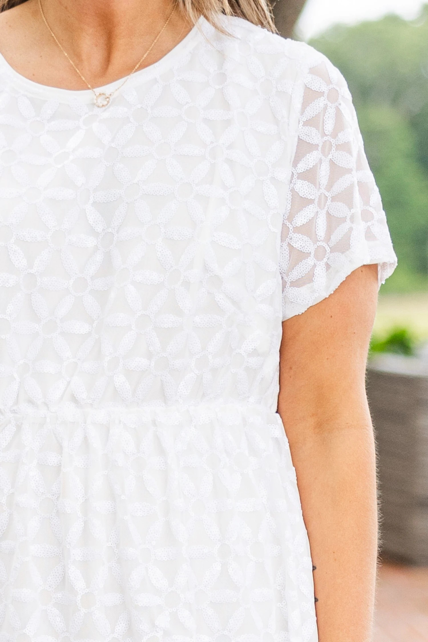Add some sparkle to your wardrobe with the Diamond Season Dress! The classic white dress features a touch of flower-shaped sequins and an elastic waistline, making it the perfect combination of elegance and comfort! Perfect for any season, this dress will have you shining in style!