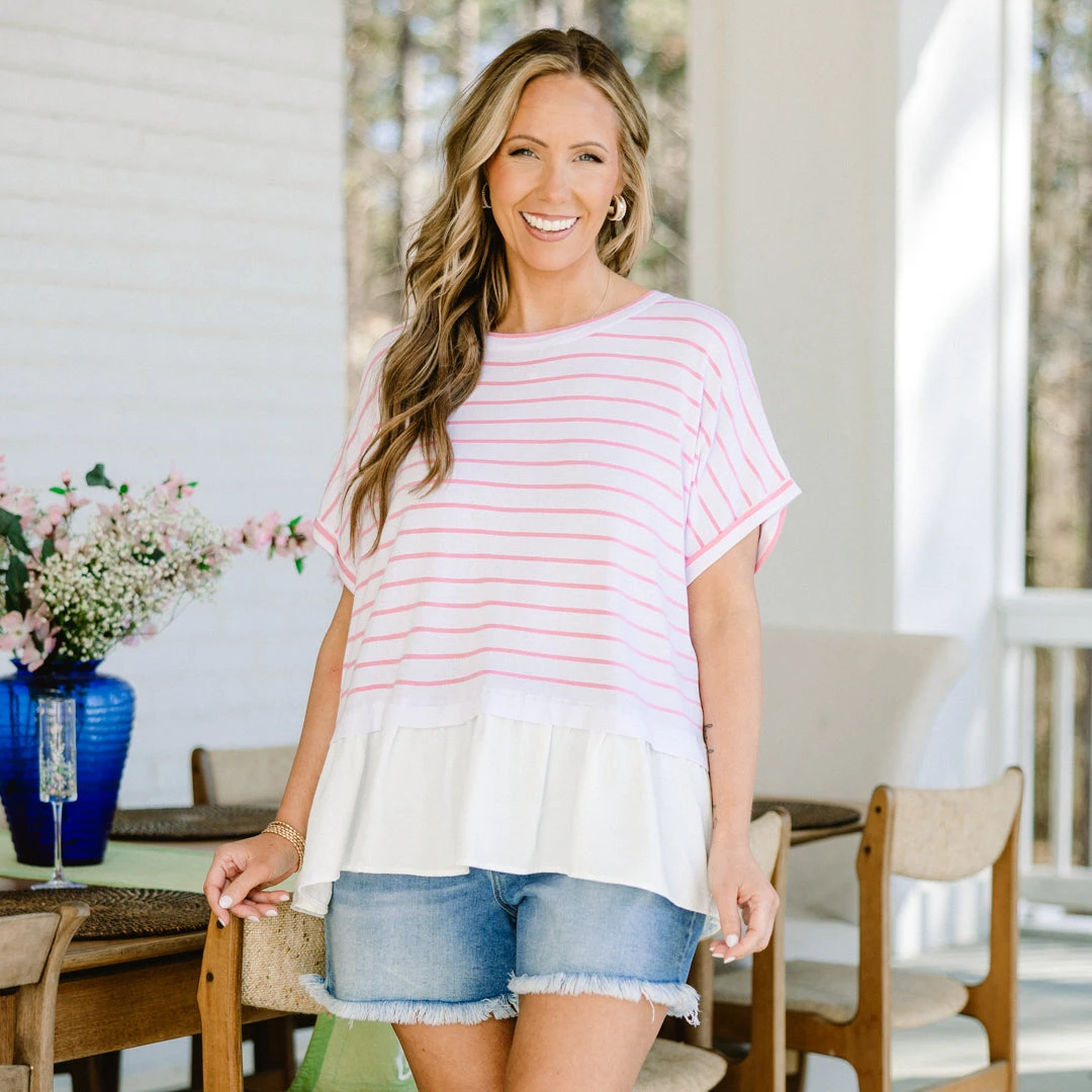 Exude elegance and grace in this top! This luxurious babydoll style top features pink stripes, adding a touch of sophistication to your wardrobe! A must-have for any fashion lover’s collection!