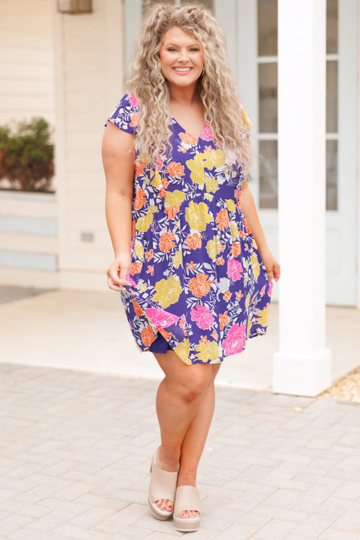 You’ll be the talk of the town in this beautiful dress! Its navy hue is printed with a delicate floral pattern, designed to flatter with a flowy, sassy fit and flutter sleeves! A feminine and timeless piece, this dress will become your go-to special occasion look!