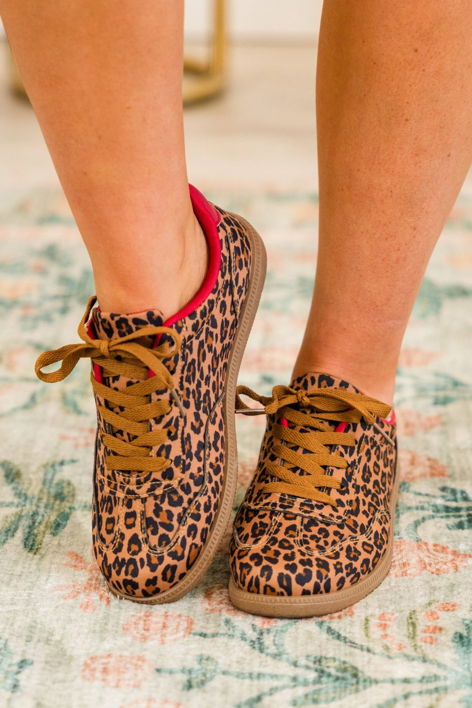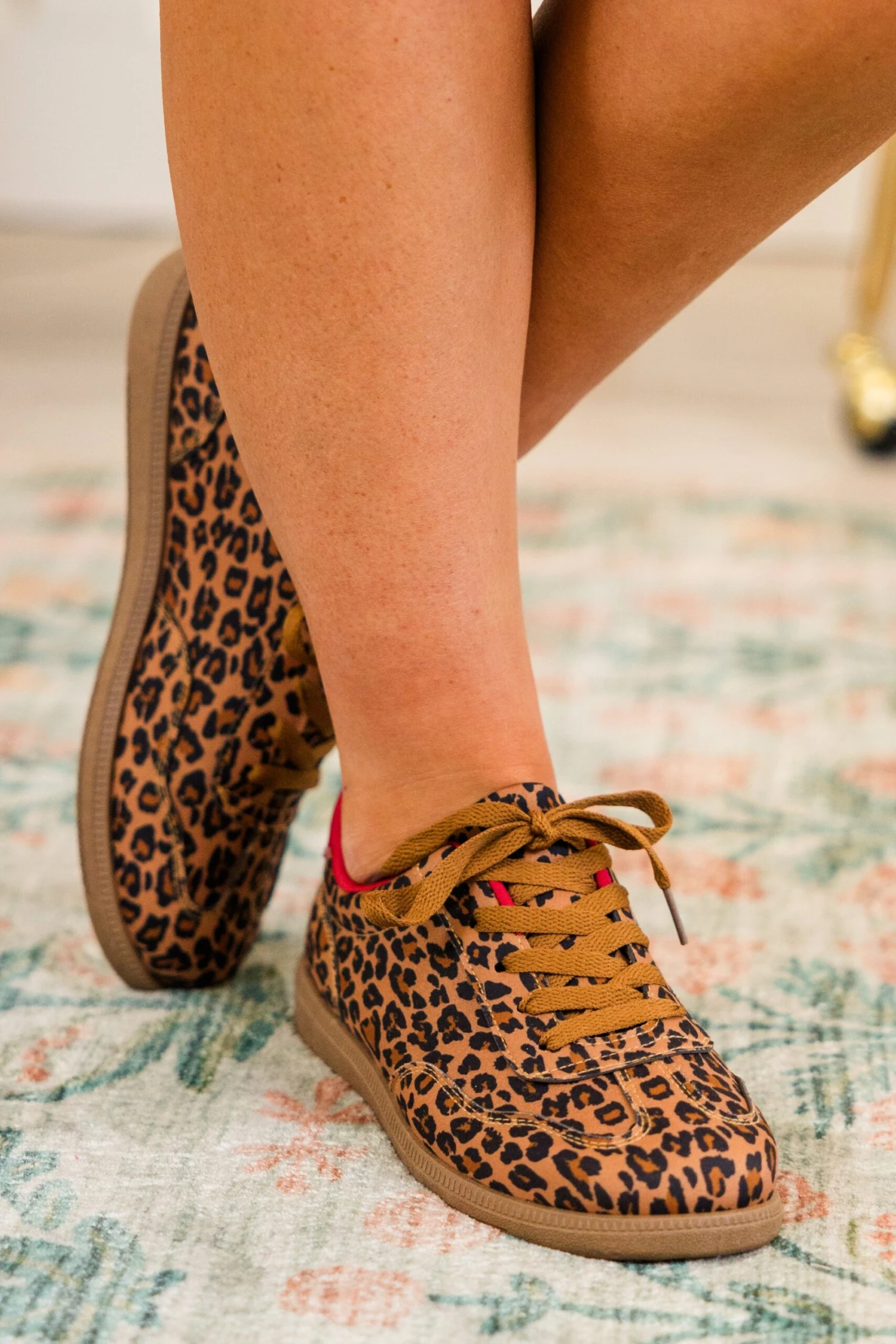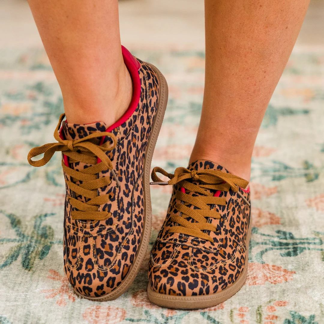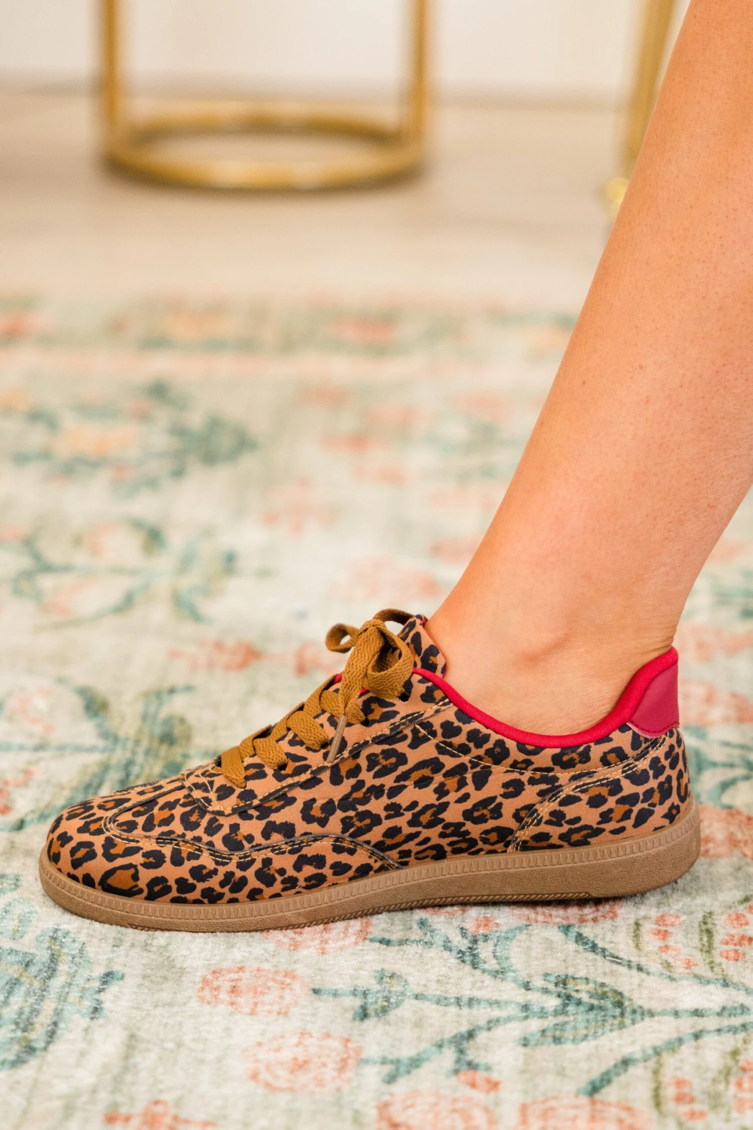 Unleash your wild side with our Effortless Edge Sneakers in a bold brown leopard print! These statement-making shoes feature a brown gum sole and matching laces with a fun pop of red on the inside! Stride in style and comfort with these playful kicks!