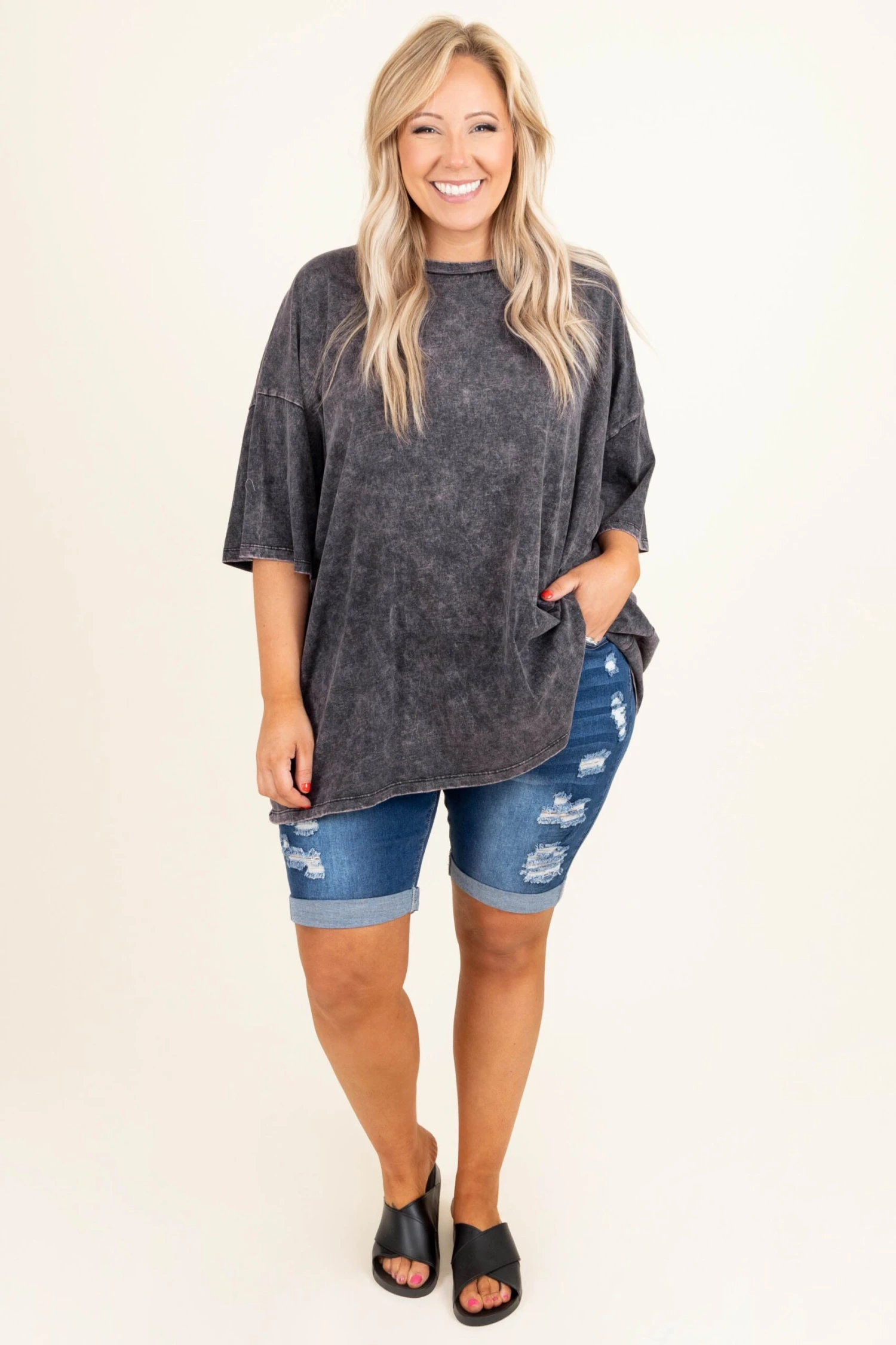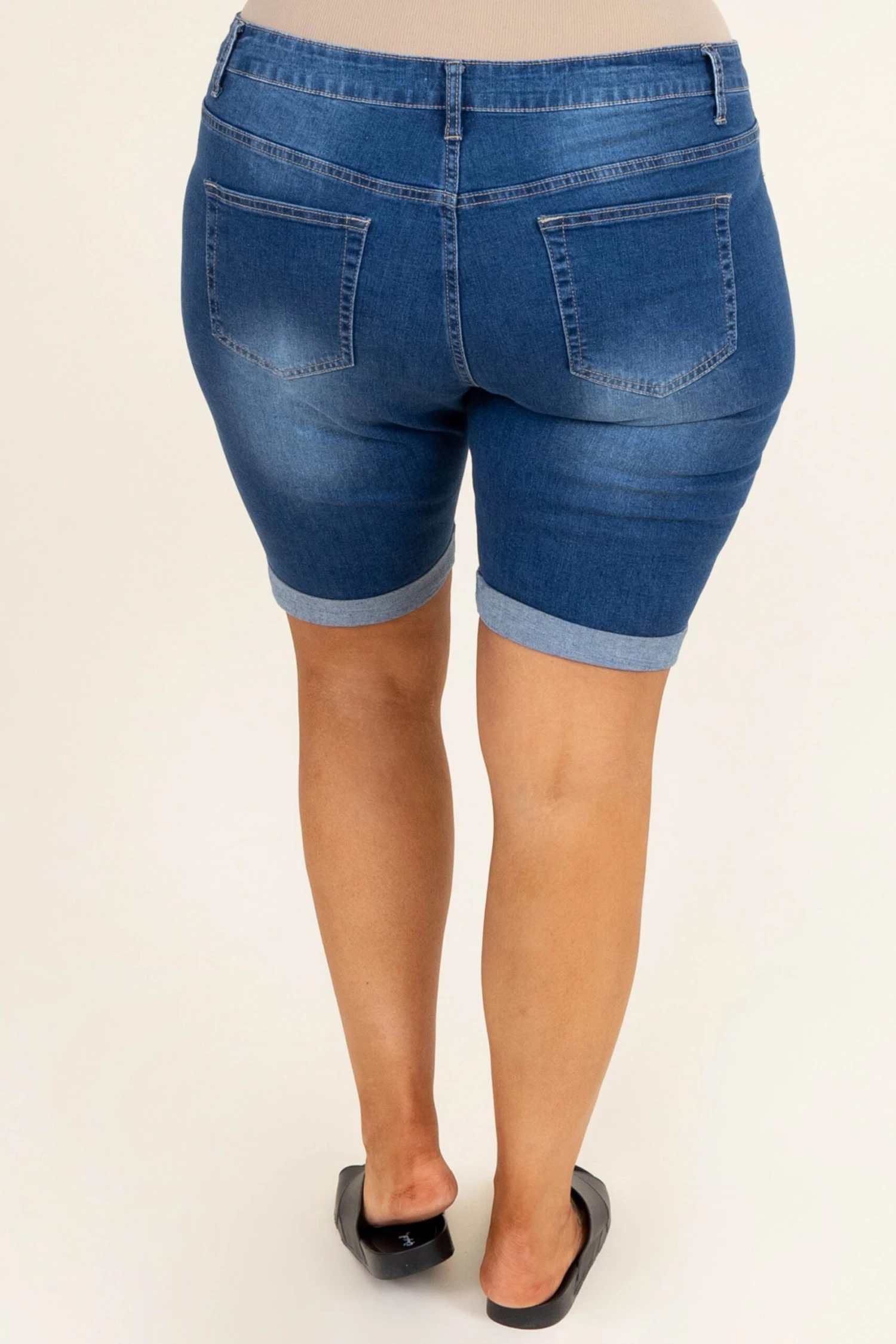 Embrace the sunlight in these shorts! These have a Bermuda length so you can feel secure and the dark wash color is so easy to match with anything in your closet! The light distressing on these is so trendy simply style them with a cute tee and some sandals for an easy everyday look!